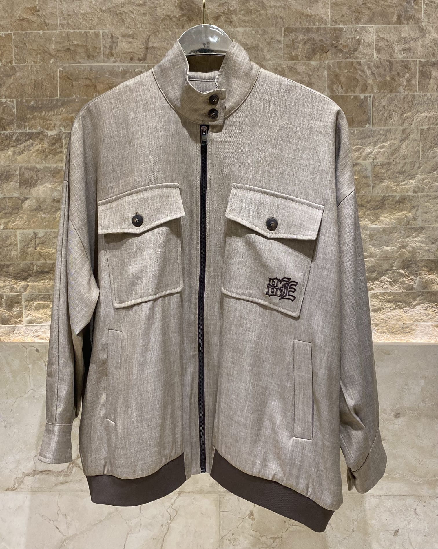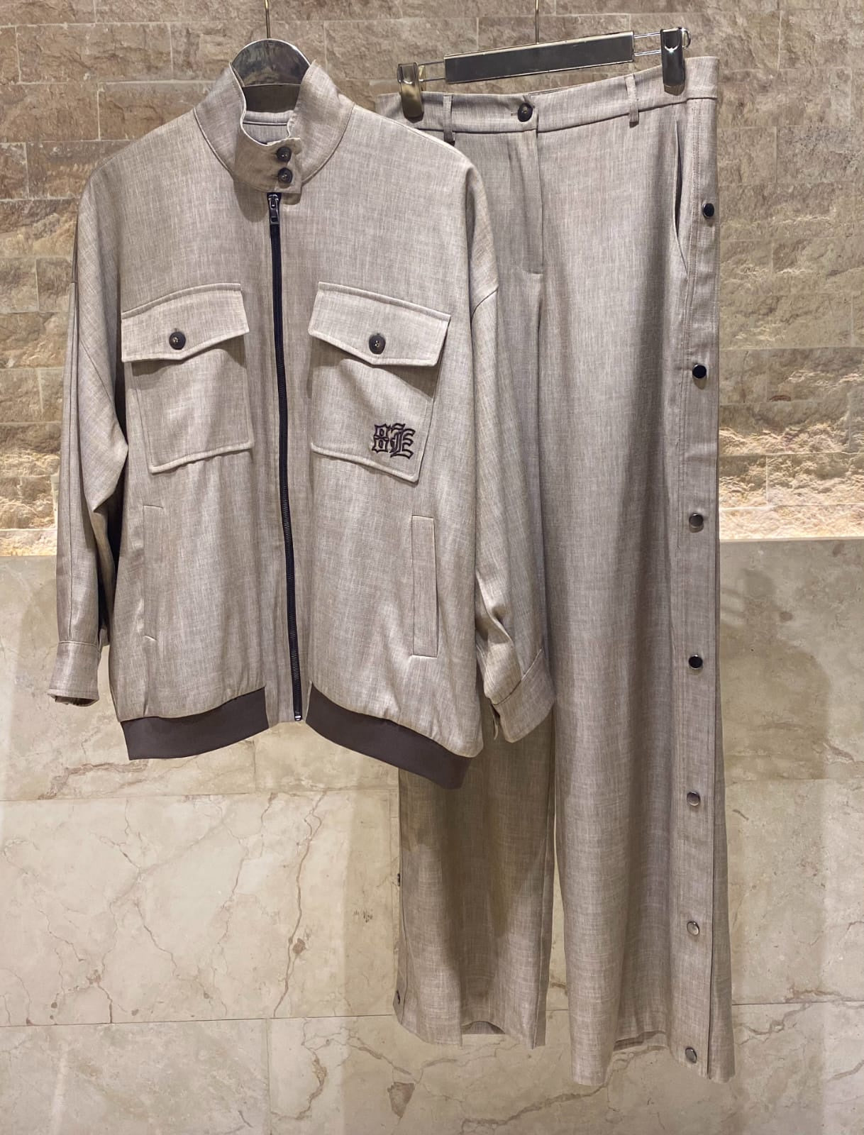 Zippered High Neck with Buttons Oversized Jacket with side pockets, front flap pockets with embroidered details, elastic hem, drop shoulder and long sleeve with buttoned cuff. Zippered Buttoned High Waist Wide Leg Pants with side pockets, side slit with snap buttoned and back patch pockets