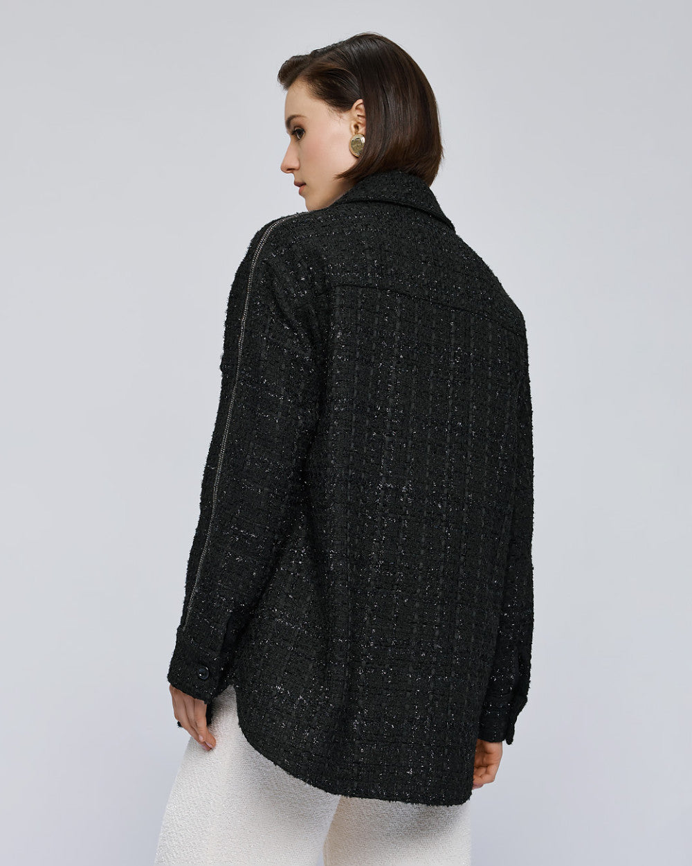 Buttoned Collared Tweed Lurex Long Jacket with rhinestone trim sleeve details, front flap pockets and long sleeve with buttoned cuff details