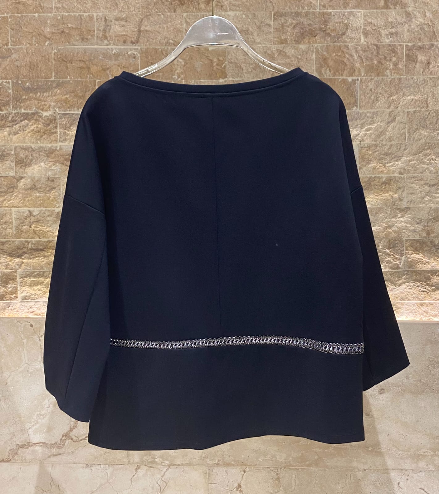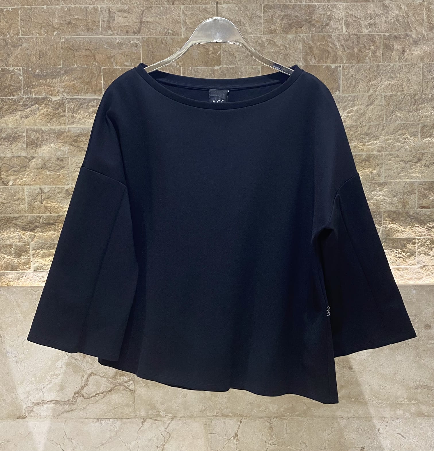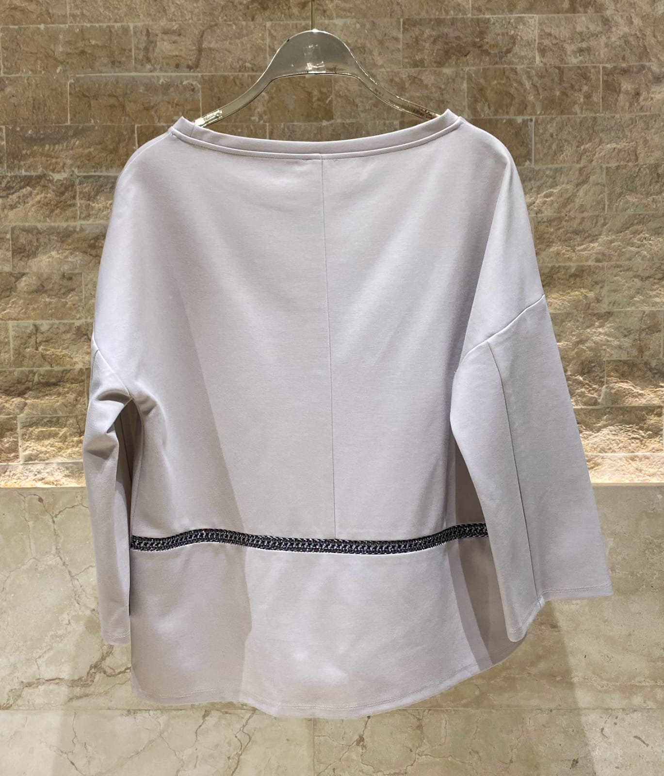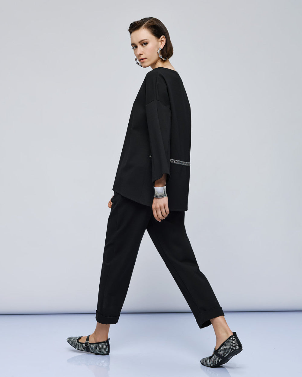 Boat Neckline Relaxed Fit Asymmetric Top with decorative seams, drop shoulder, rhinestone trim back details and long bell sleeve. Elastic Waistband Regular Fit Pants with side pockets, turn up hems and decorative welt back pockets