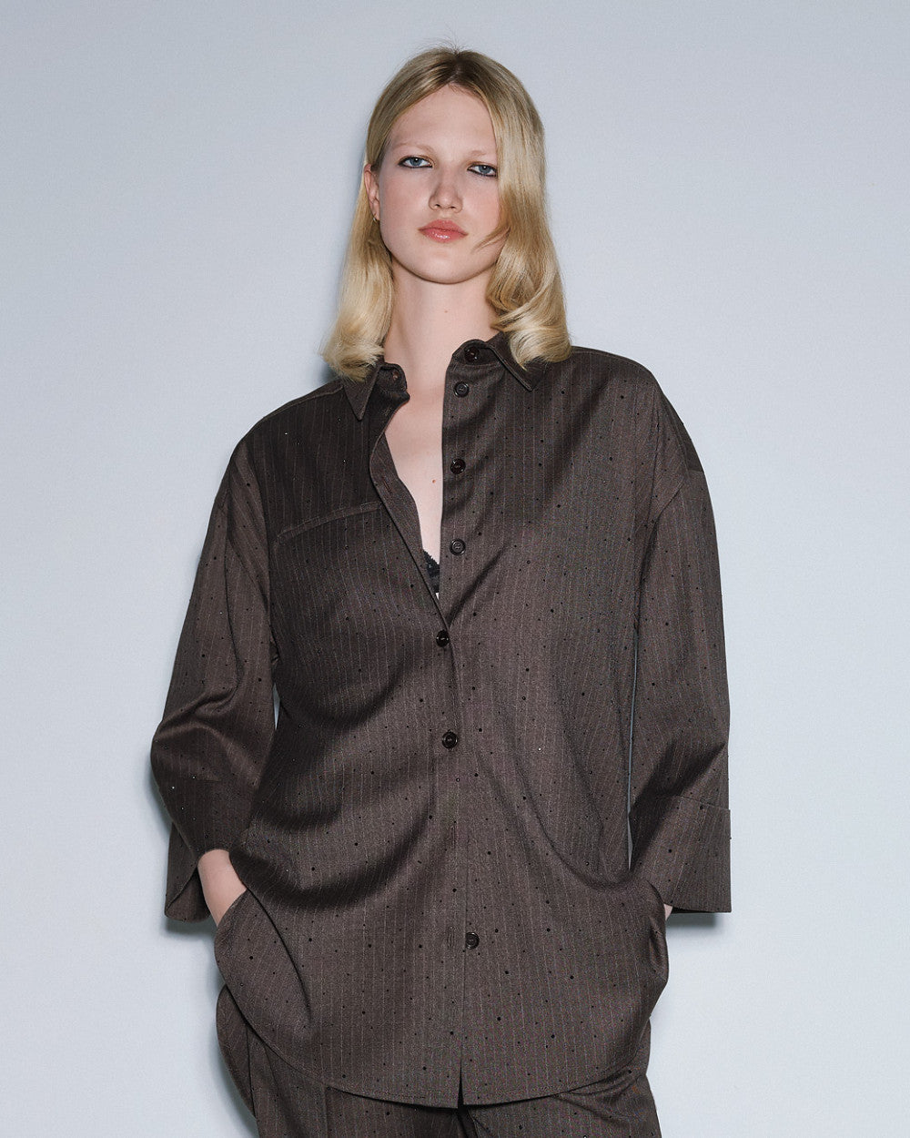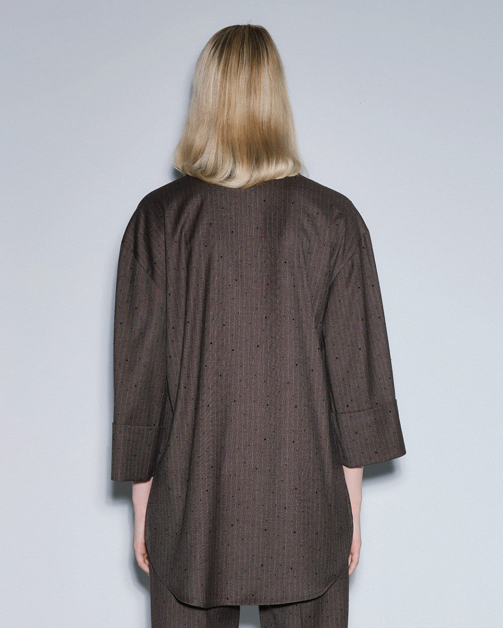 Buttoned Collared Oversized Long Back Striped Shirt with rhinestones details, front welts pocket, curved hem and long wide sleeve with wide cuffs
