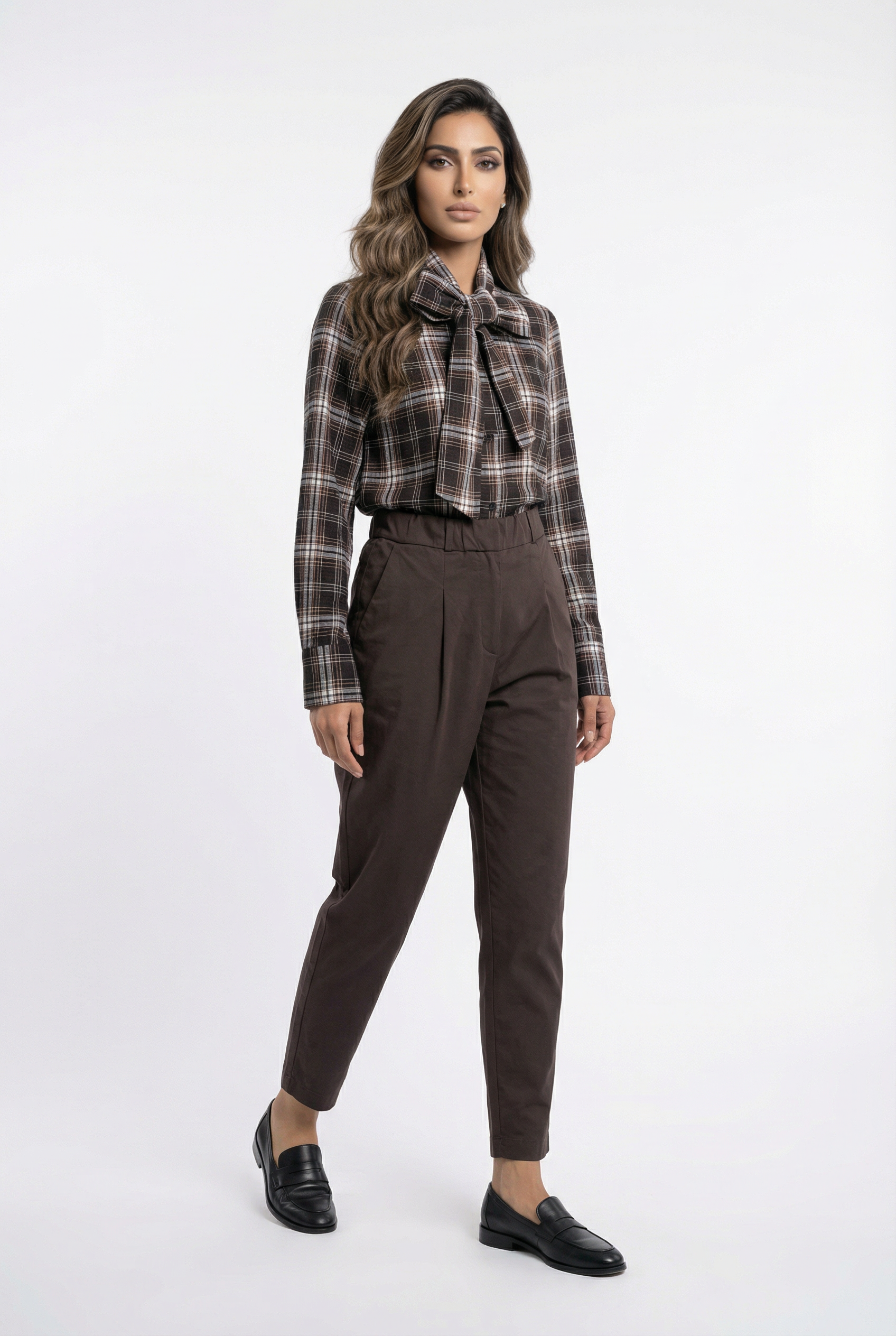 Buttoned Round Neck Checkered Top with neck tie details and long sleeve with buttoned cuff