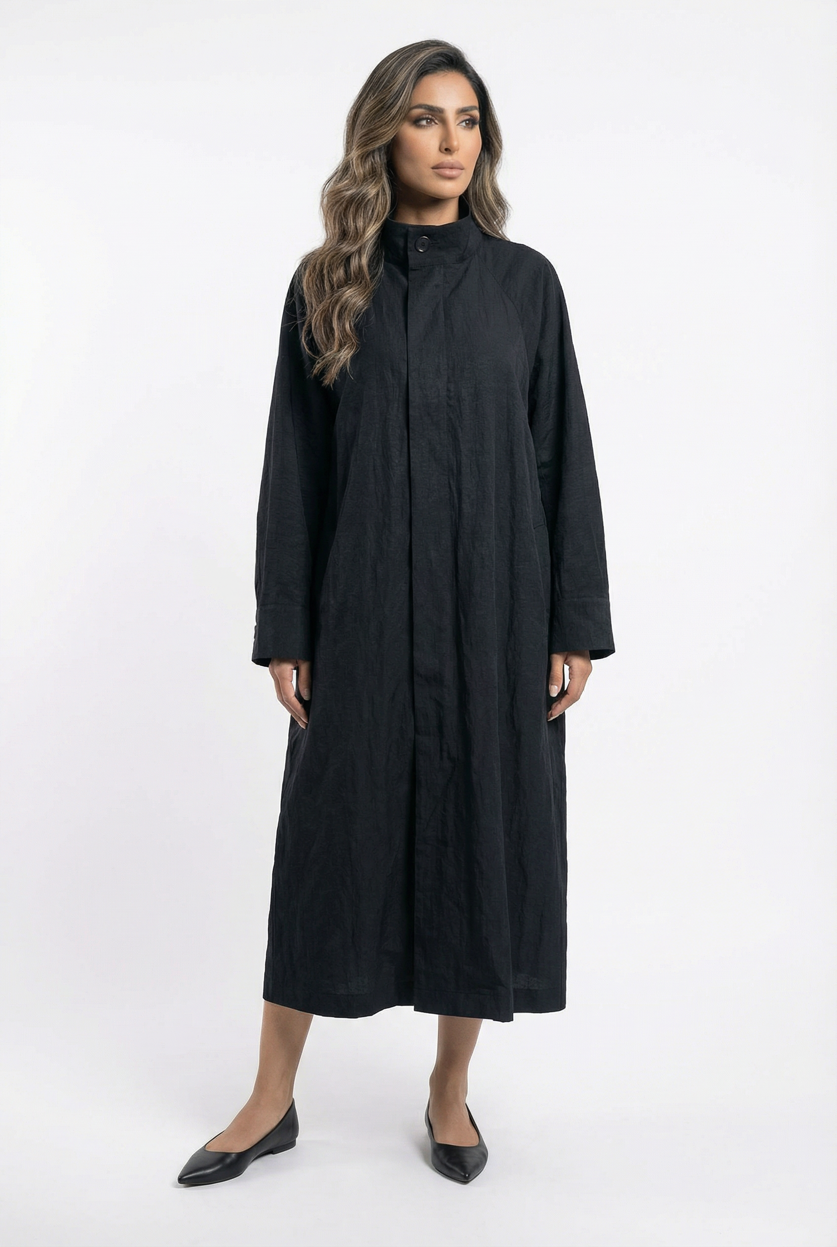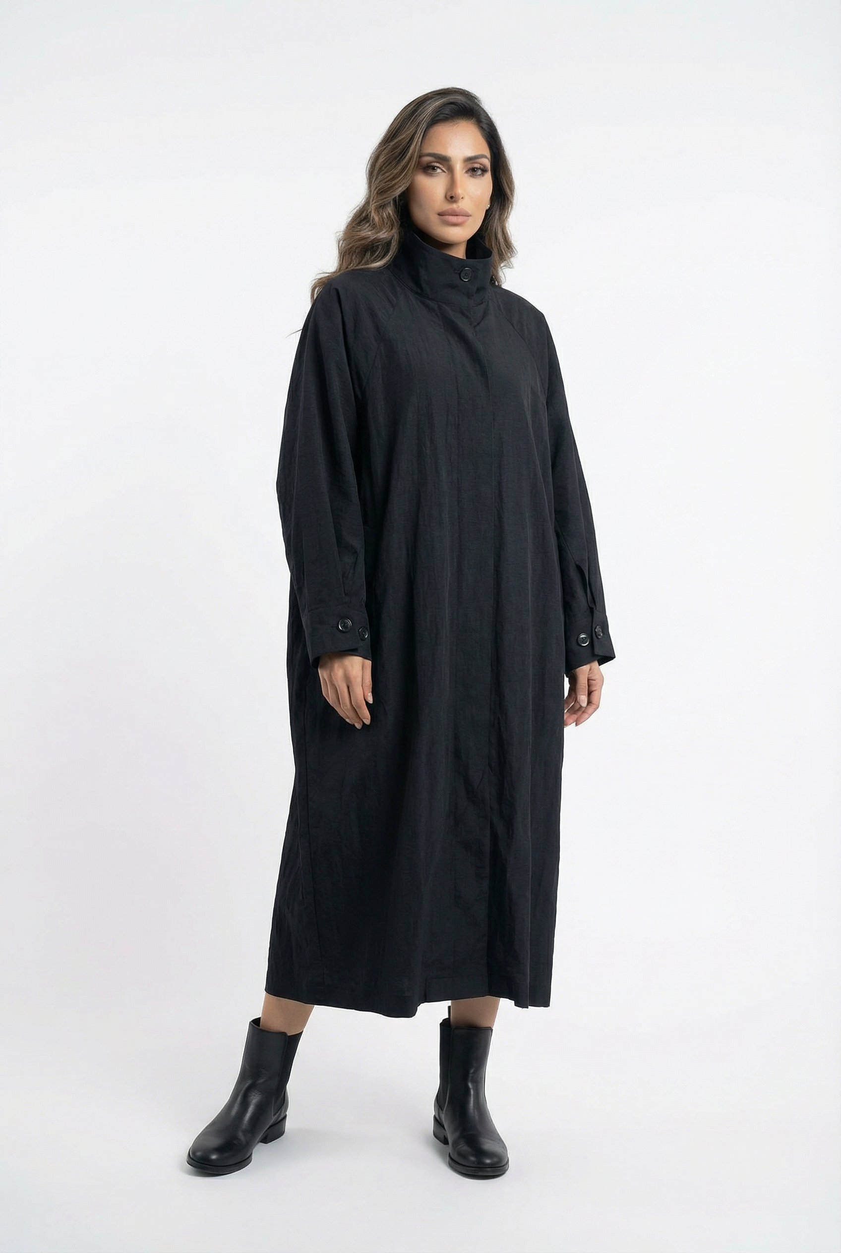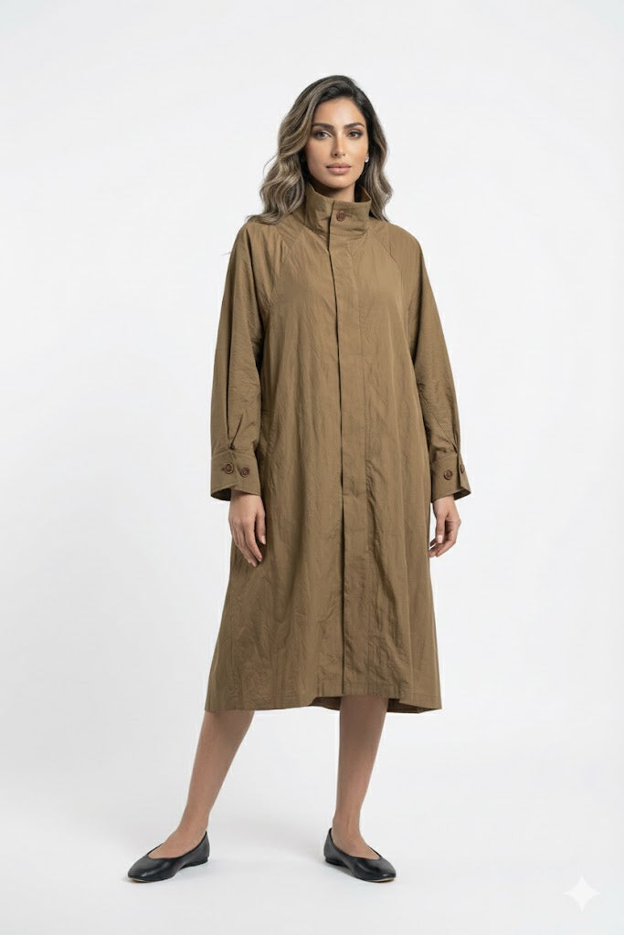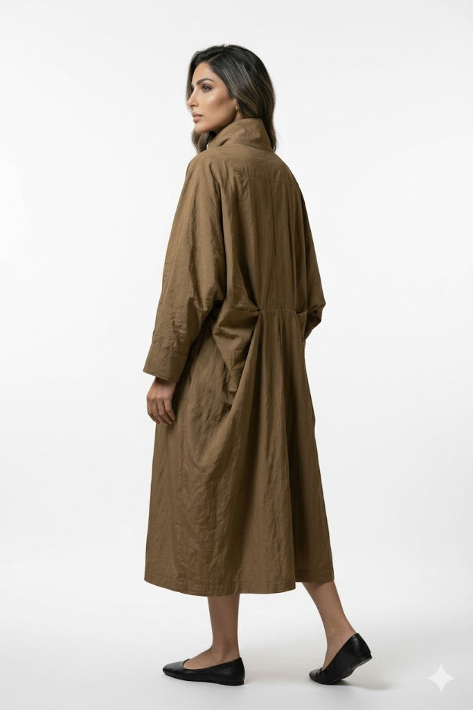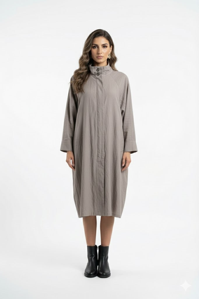High Neck Buttoned Placket Zippered Oversized Dress Coat with side pockets and wide long sleeve with buttoned cuff and back pleats detailed