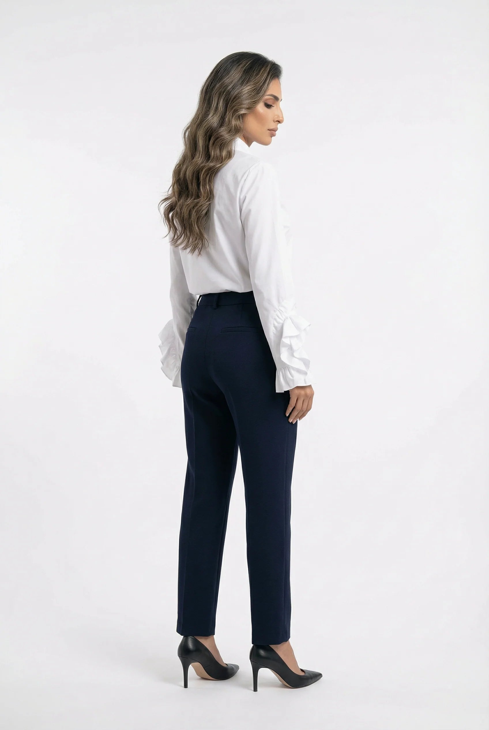 Classic Collared Long Back Shirt with a structured silhouette, front closure with metallic gold buttons. Long sleeves finished with oversized gathered ruffles that add volume. Straight hem. The fabric is crisp and opaque, offering a clean and defined shape