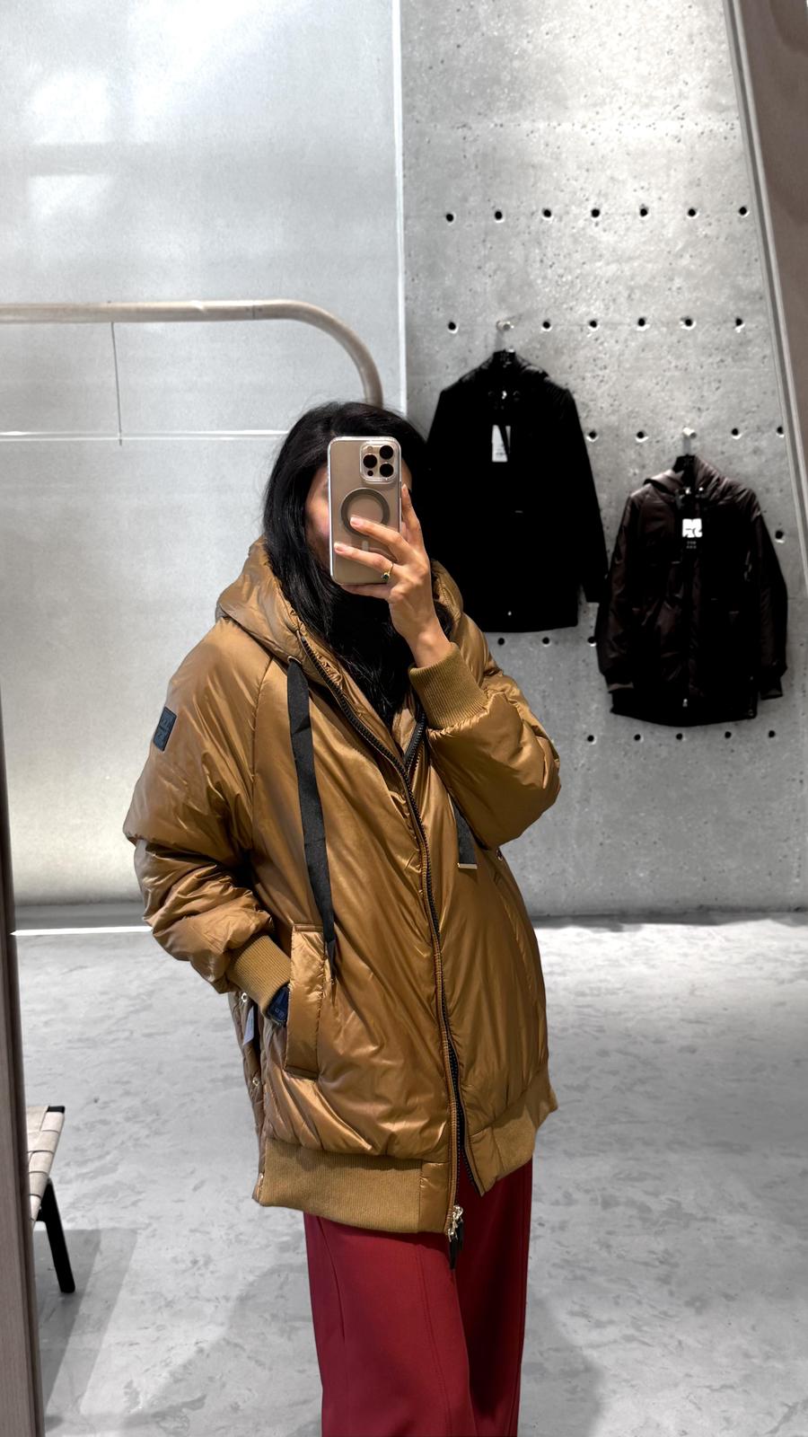 Zippered Hoodie Puffer Long Jacket with adjustable drawstring hood details, side pockets, side snap buttoned slit, ribbe elastic hem and long puffed sleeve with ribbed cuff
