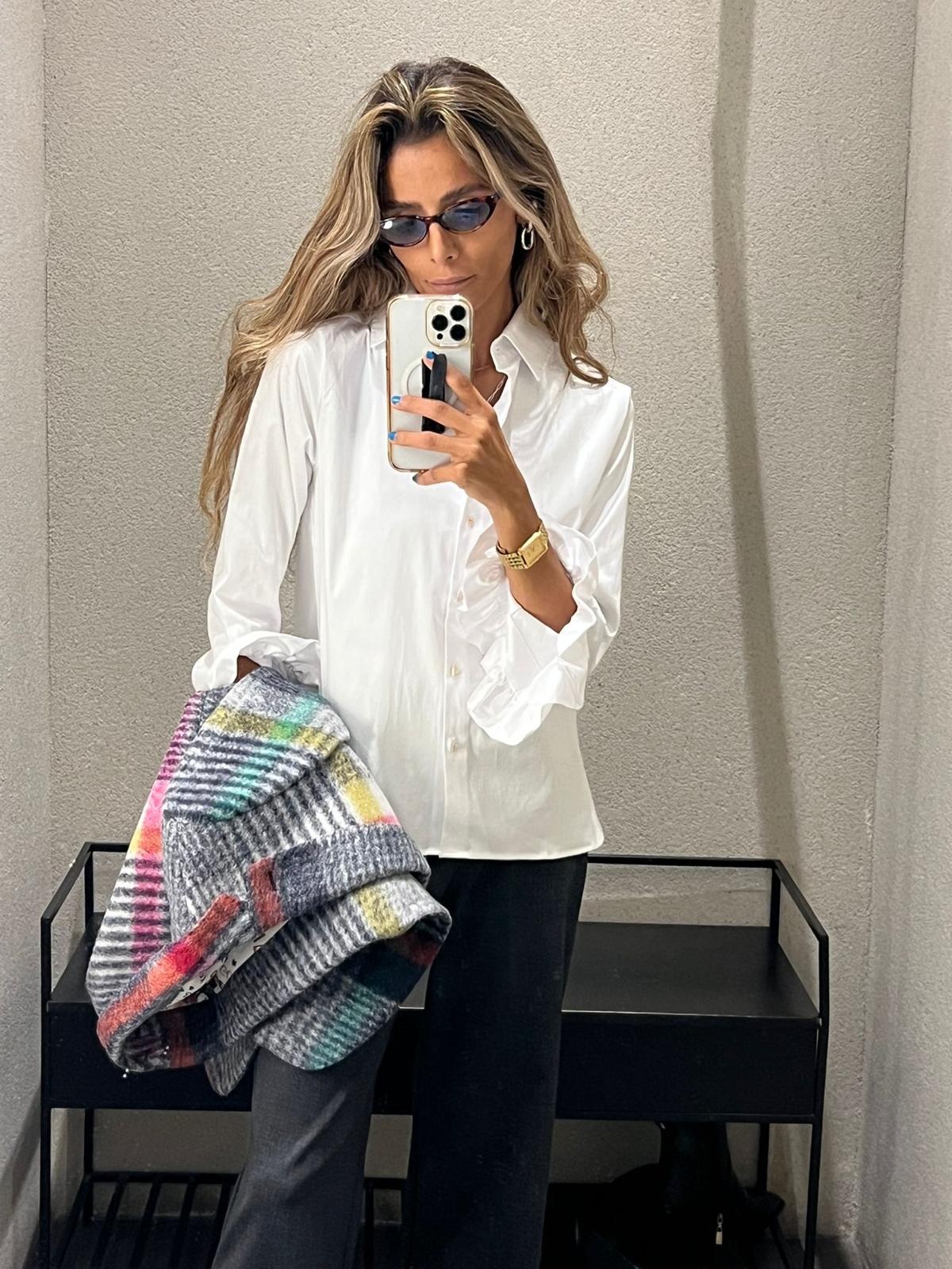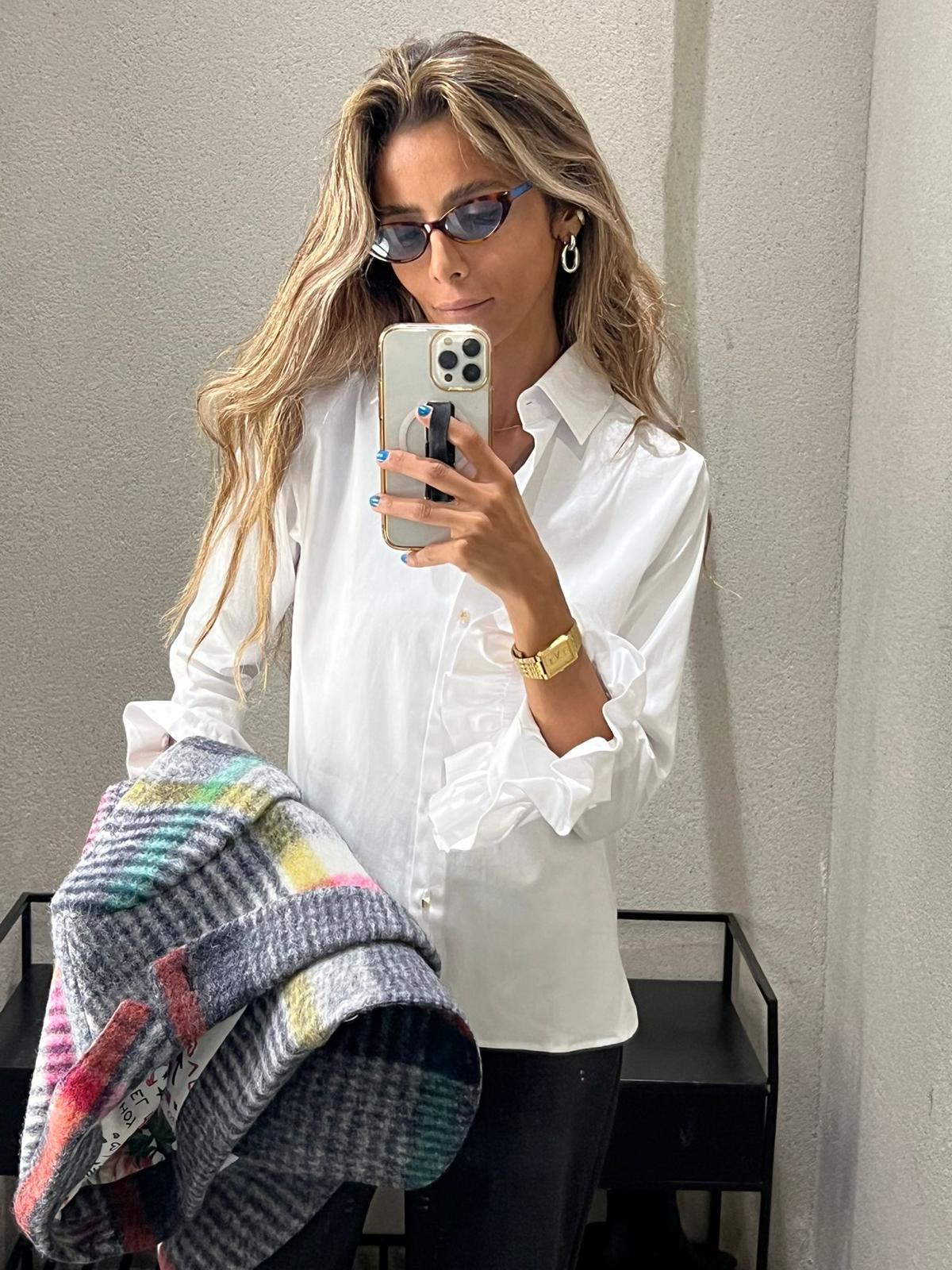 Classic Collared Long Back Shirt with a structured silhouette, front closure with metallic gold buttons. Long sleeves finished with oversized gathered ruffles that add volume. Straight hem. The fabric is crisp and opaque, offering a clean and defined shape