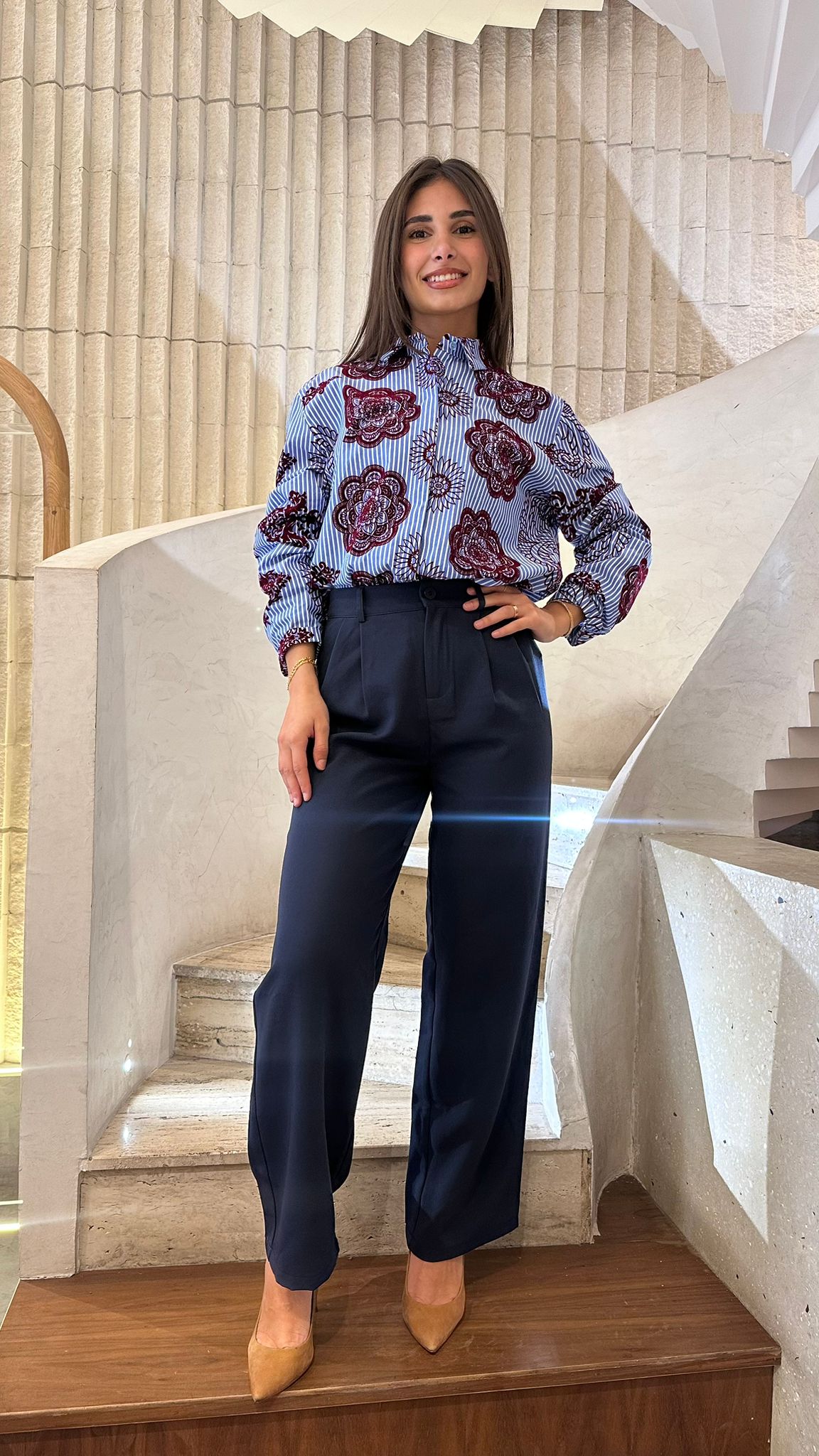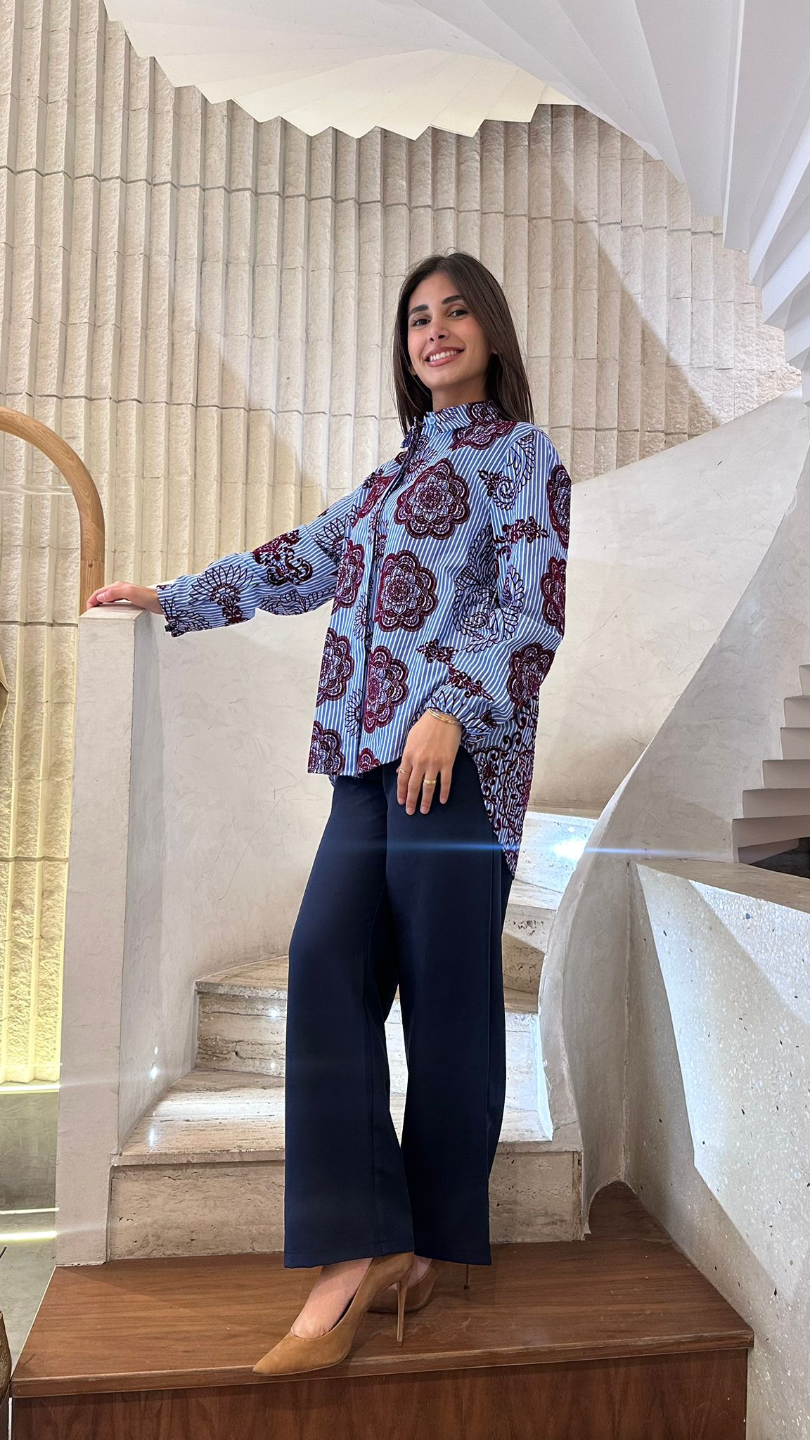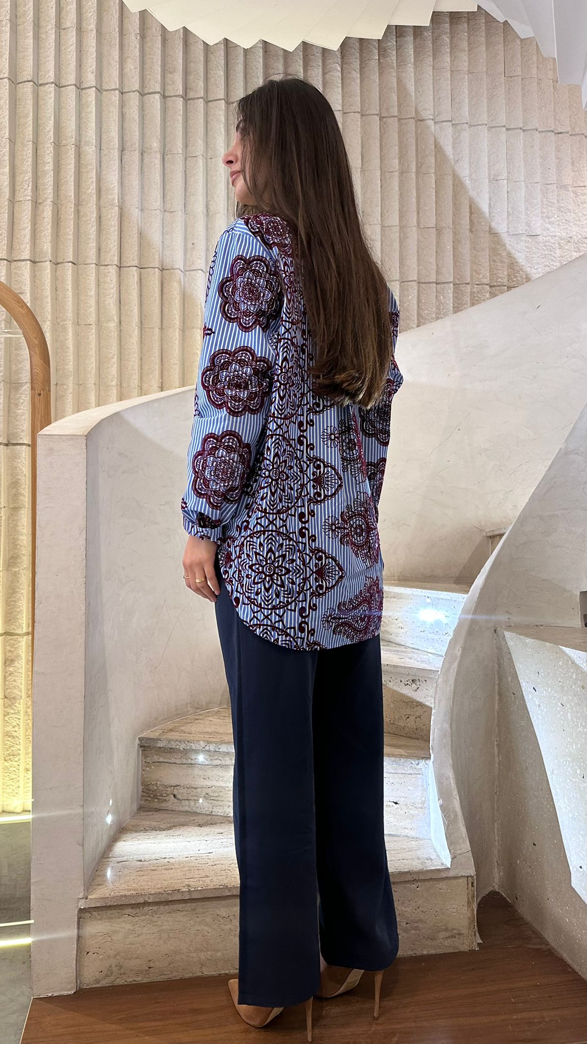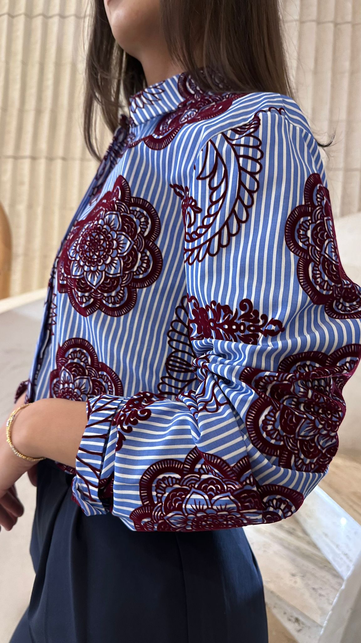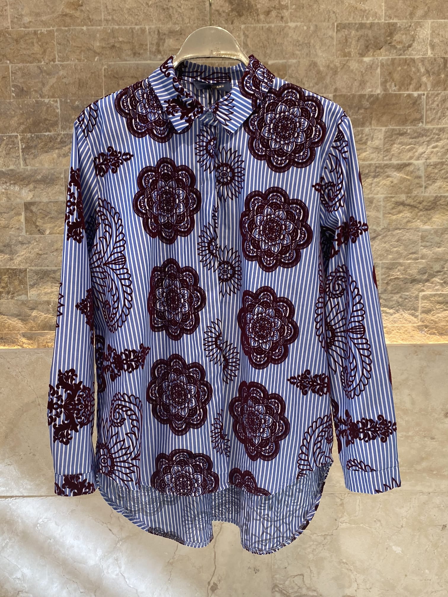 Placket Buttoned Collared Stripe Long Back Shirt with flocked embossed detail and long sleeve with buttoned cuff