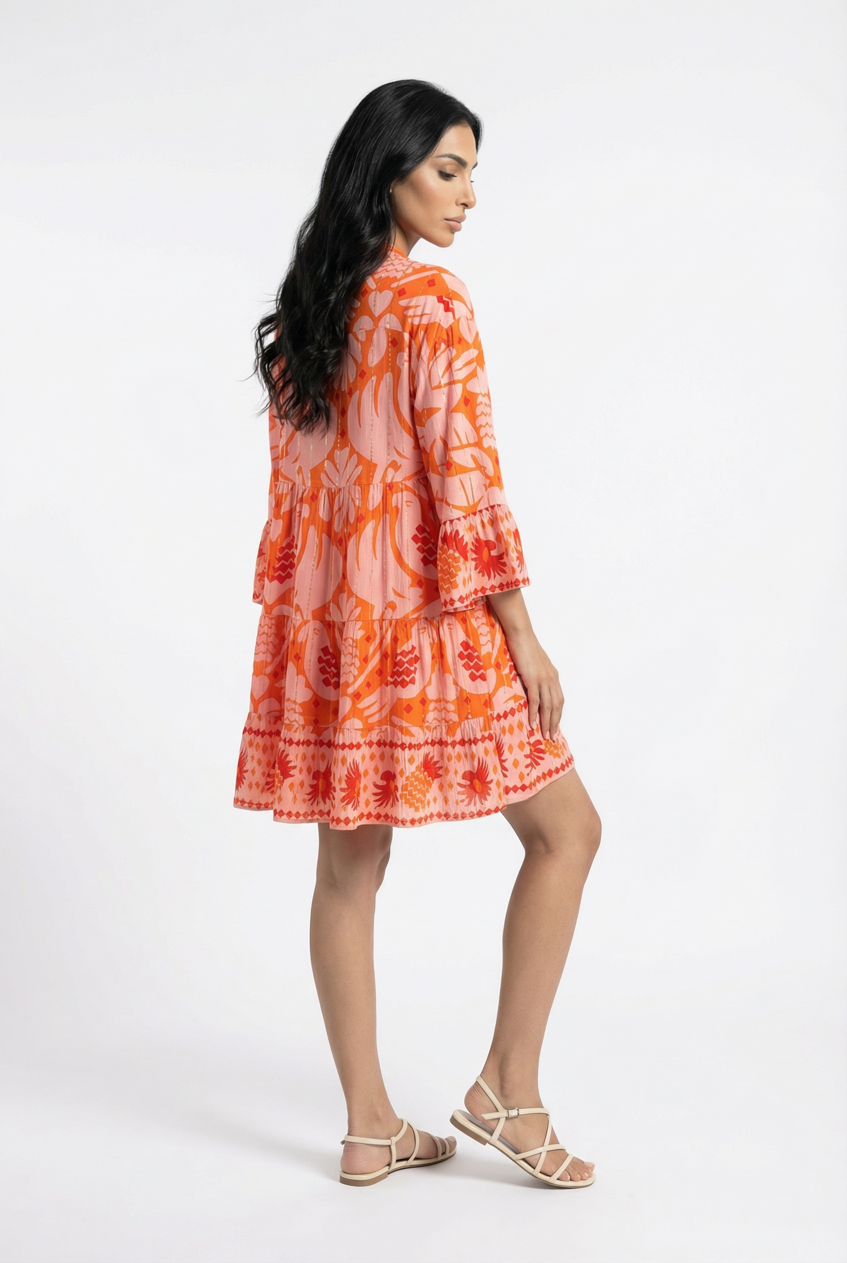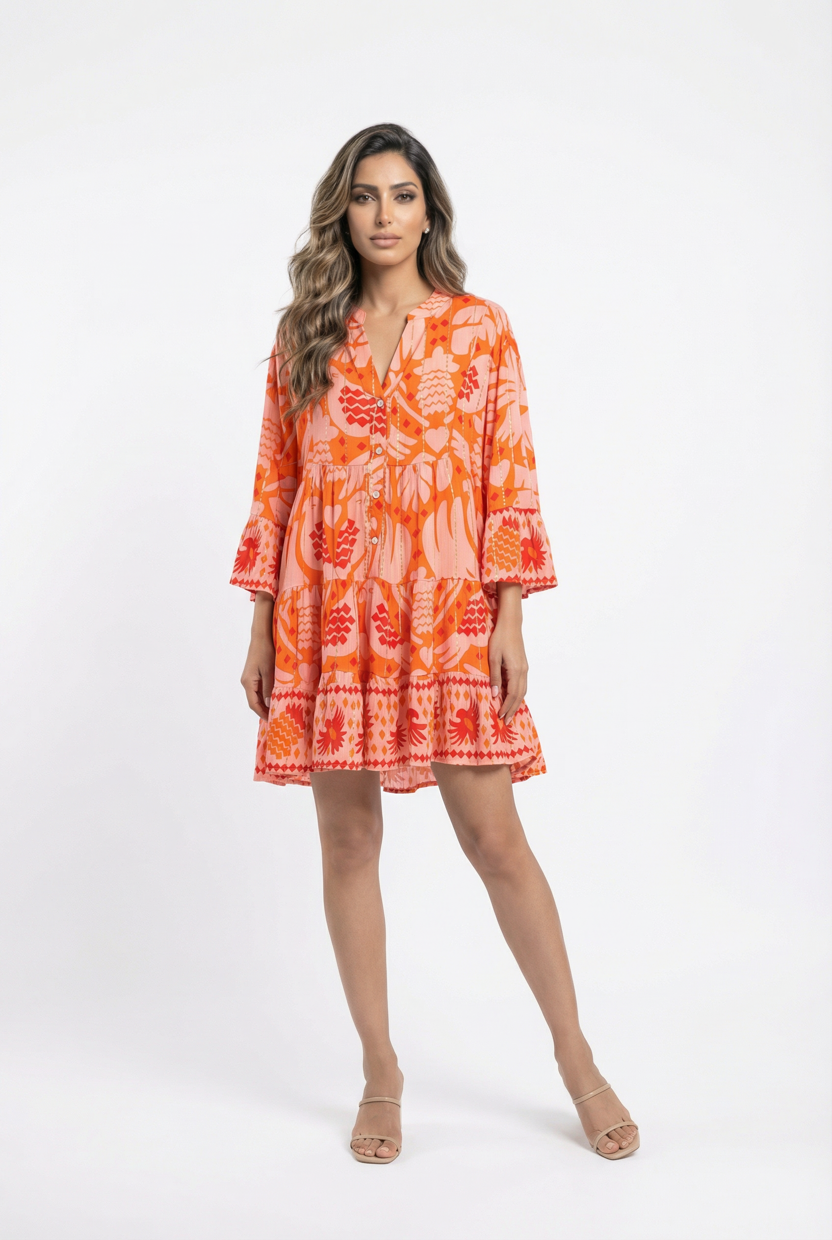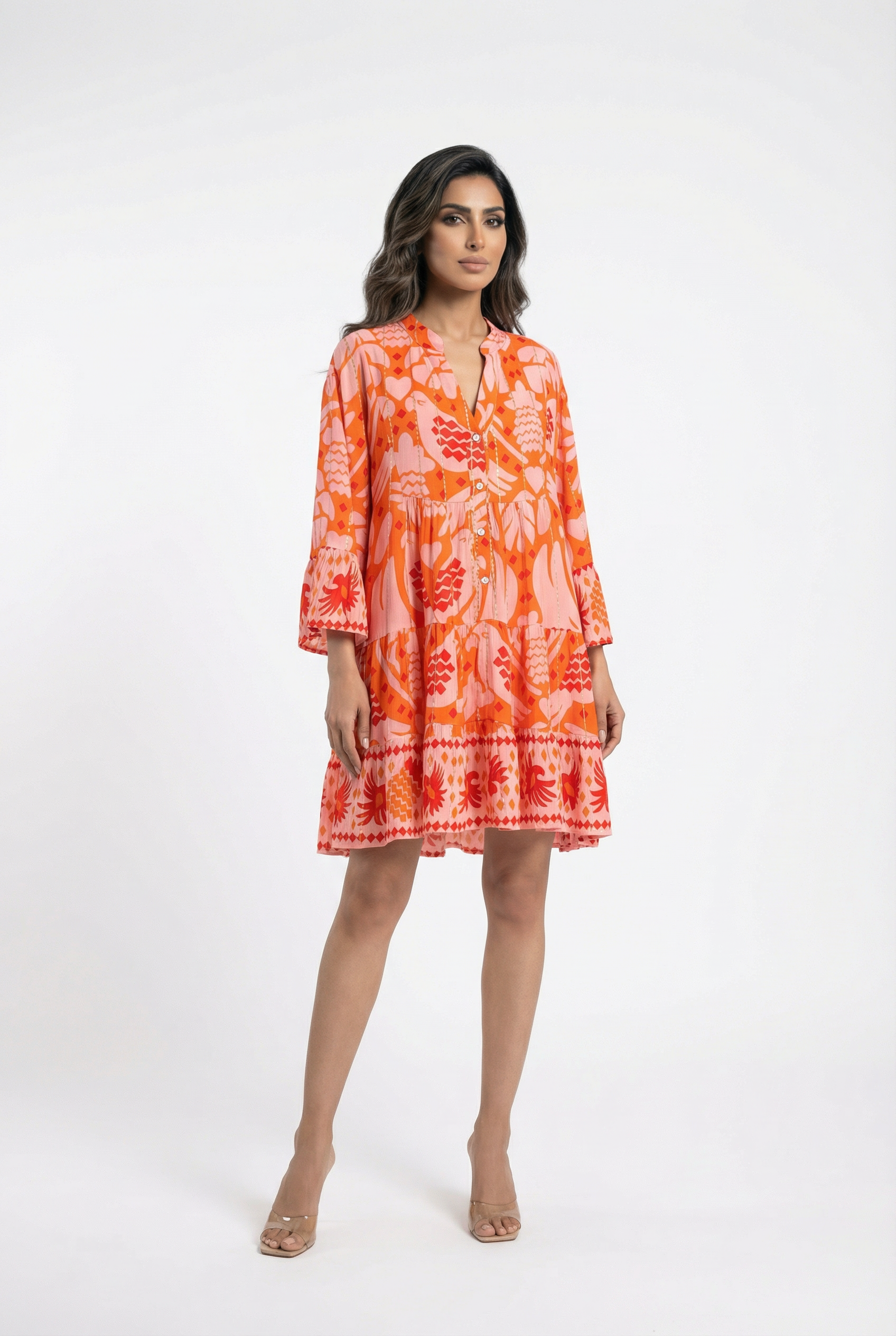 V Round Neck Half Buttoned Printed Flowy Tiered Short Dress with 3/4 bell sleeve