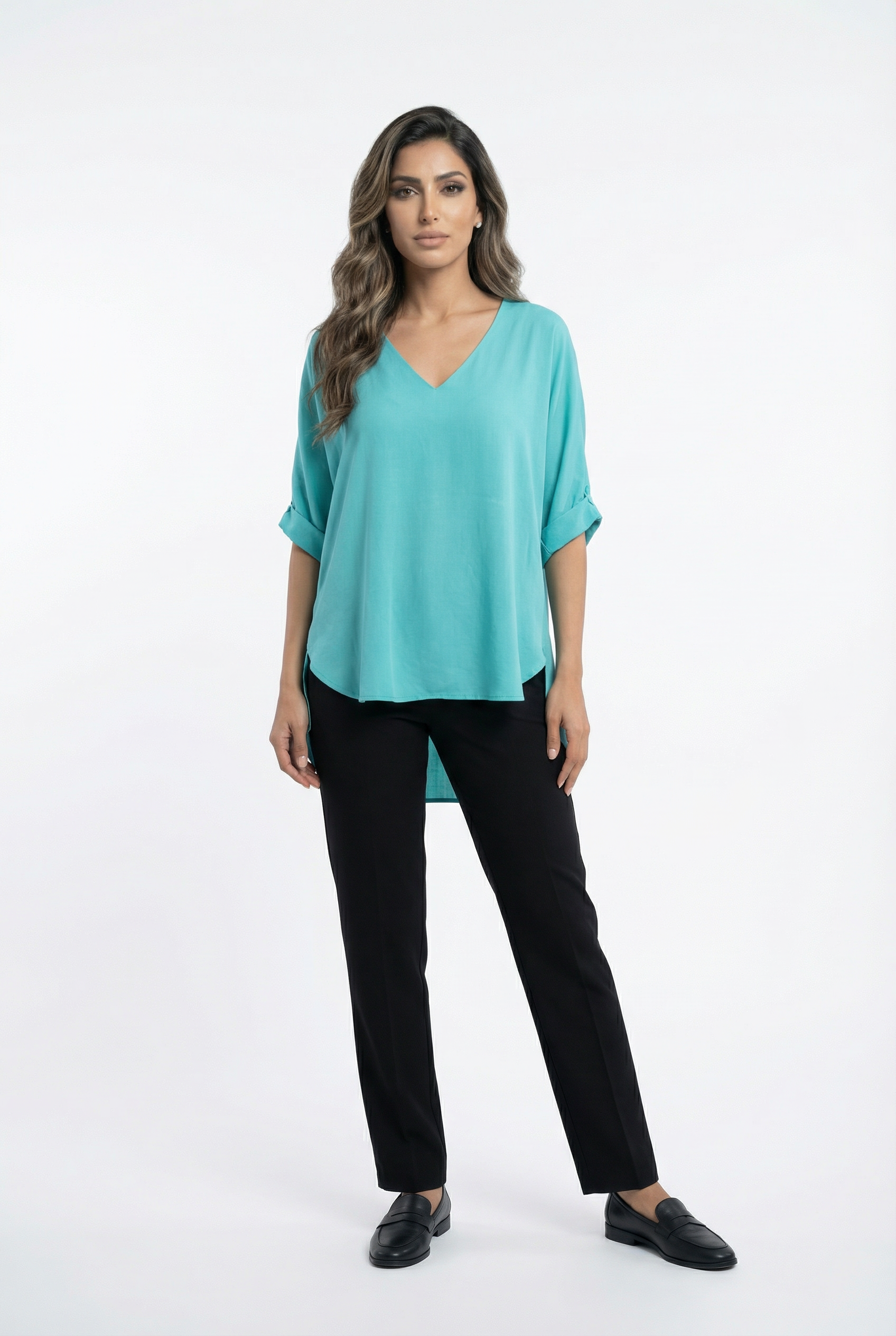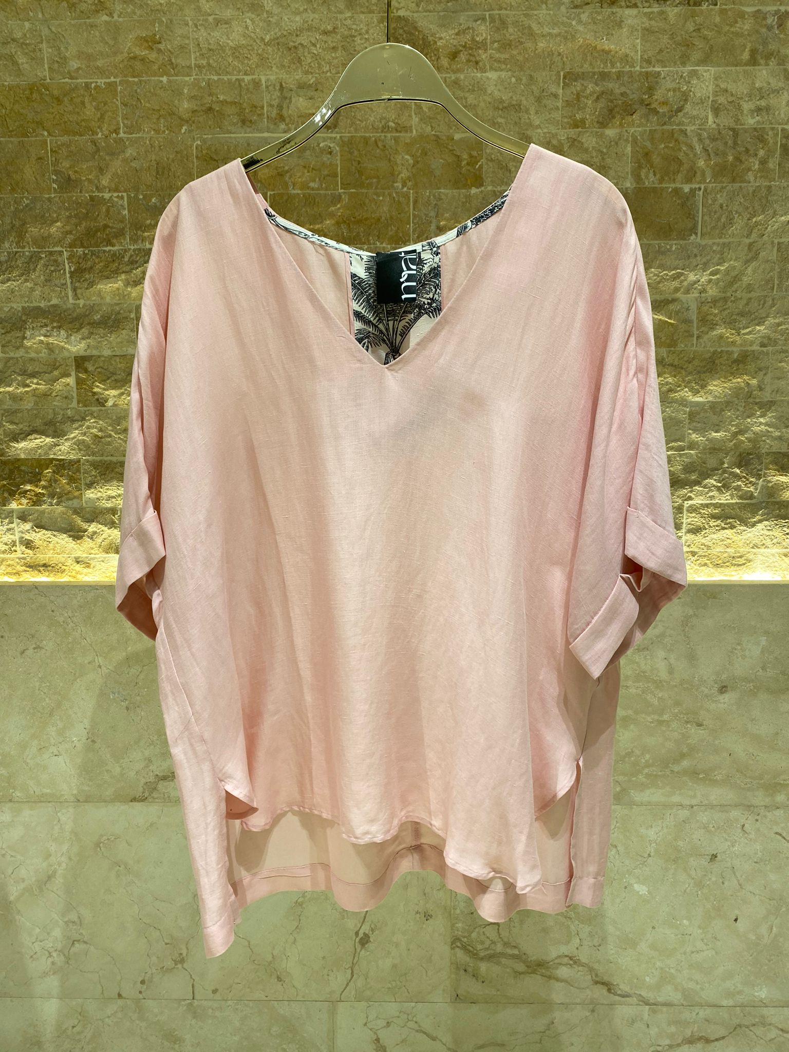 Scoop Neckline Oversized Linen Top with curved front hem, square back hem and short roll up sleeve