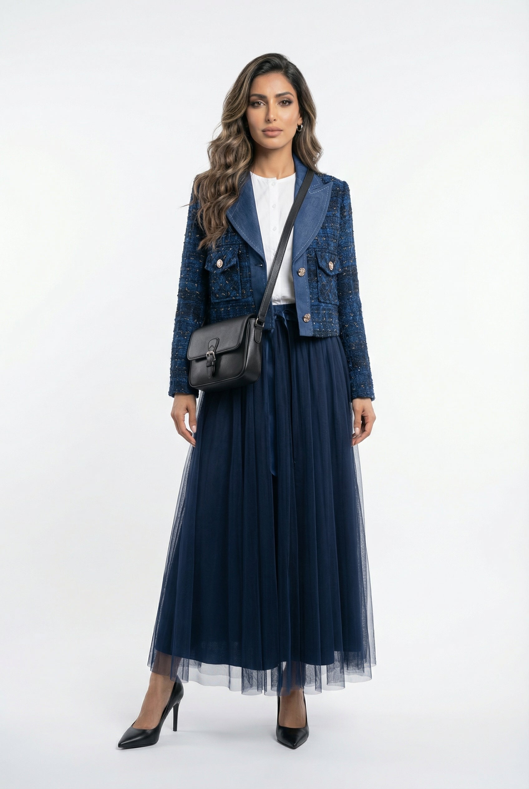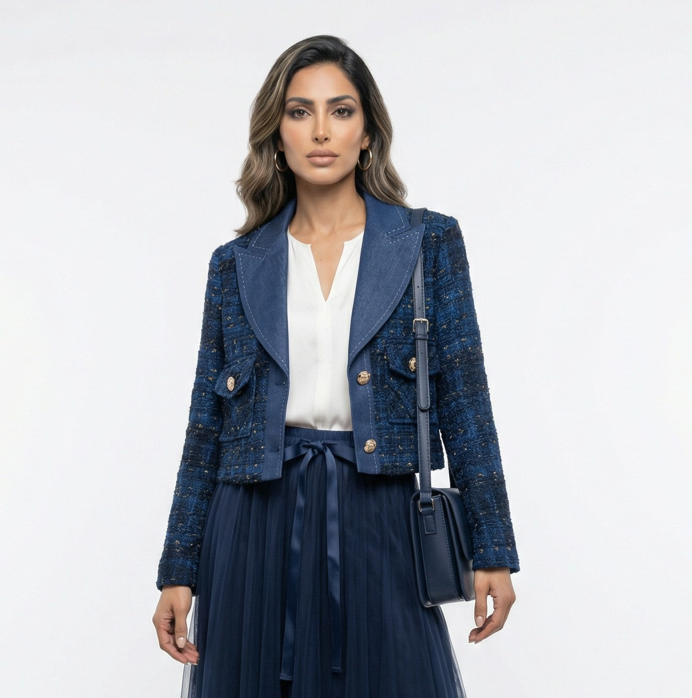 Denim Notched Lapel Collared Buttoned Cropped Tweed Jacket with lurex thread shimmers effect, flap buttoned pockets, padded shoulder and long sleeve