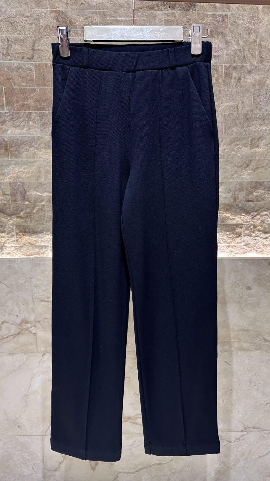 Elastic Waistband Mid Rise Waist Structured Straight Leg Pants made of stretch knit fabric, ankle length finished, belt loops, concealed front fastening and side pockets