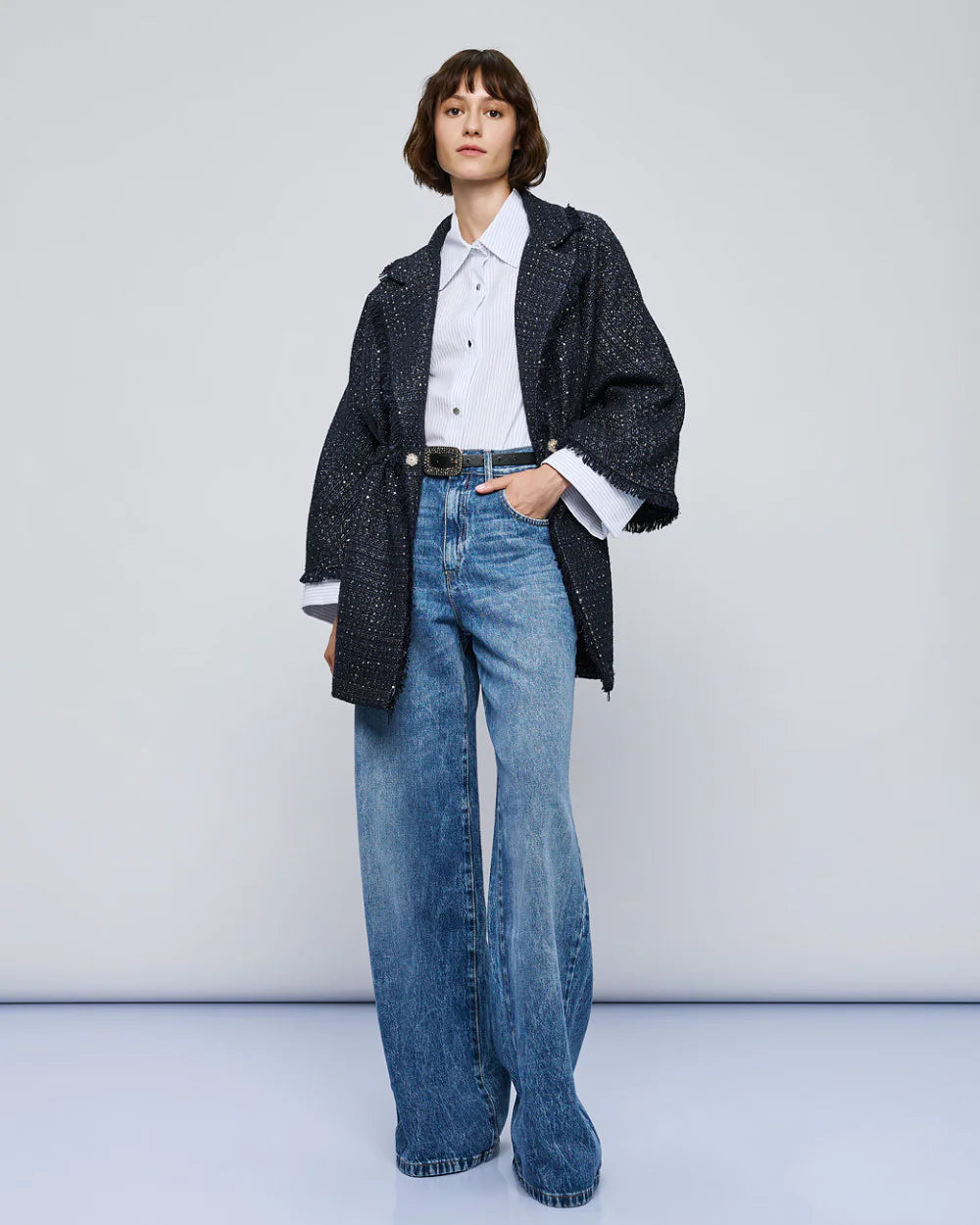 Notched Lapel Collared Snap Buttoned Tweed Lurex Sequins Jacket with adjustable drawstring at waist, frayed details, side slip pockets and long wide sleeve