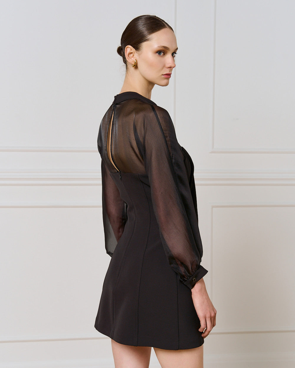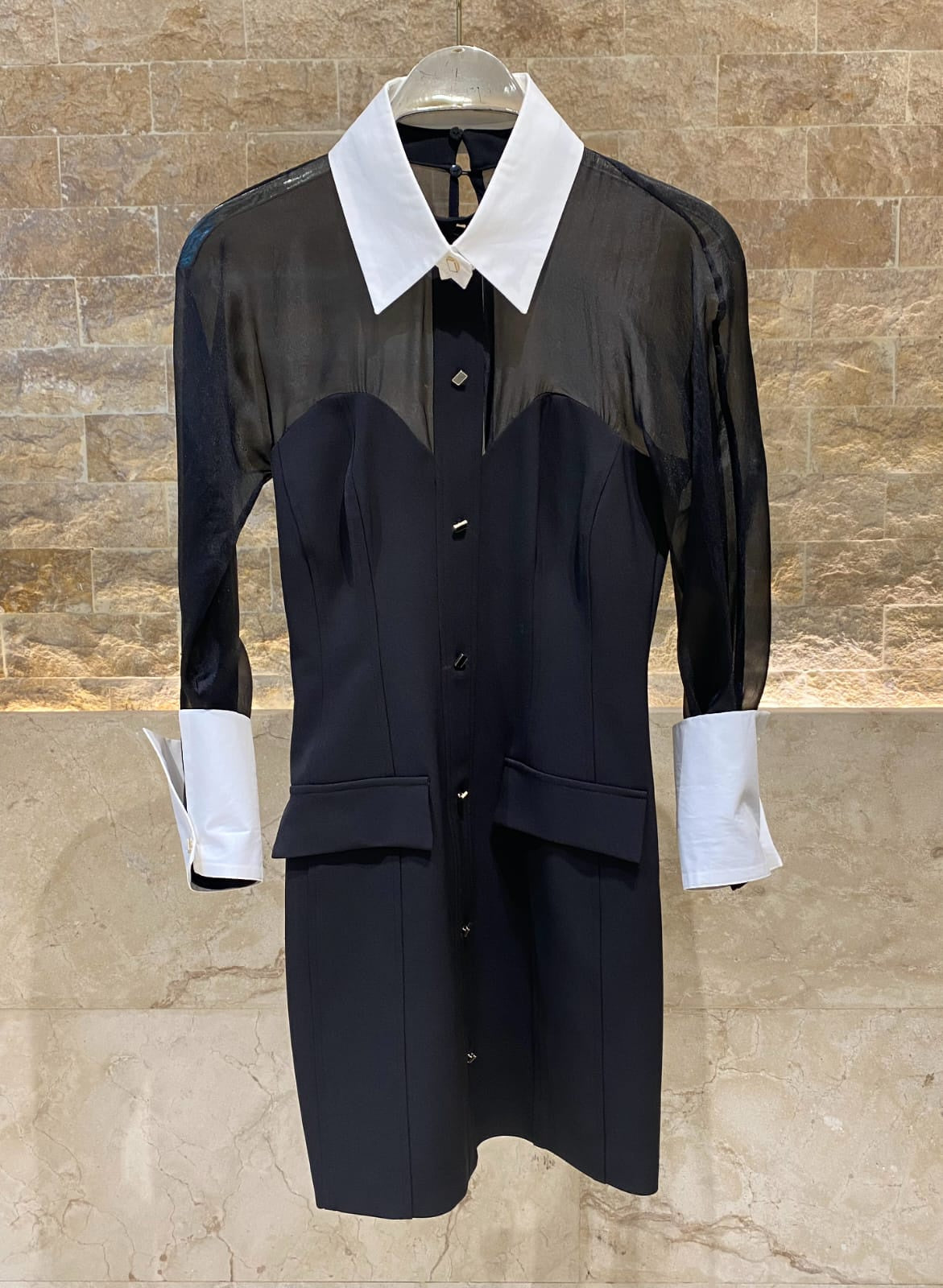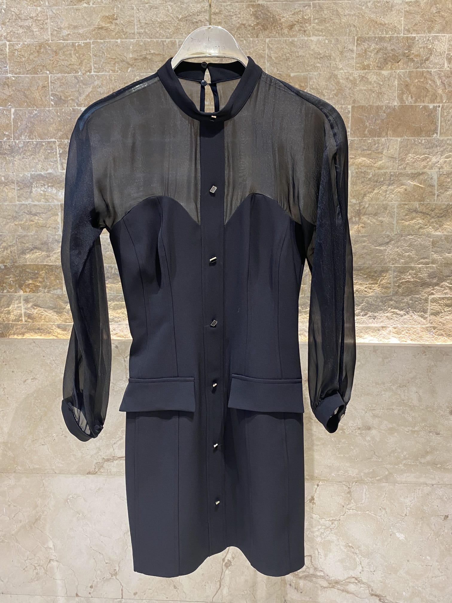 Mao Collared Decorative Buttons Midi Dress with sheer upper part, detachable white collar, flap pockets, long sheer sleeve with detachable white wide cuff and back opening button details