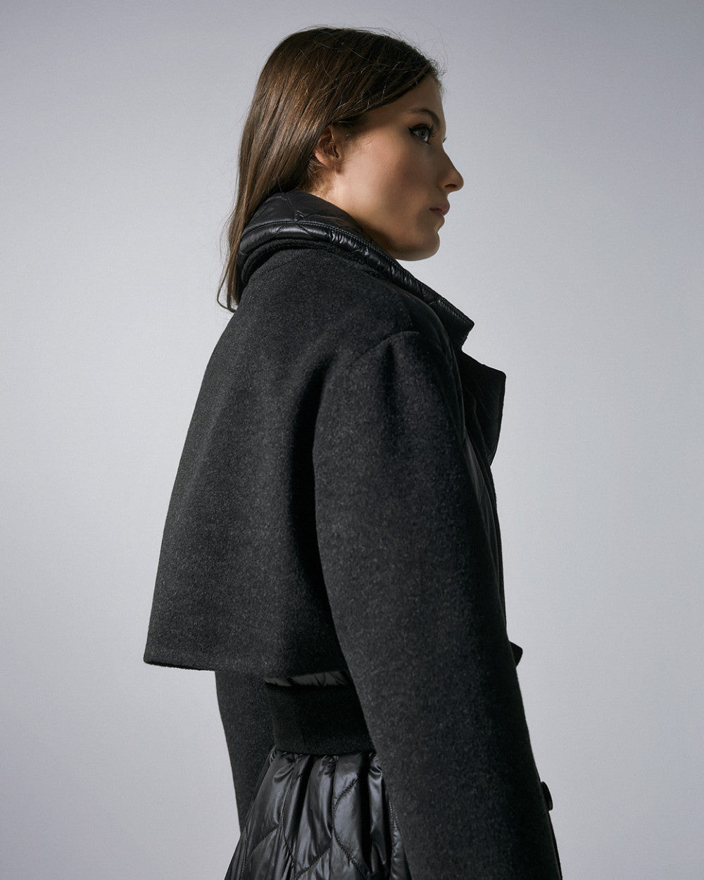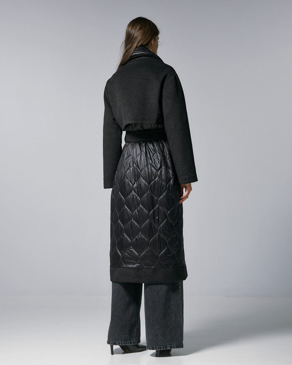 Notched Double Lapel Collared Buttoned Double Breasted Long Quilted Coat with combination fabric, detachable tie belt, side pockets, belt loops, quilted lining and long sleeve