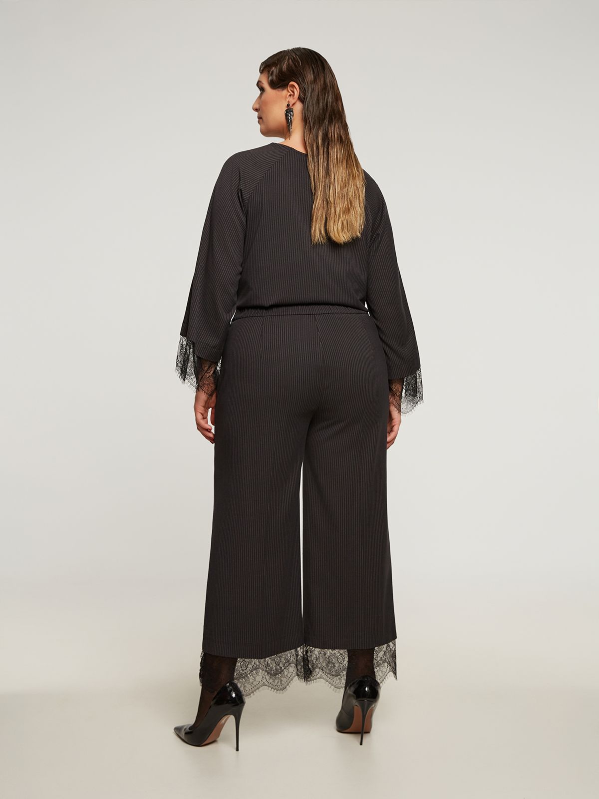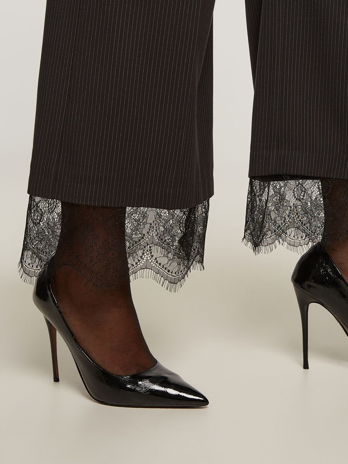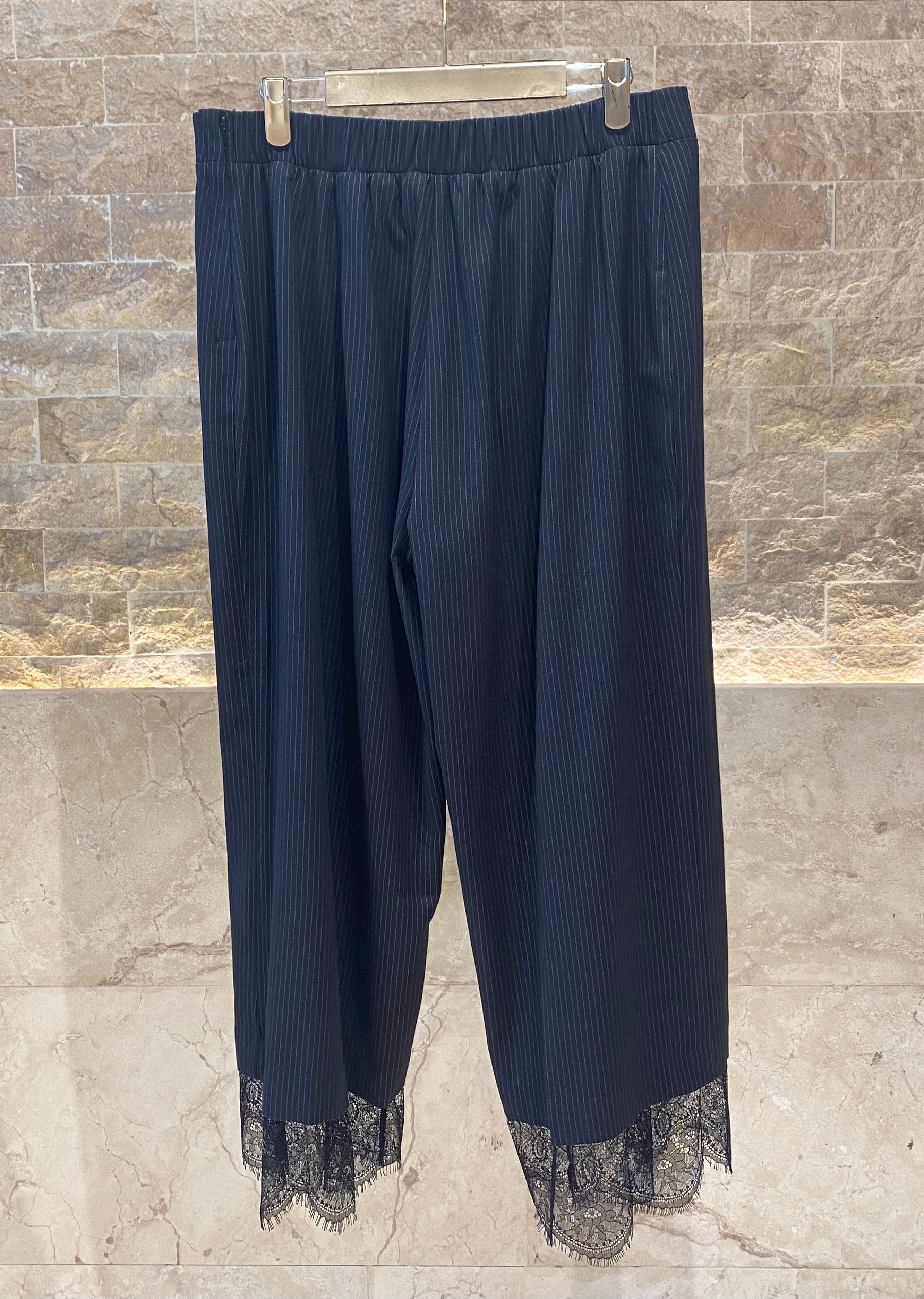 Side Zippered Tailored Pinstripe Cropped Pants with lace detailed hem and elastic waistband back details