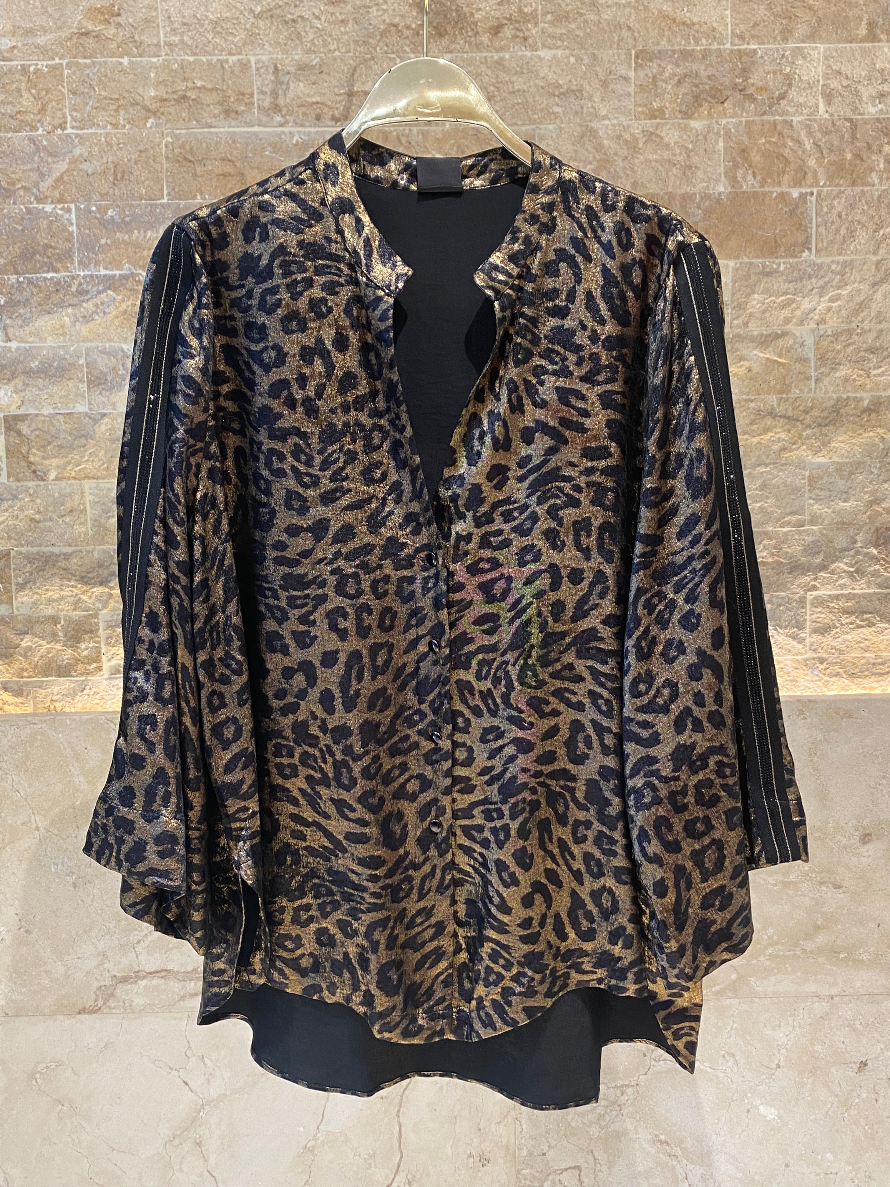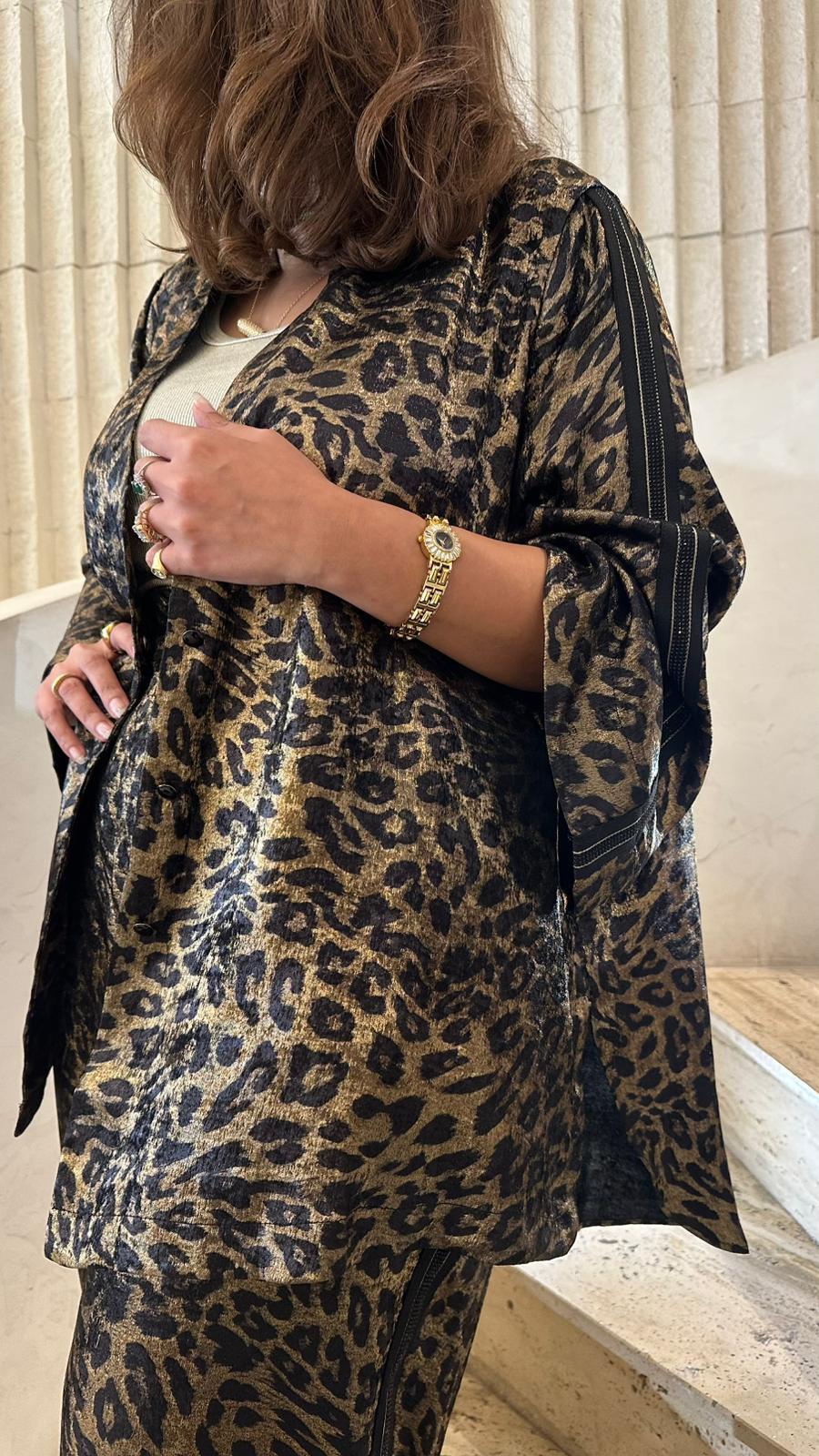 Buttoned V Neck Mao Collared Metallic Leopard Print Long Back Shirt with 3/4 wide sleeve and embellished details. Zippered Buttoned Metallic Leopard Relaxed Tapered Pants with side pockets, embellished side details and elastic waistband details