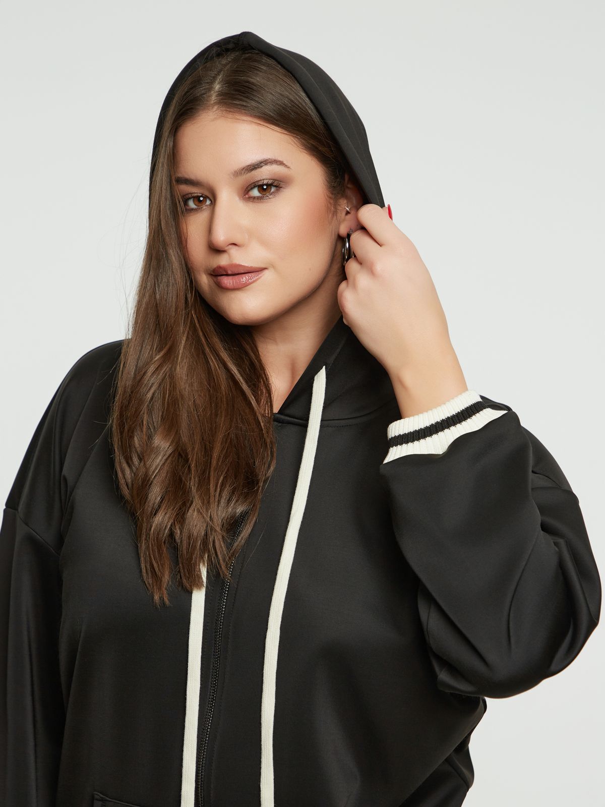 Zippered Hoodie Oversized Jacket with adjustable drawstring hood details, kangaroo pocket, drop shoulder and long sleeve with stripe rib cuff