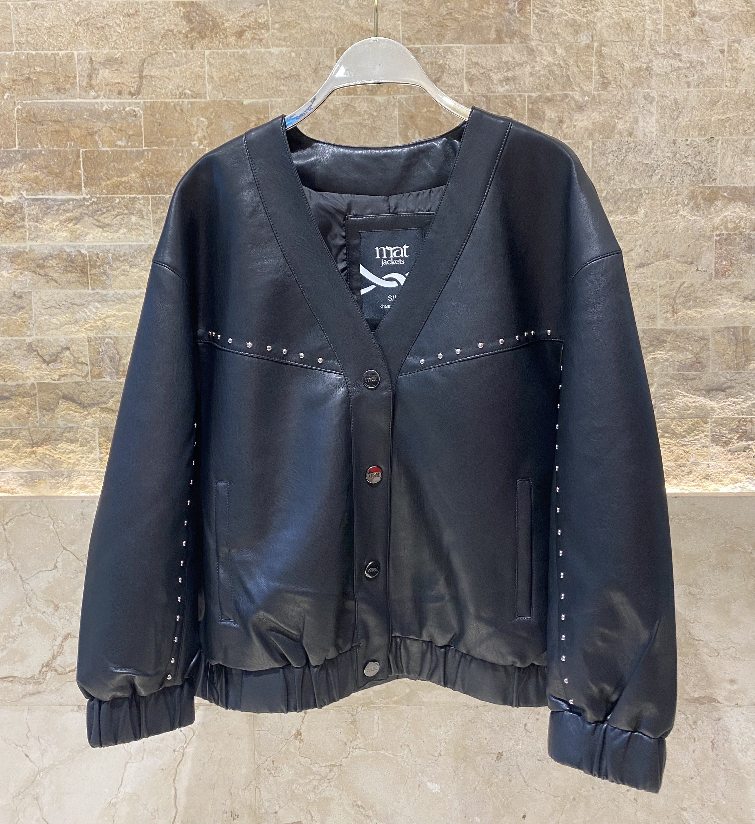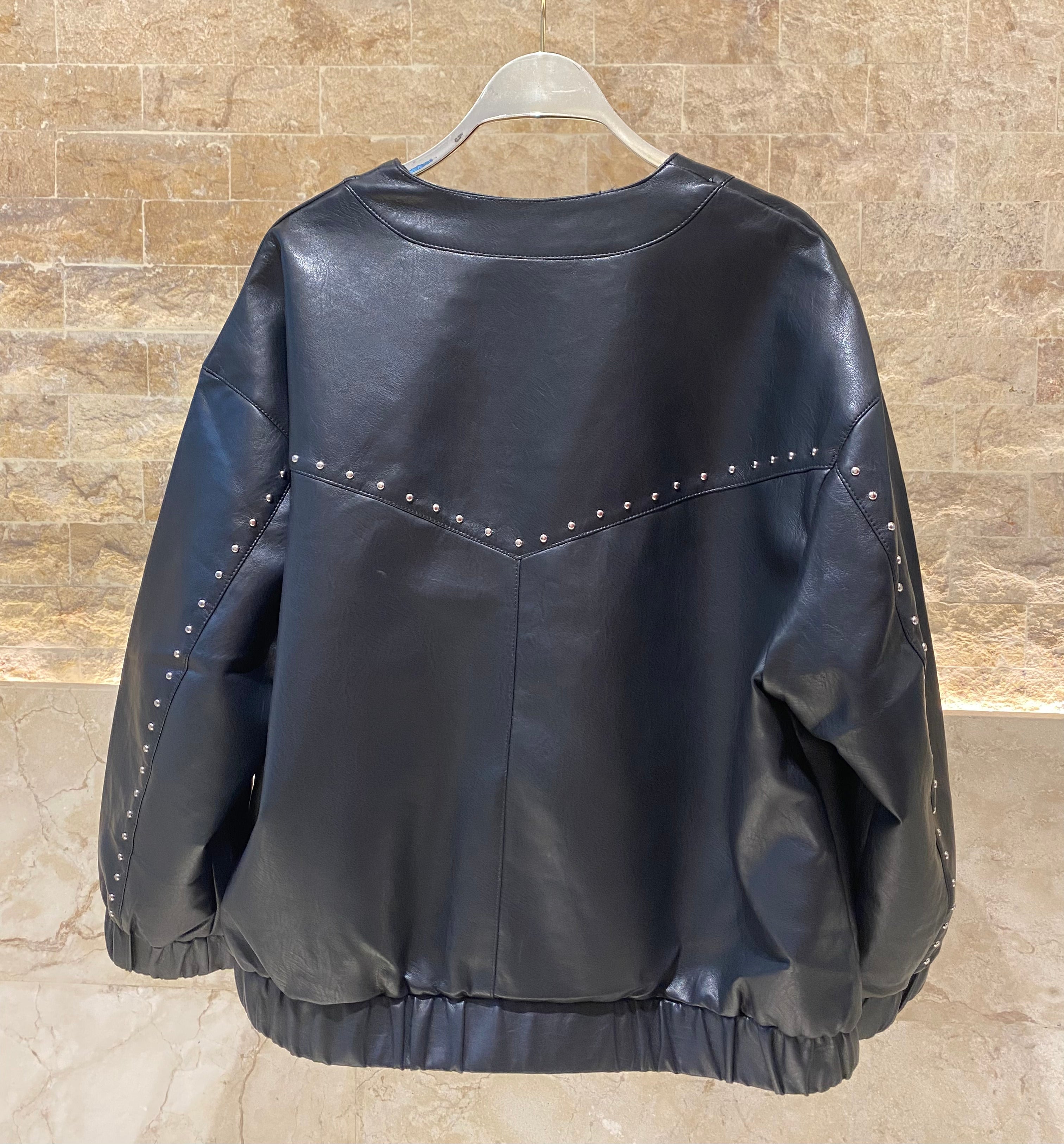 Snap Buttoned V Neckline Eco Leather Loose Bomber Jacket with metallic stud chest details, drop shoulder, elastic waist hem details and long sleeve with metallic stud details and elastic cuff