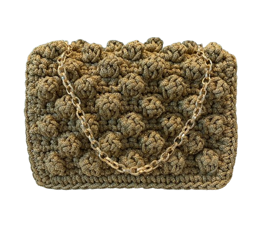 The XS Mini Bag 101 is a unique handmade clutch that combines artistry with functionality. Crafted from knitted yarn with metallic threads, this striking gold bag features yarn bubbles that give it a distinctive look, perfect for fashion-forward individuals. Its versatile design allows it to be used as a clutch or a shoulder bag, making it an ideal accessory for evening outings, parties, or casual use.