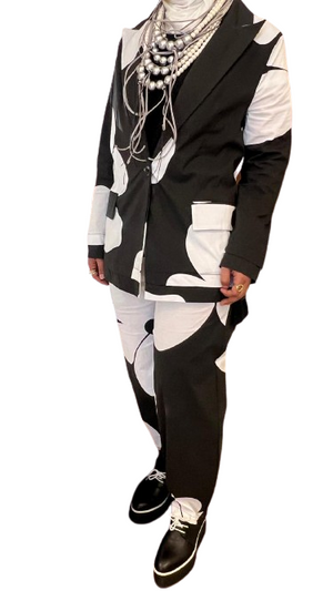 Lapel Collared Single Buttoned White Flower Print Jacket with layered hem details, flap front pockets and long sleeve with layered cuff details