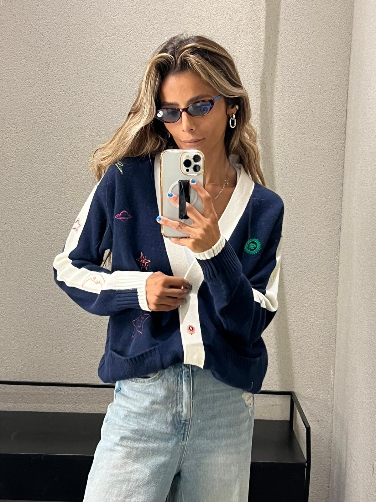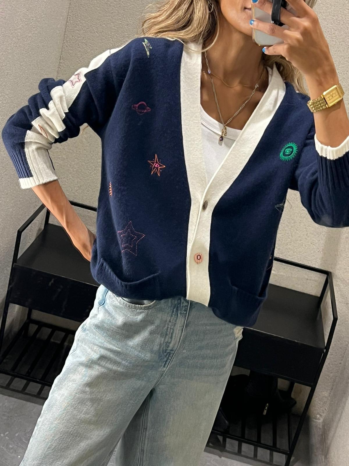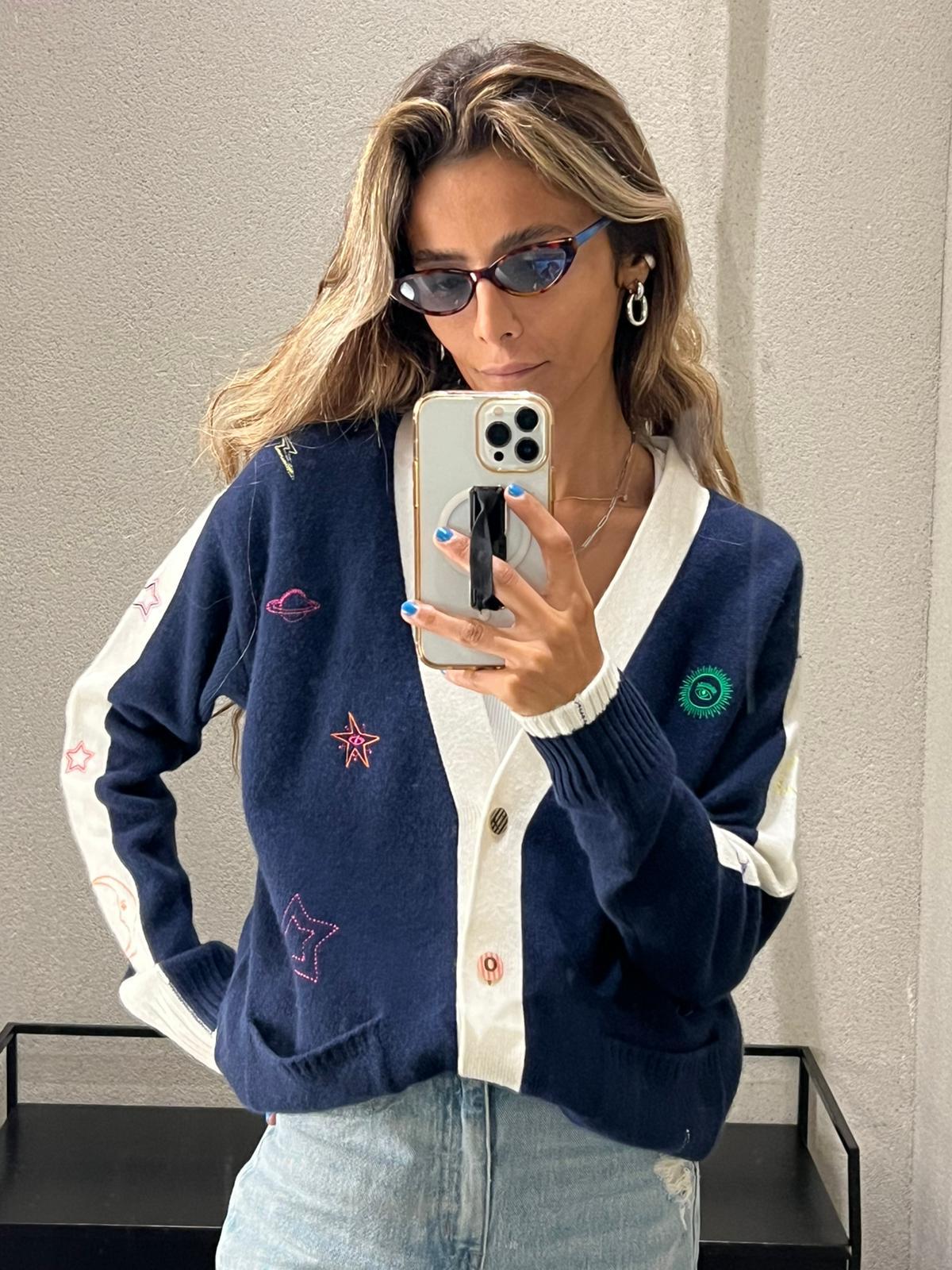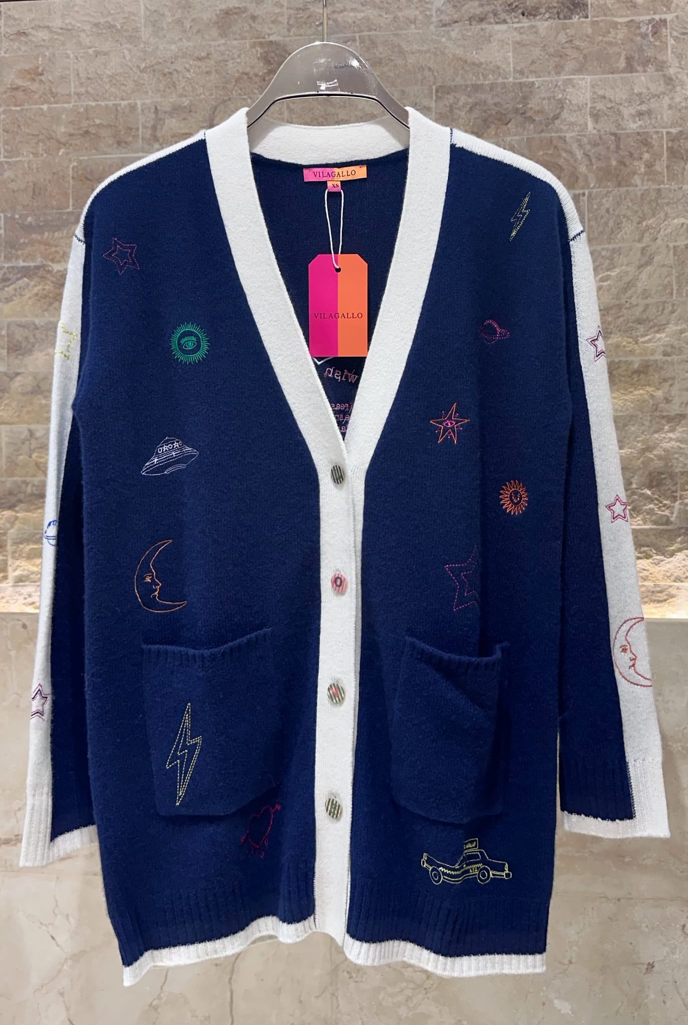 Multicolored Fantasy Buttoned V Neck Long Cardigan with multicolor embroidery across the front, sleeves, and back. Ivory ribbed trim at the neckline, cuffs and hem and long two tone sleeve. Large heart-shaped embroidery with pink stitched messages at the back.  Made of 100% merino wool, soft and warm.