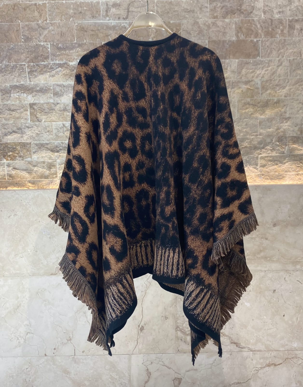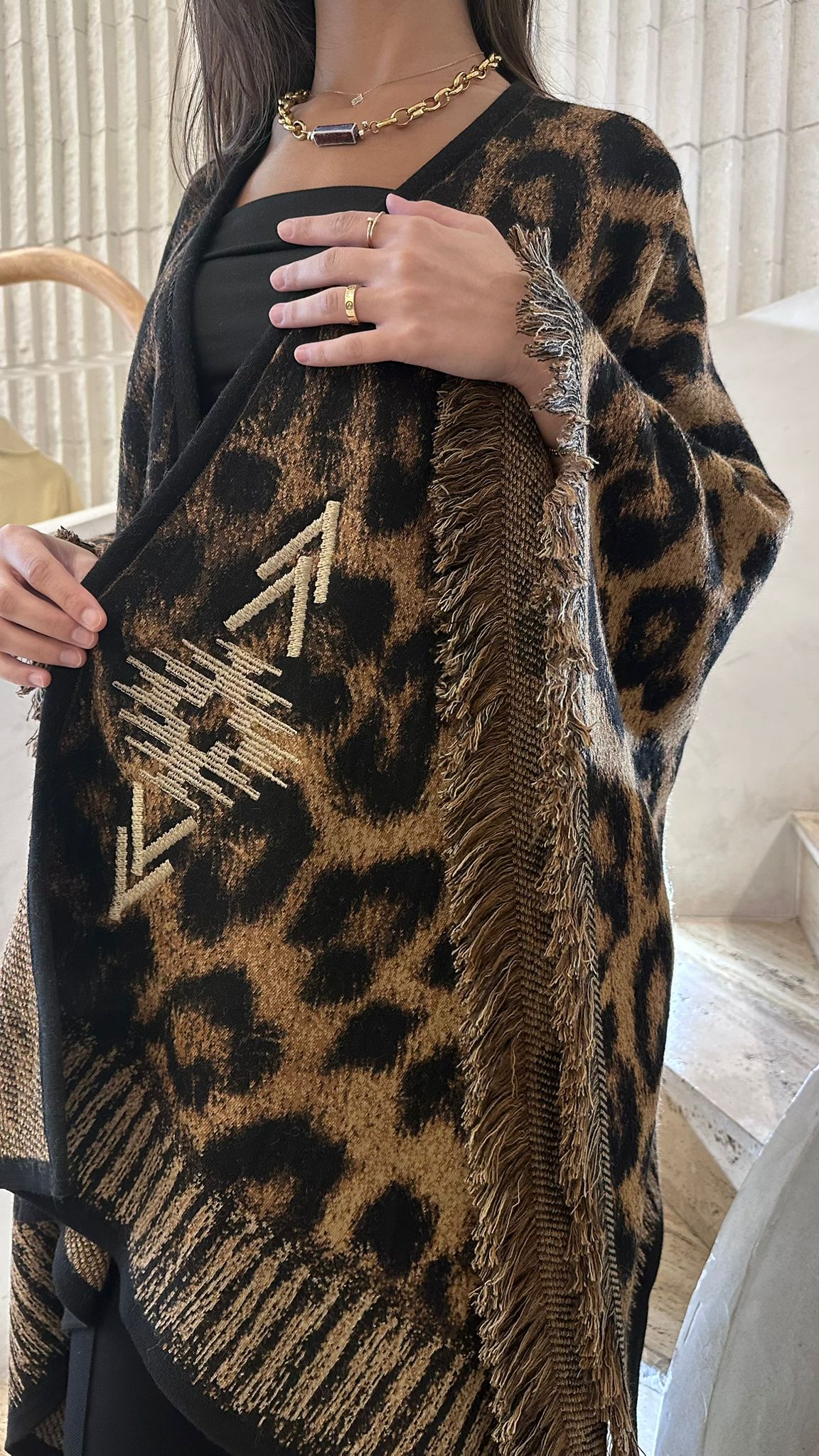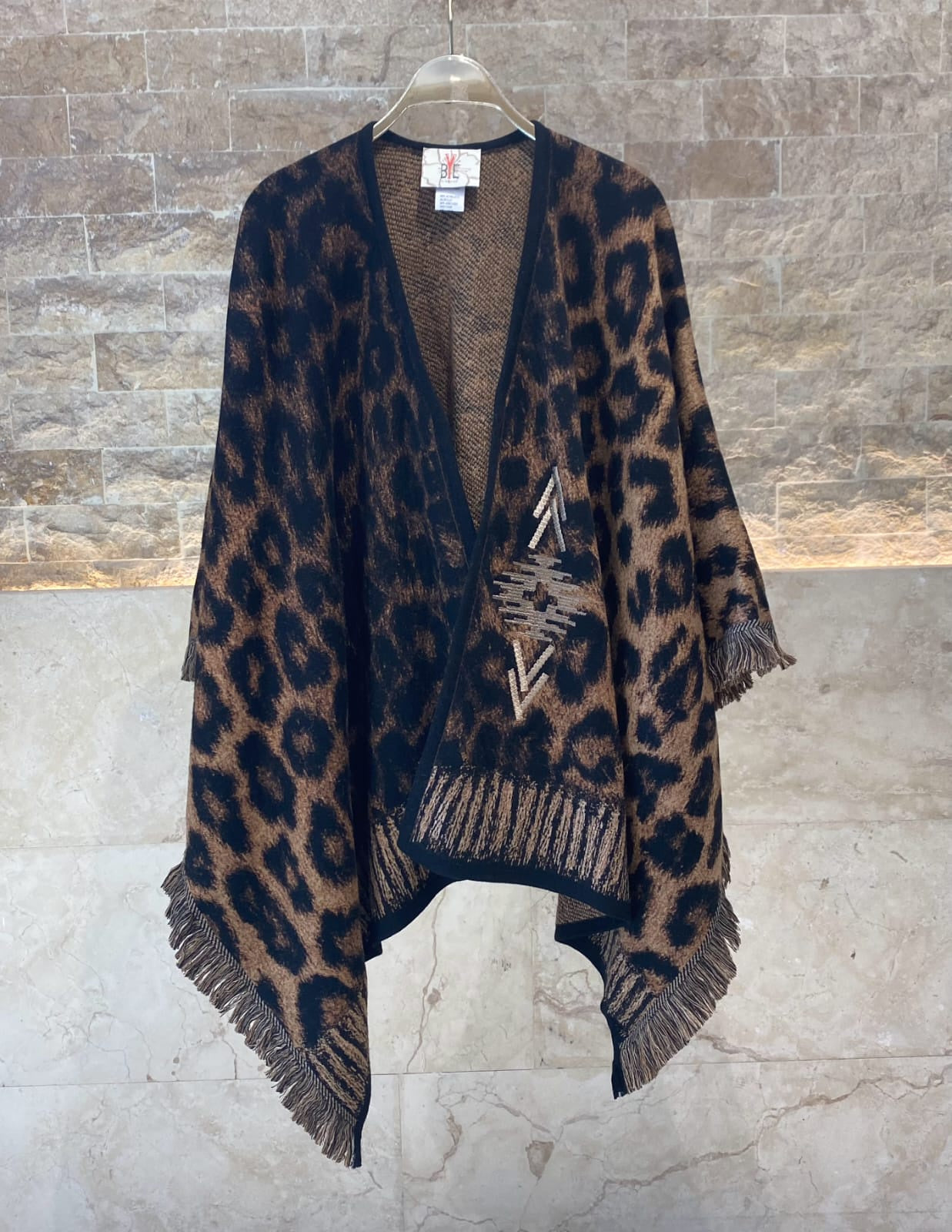 Leopard Print Wool Cape Cardigan with embroidered details and fringes details