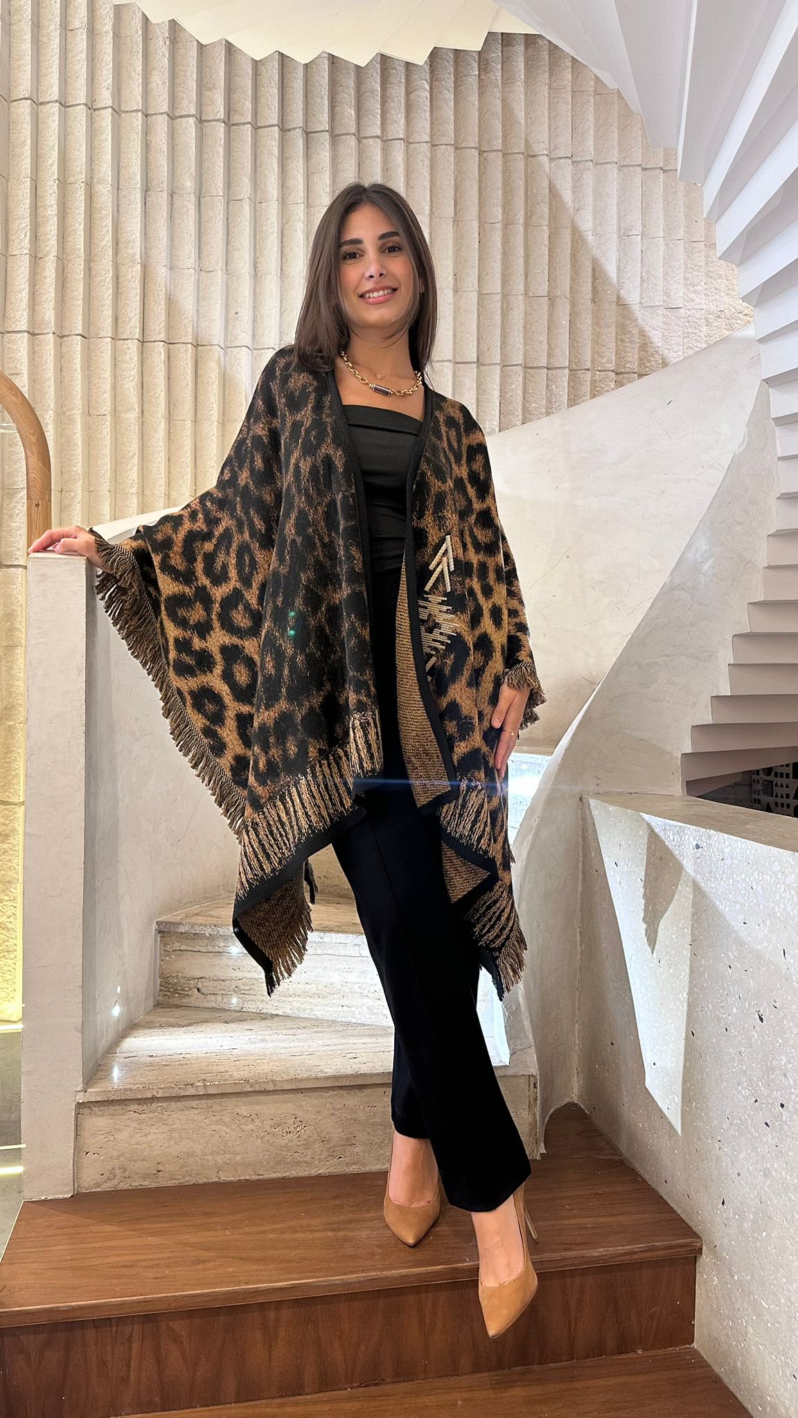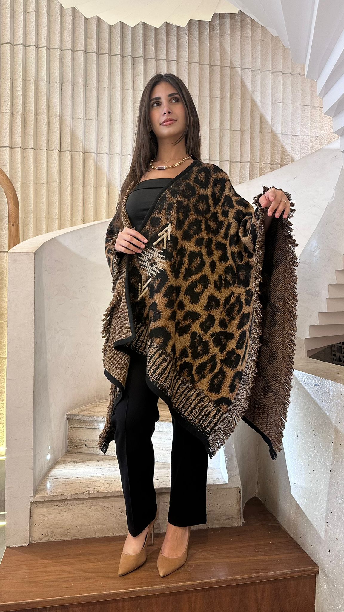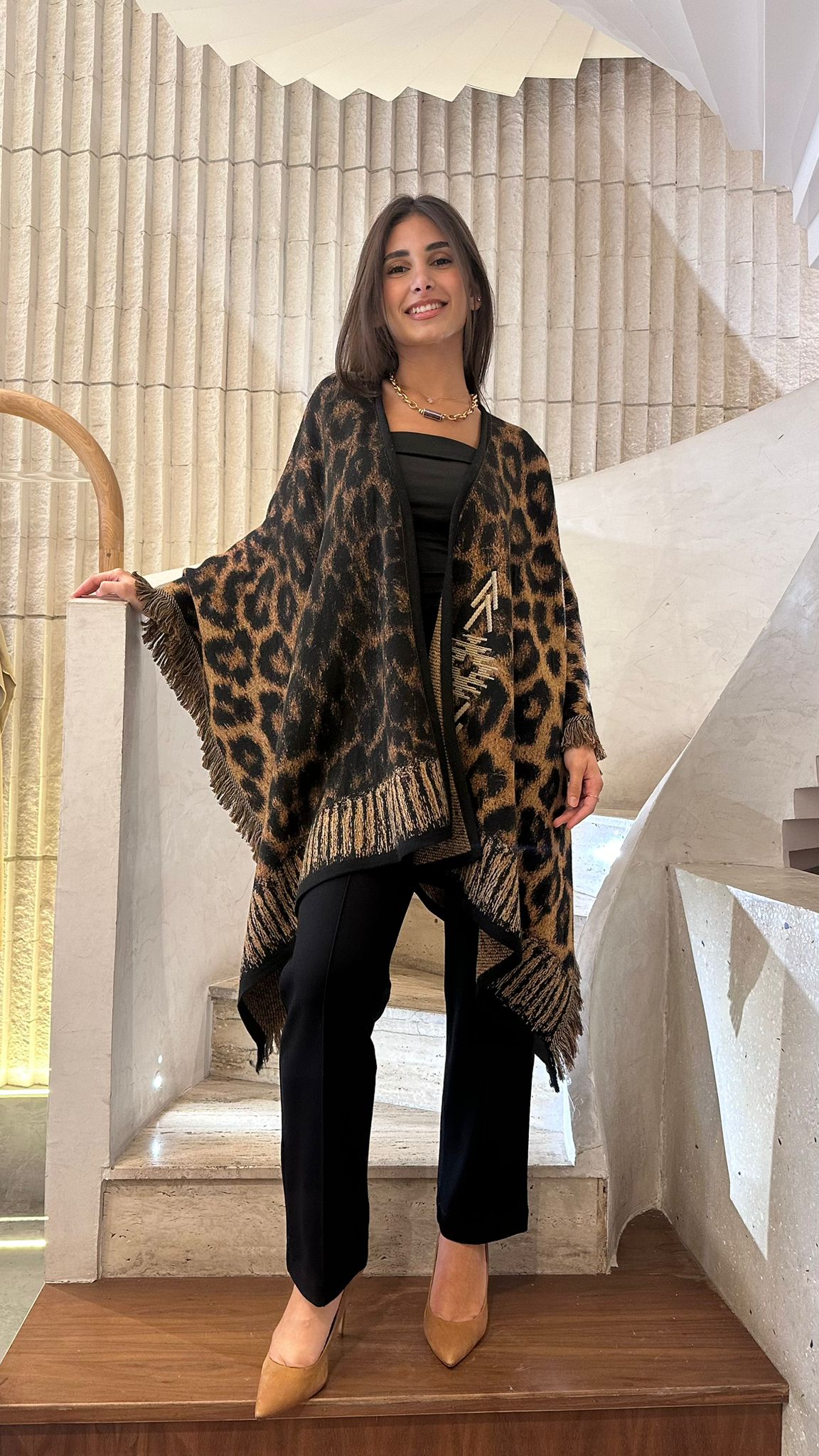 Leopard Print Wool Cape Cardigan with embroidered details and fringes details