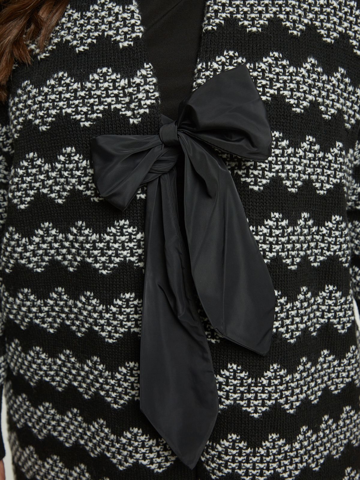 Black and White Zigzag Knit Cardigan with bow detail, black rib hem, drop shoulder and long sleeve with black rib cuff