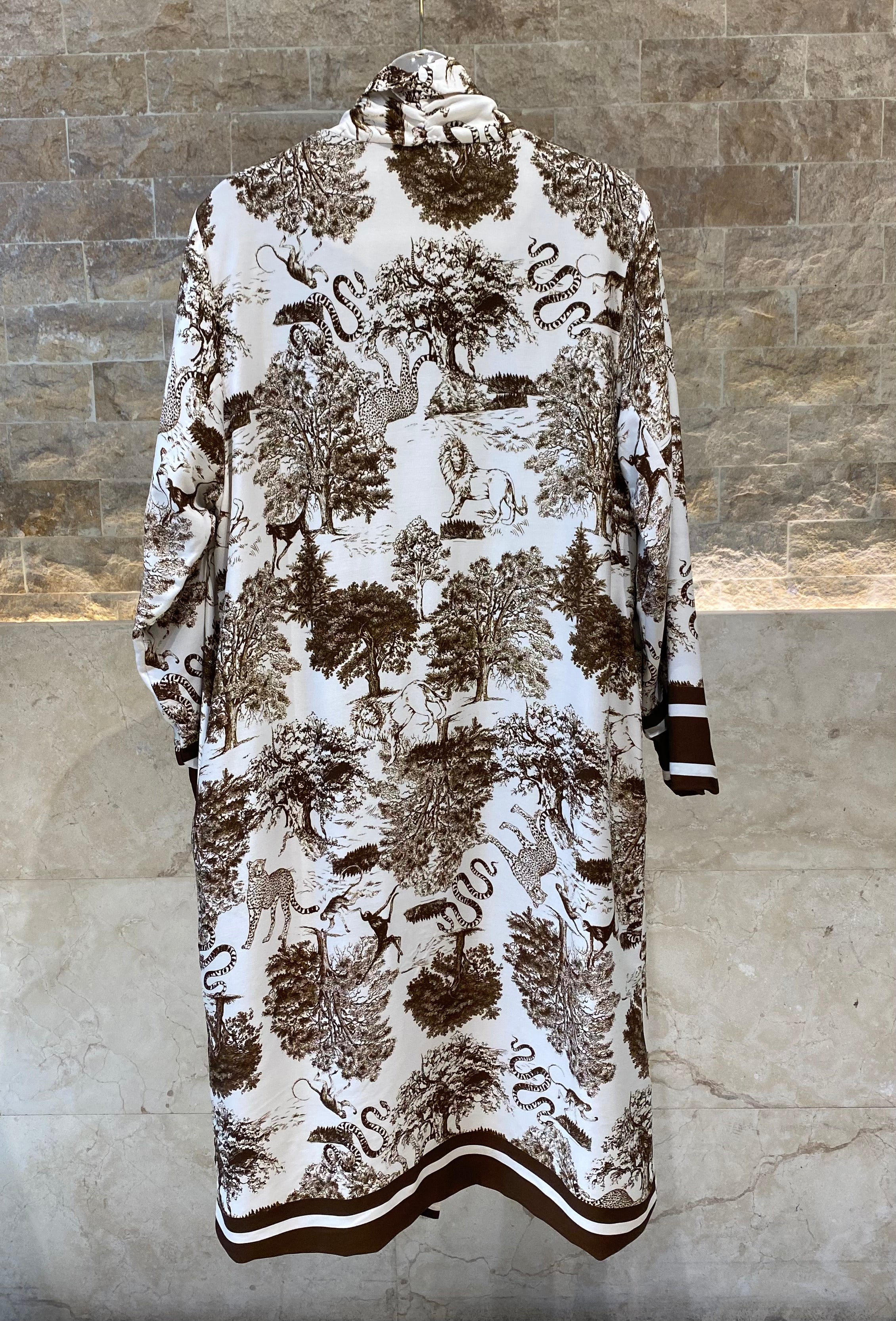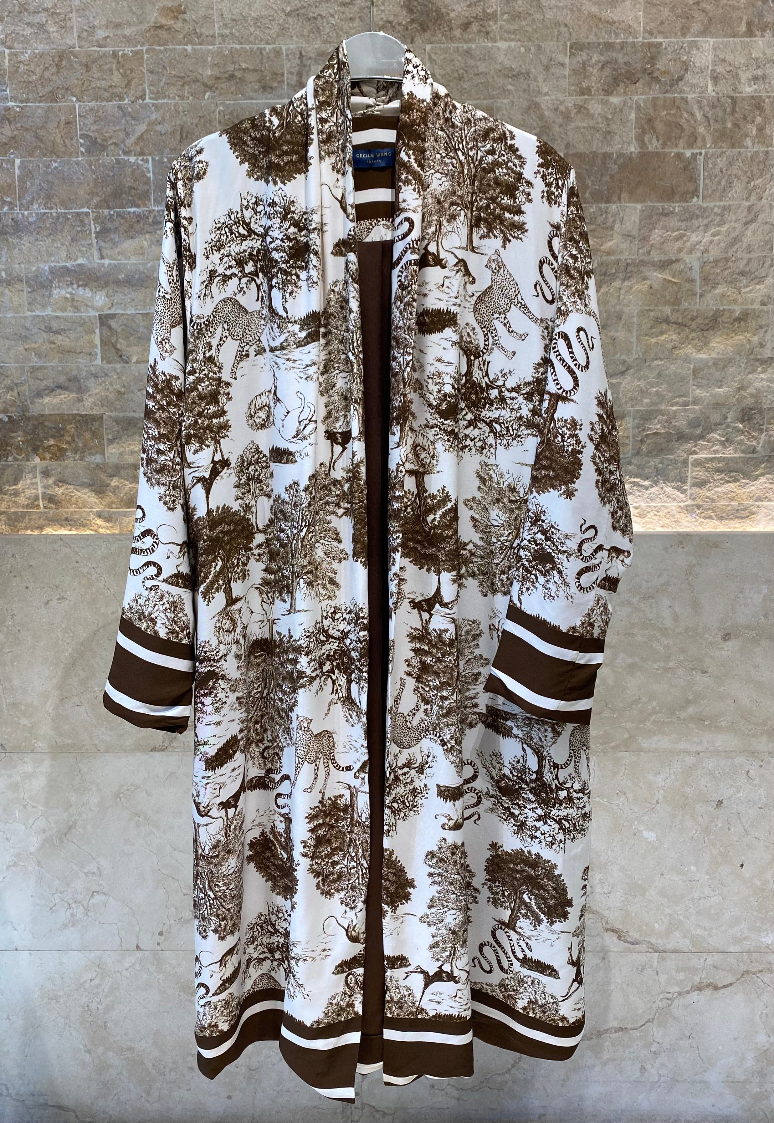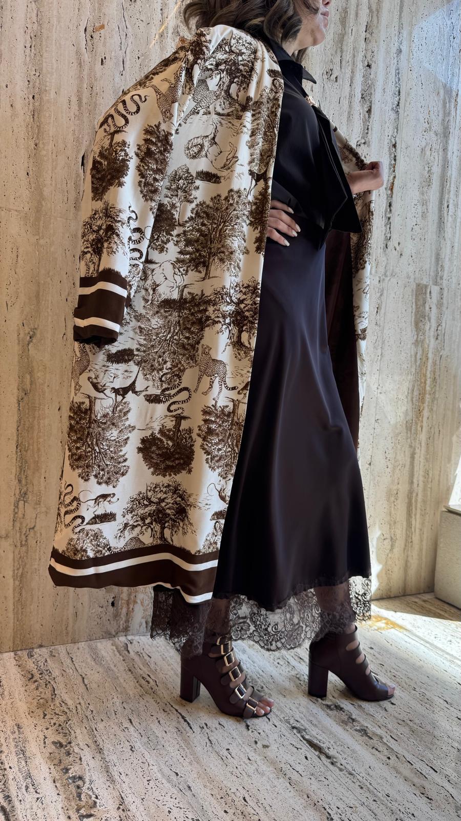 KD7182TN Safari Print Satin Long Cardigan كارديجان طويل من الساتان بطبعة سفاري
