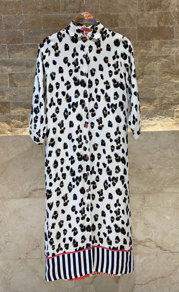 The Satin Leopard Print Long Dress (Product Code: 32468) is the perfect blend of style and comfort, making it an essential addition to any wardrobe. Featuring an eye-catching leopard print, this dress is designed to turn heads while providing functional features for everyday wear. The breathable satin fabric and three-quarter buttoned sleeves ensure comfort, while the removable belt allows for a customized fit. With practical side pockets and a stylish side slit, this dress is ideal for casual outings, parties, or elegant events. The colorful checkered and floral back details add a unique touch, enhancing its visual appeal.