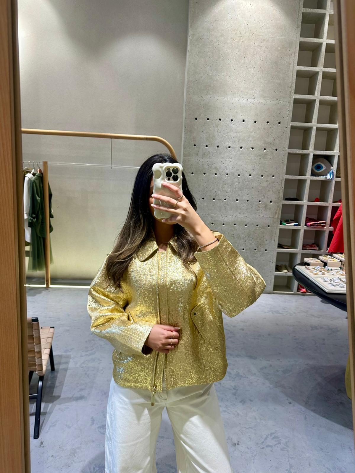Front Zippered Classic Collar Oversized Bomber Jacket with crackle finish in a brilliant gold tone, side pockets, drop shoulder and long sleeve