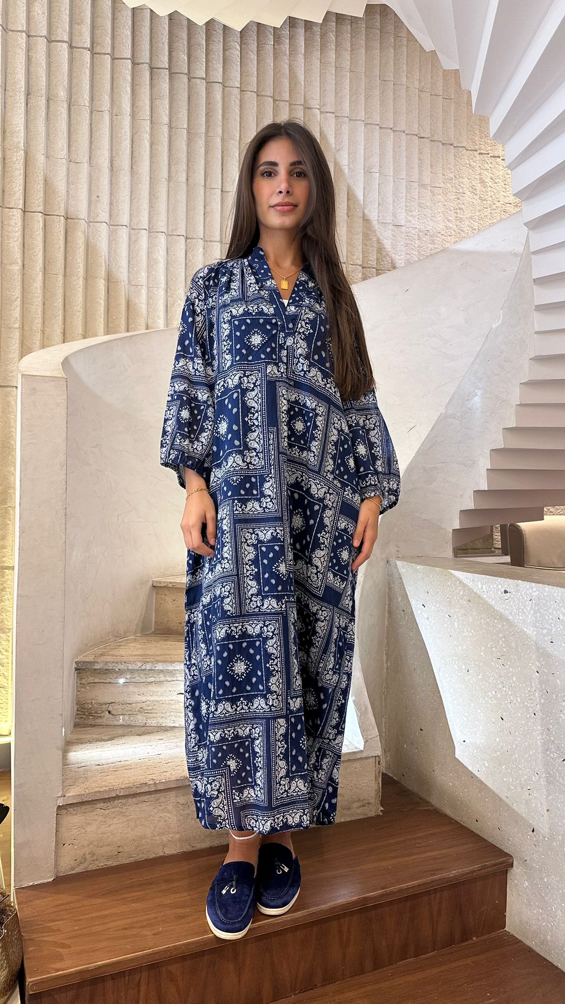 Round V Neck Bandana Print Oversized Dress with curved hem, side pockets and 3/4 wide sleeve with elastic cuff