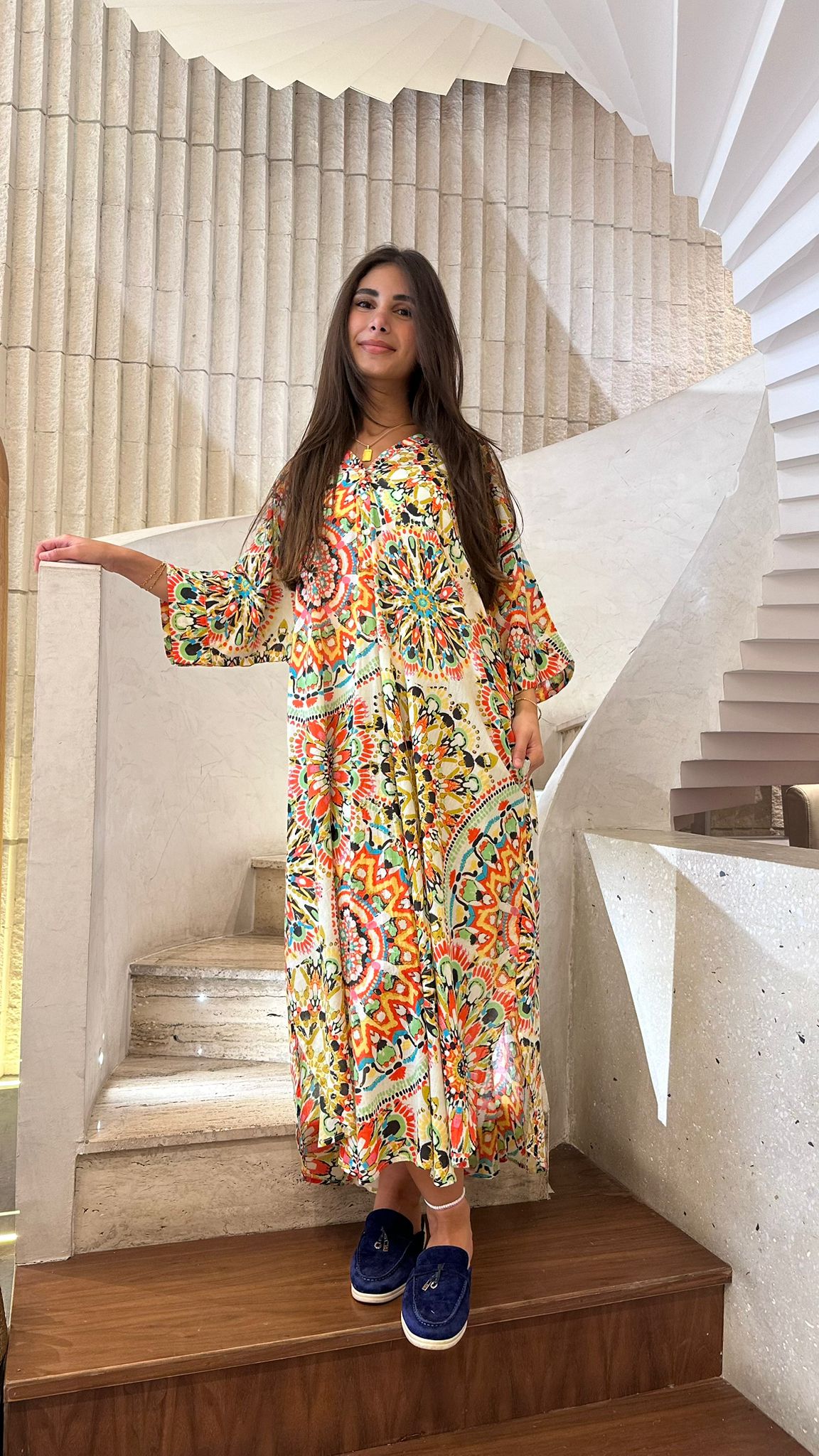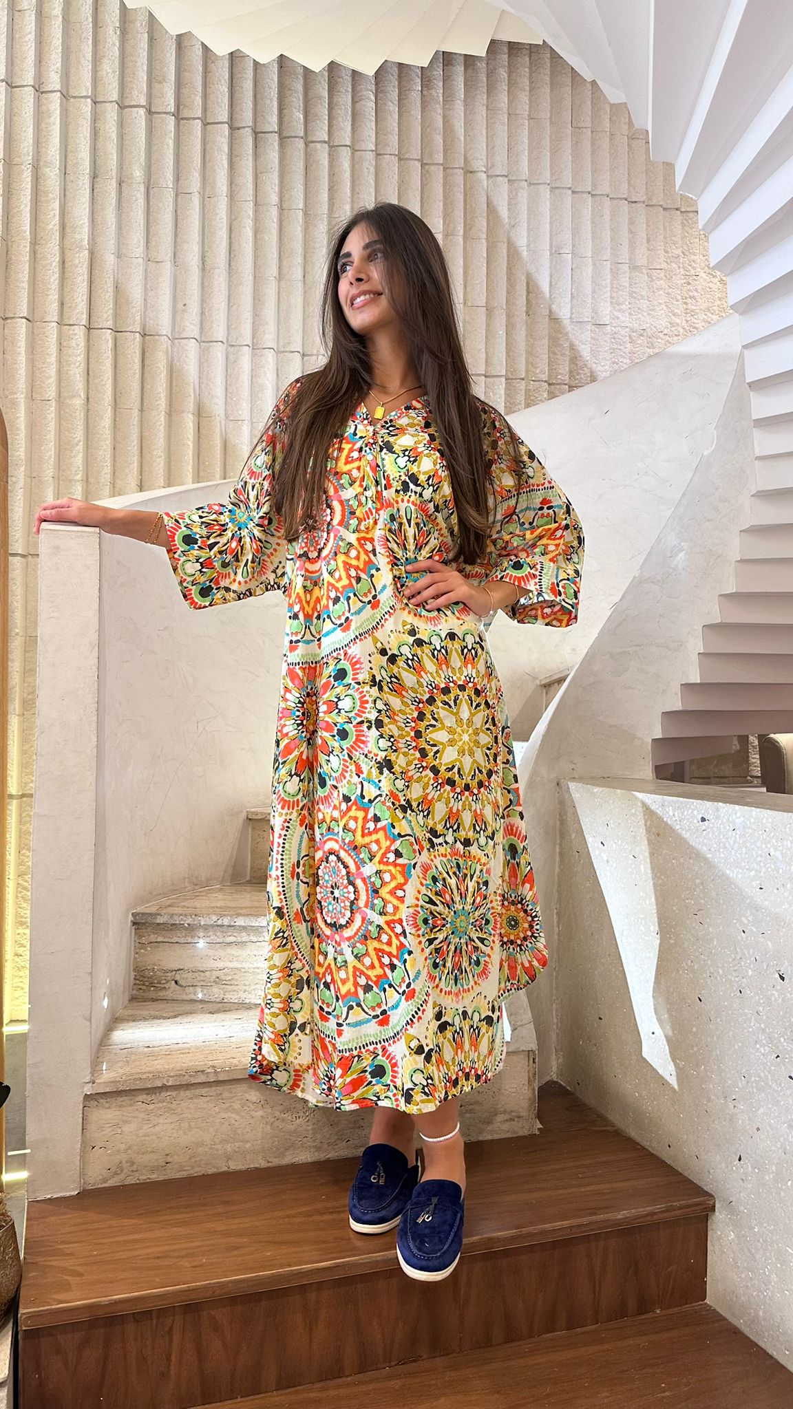 V Neck Three Buttoned Multi Ethnic Print Loose Tunic Dress with side pockets and short wide sleeve
