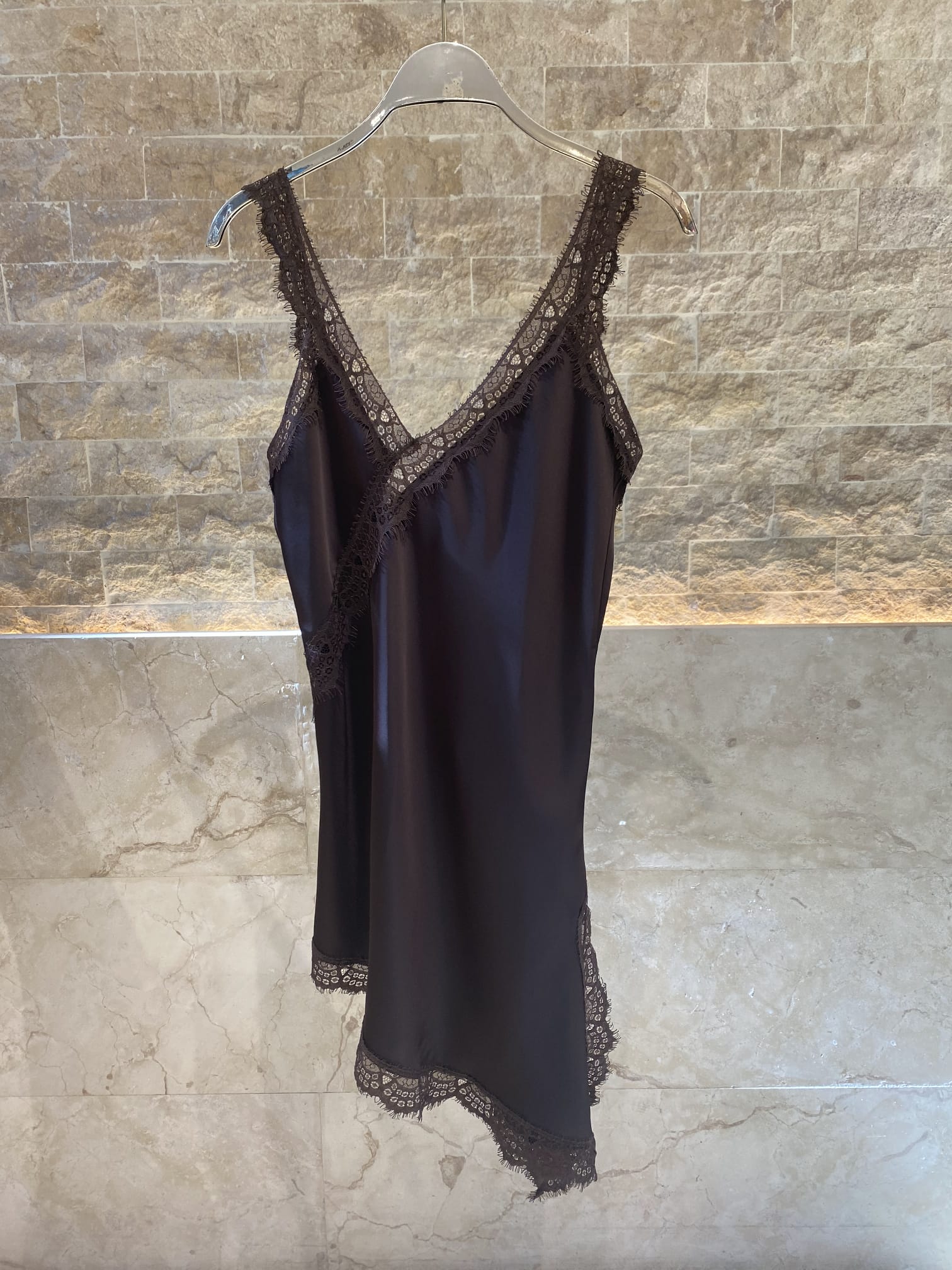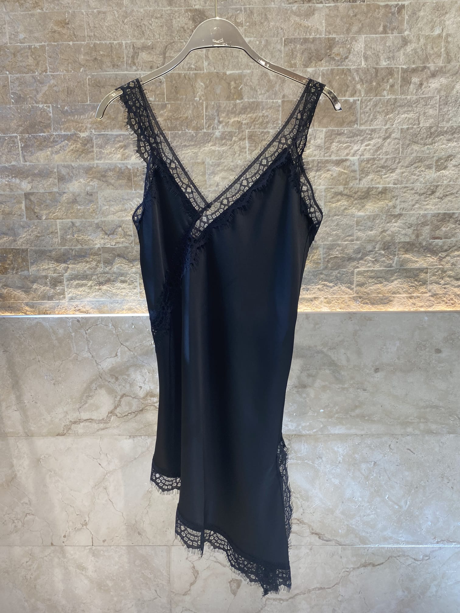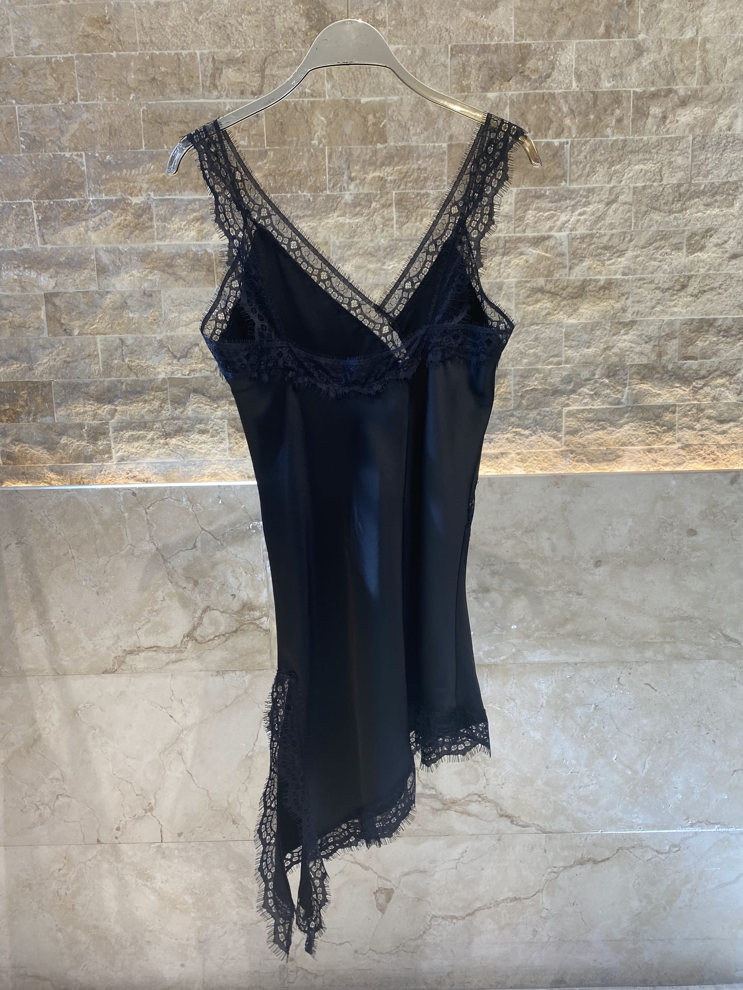 V Neck Satin Asymmetrical Strap Lace Dress with lace trim details and side slit details