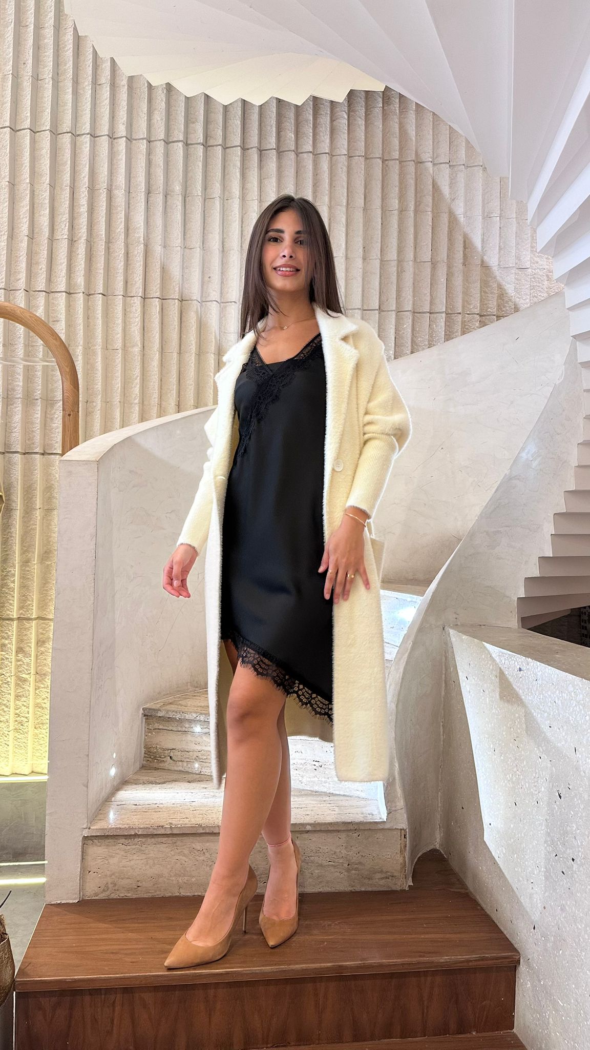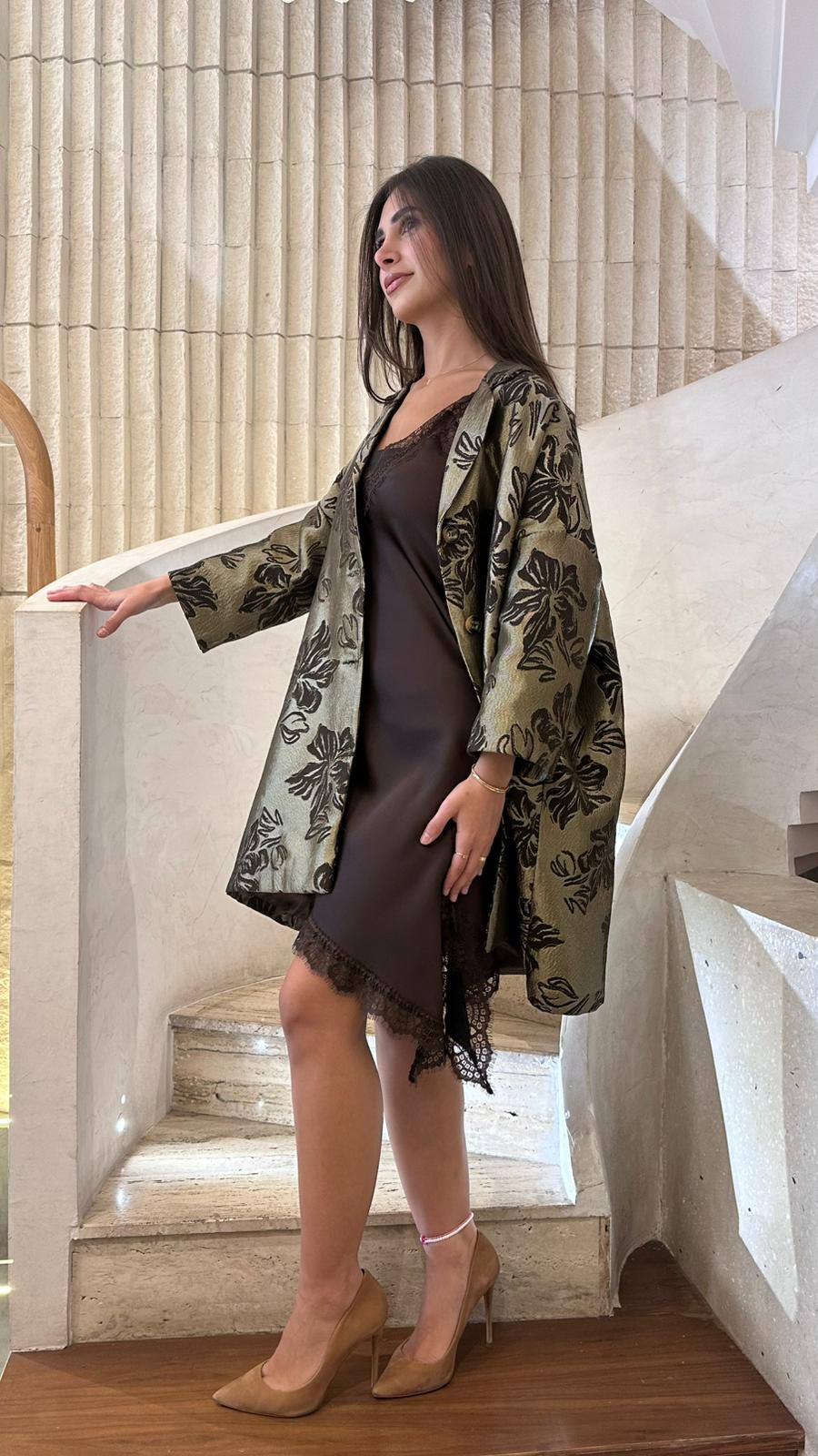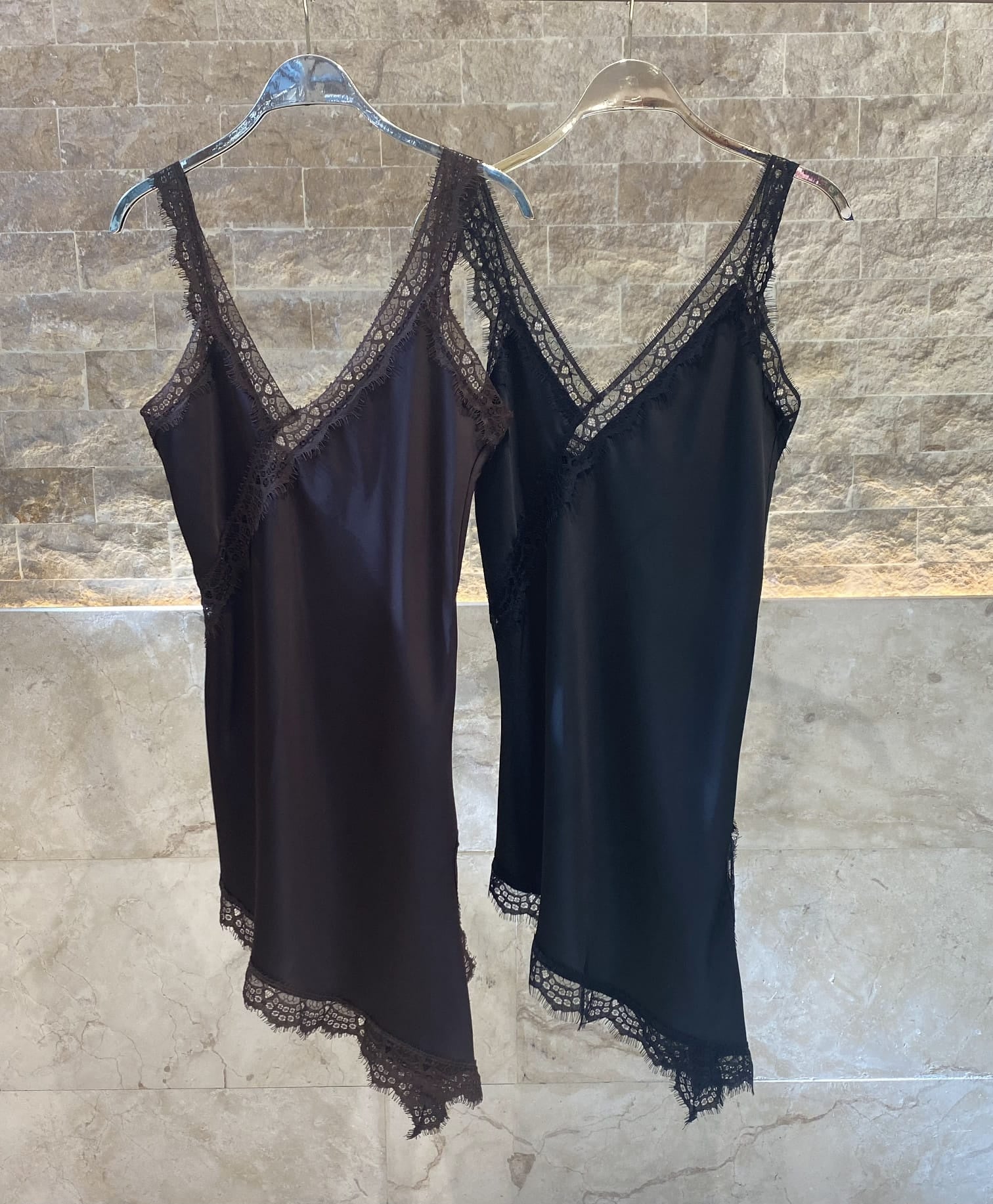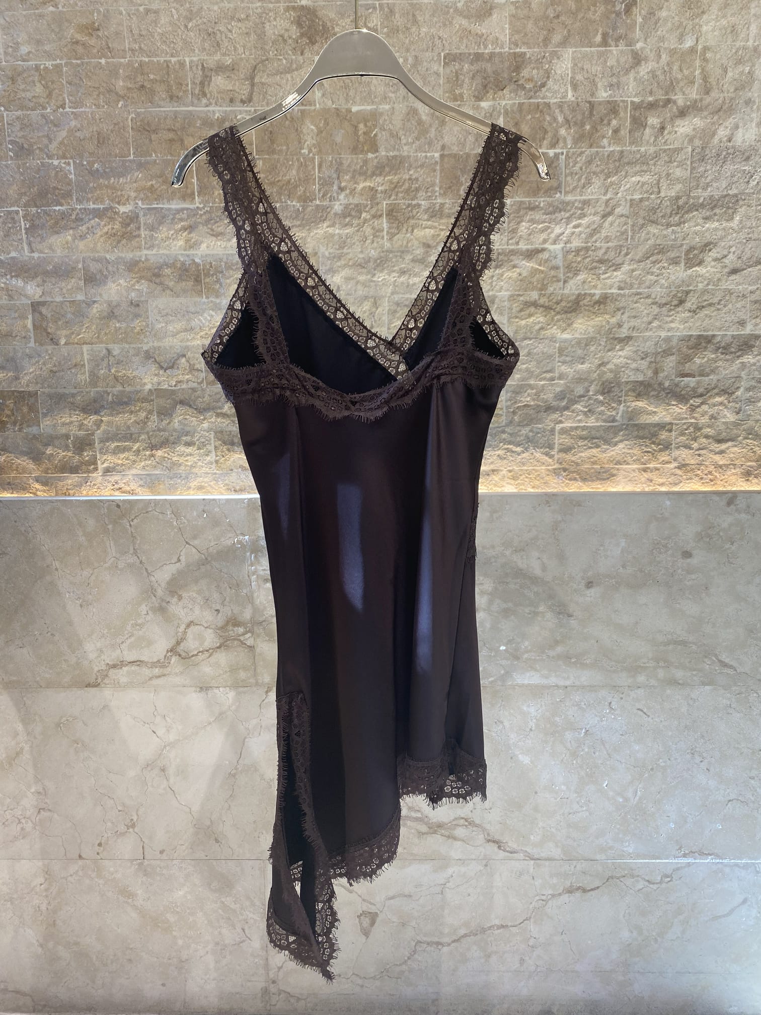 V Neck Satin Asymmetrical Strap Lace Dress with lace trim details and side slit details