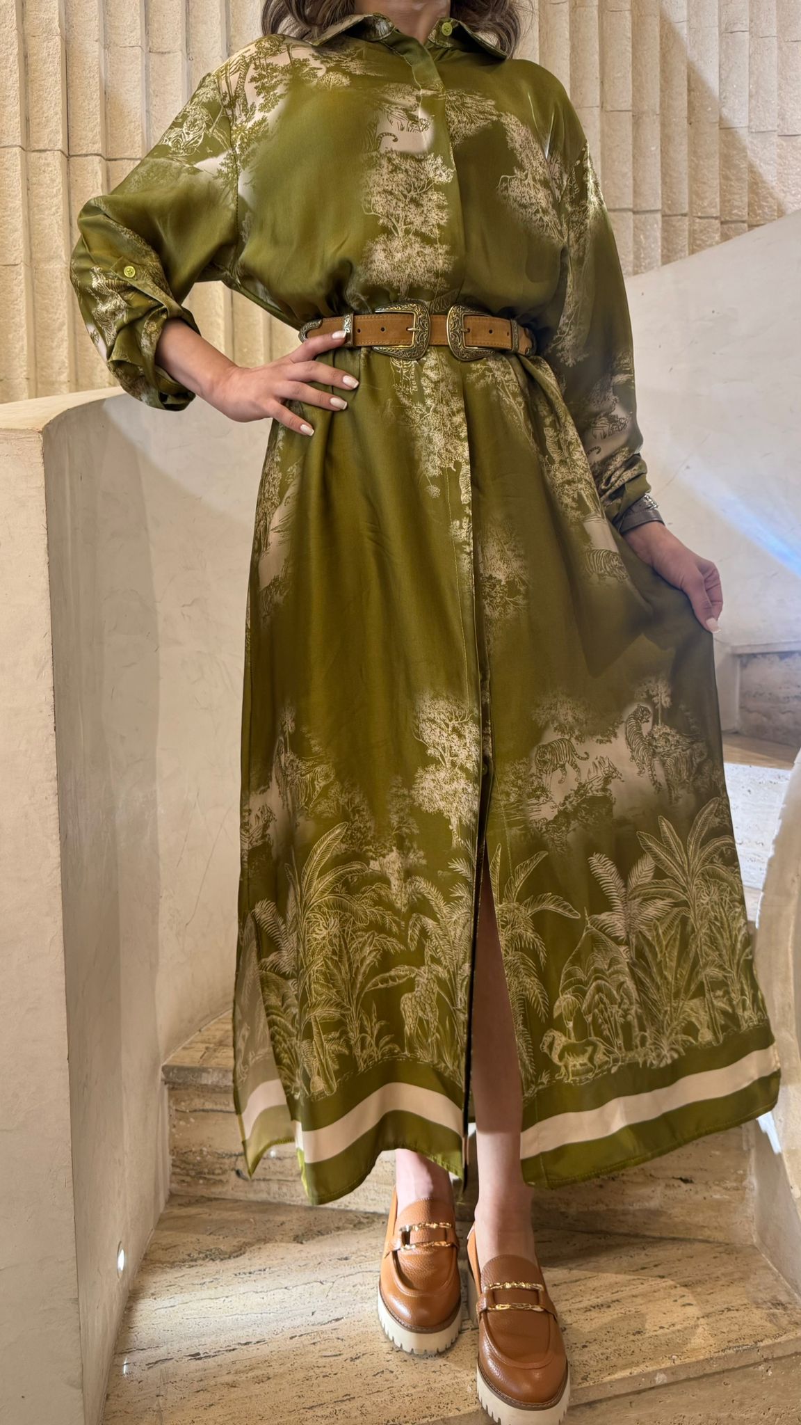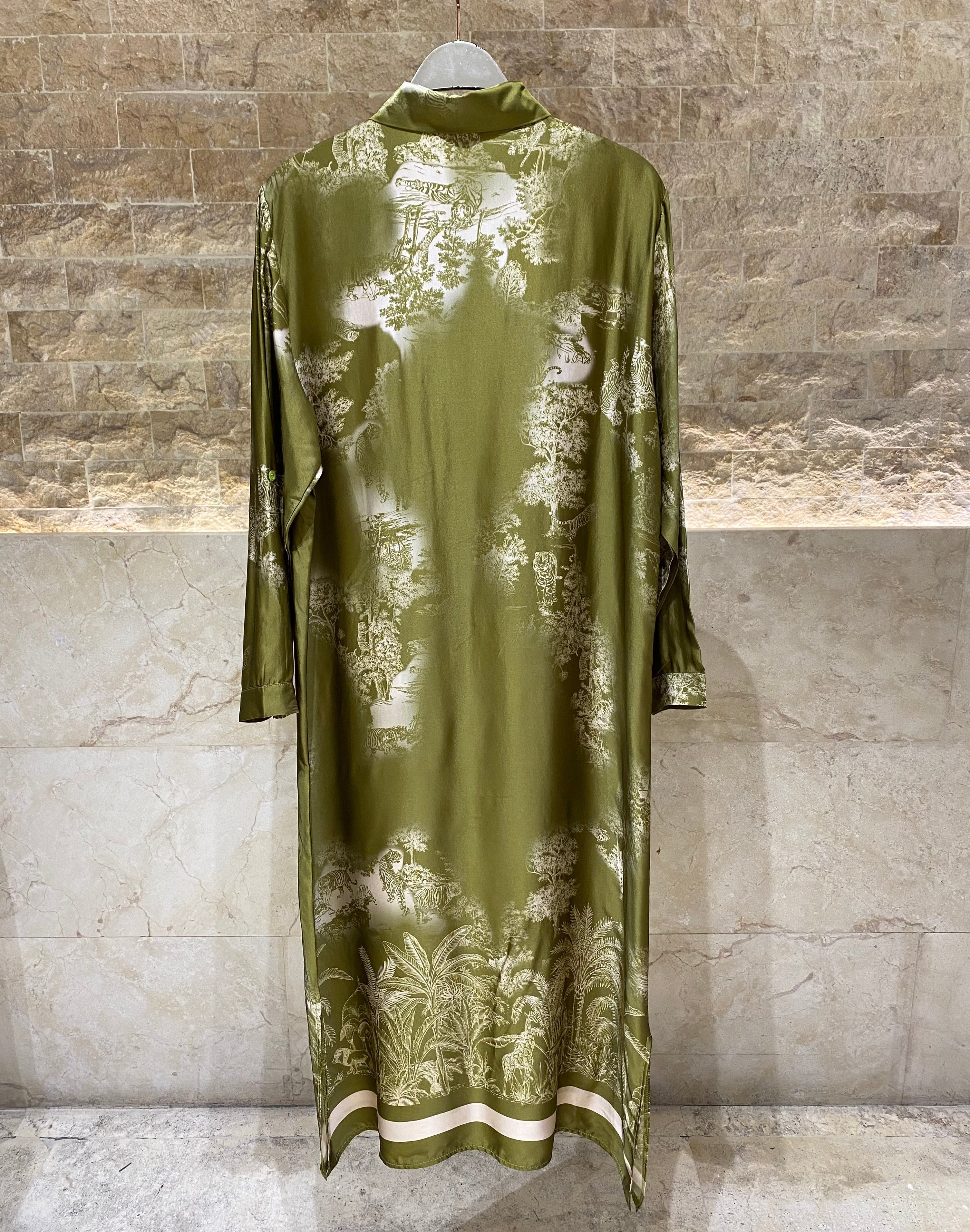 Classic Collared Placket Buttoned Jungle Print Satin Long Dress with drop shoulder, stripe hem and long sleeve with buttoned cuff