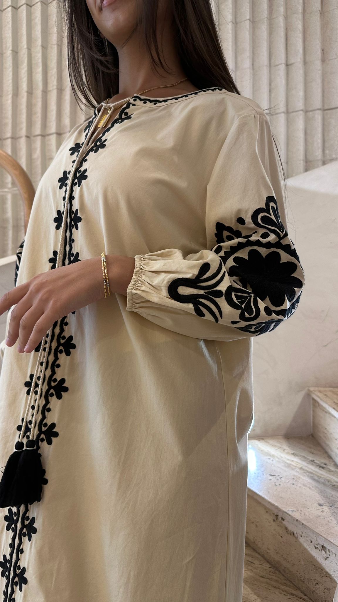 The Ivory Embroidered Long Kaftan Dress (Product Code: AWSS-187) is a stunning choice for those who appreciate elegance and comfort. Featuring a V round neckline adorned with intricate black floral embroidery, this kaftan is designed for versatility in any wardrobe. The 3/4 sleeves with elastic cuffs ensure ease of movement, making it perfect for both formal occasions and casual outings. A stylish split tied ribbon with a black tassel adds a touch of flair, creating a unique look that stands out.