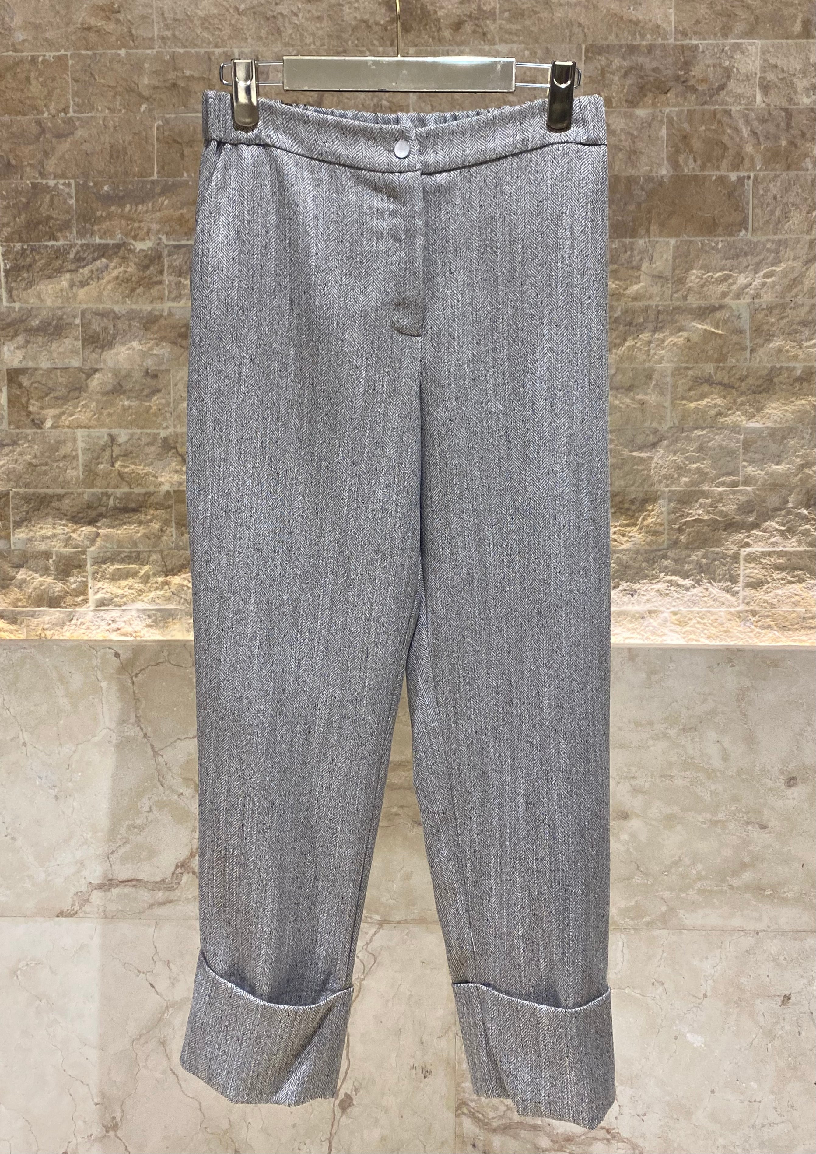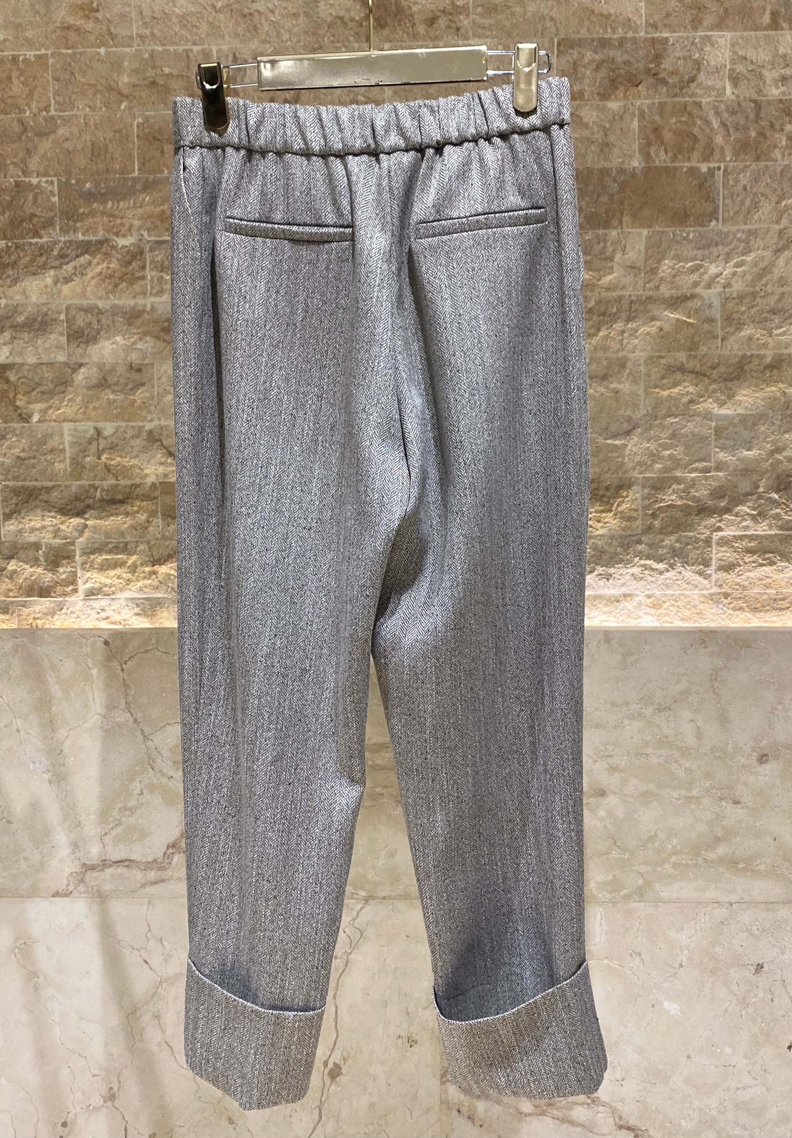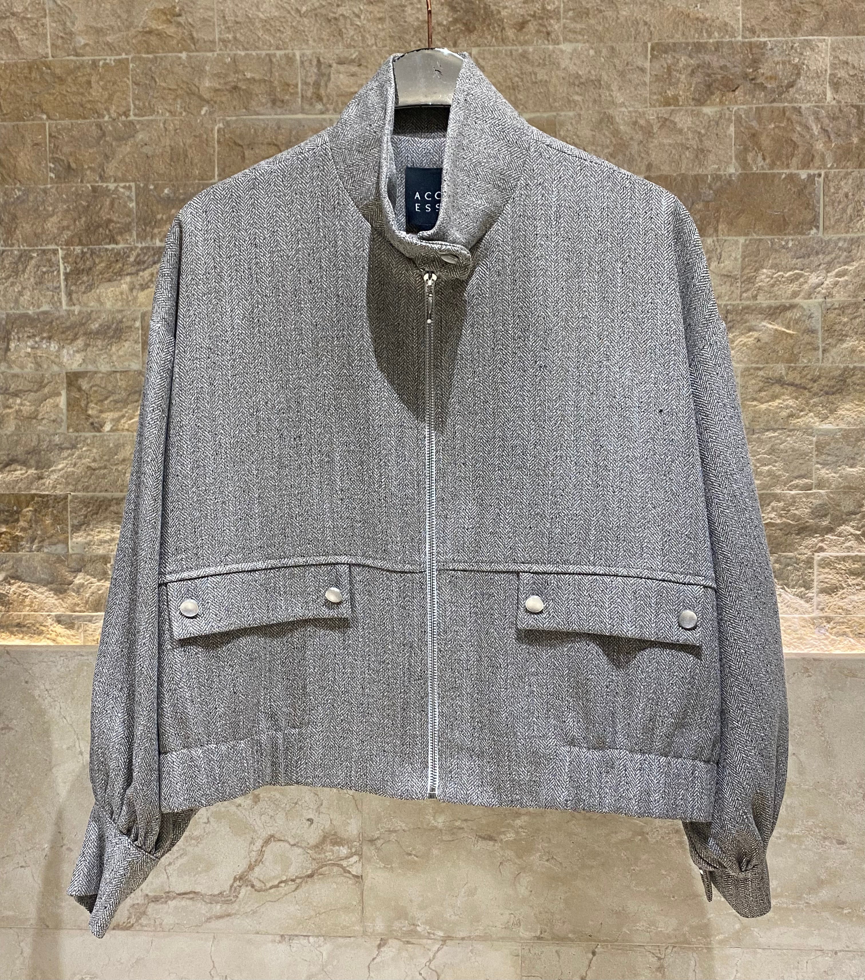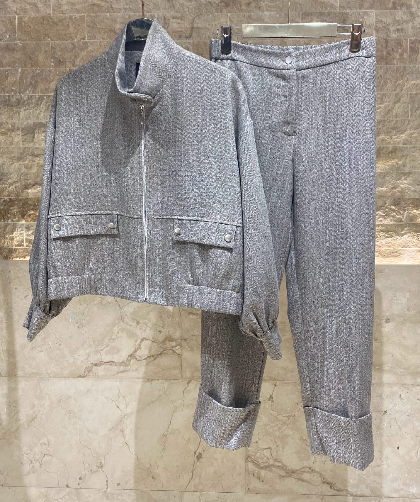 Zippered High Neck with Buttons Herringbone Weave Jacket with front flap pockets, elastic hem long puffed sleeve with buttoned cuff. Buttoned Zippered Herringbone Pants with side pockets, wide turn up hem, elastic back waistband and welt back pockets
