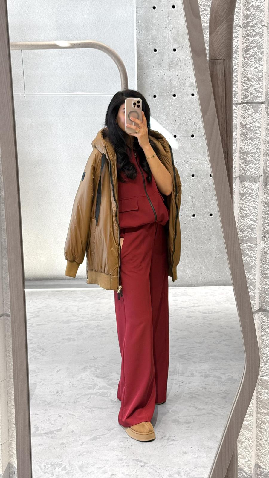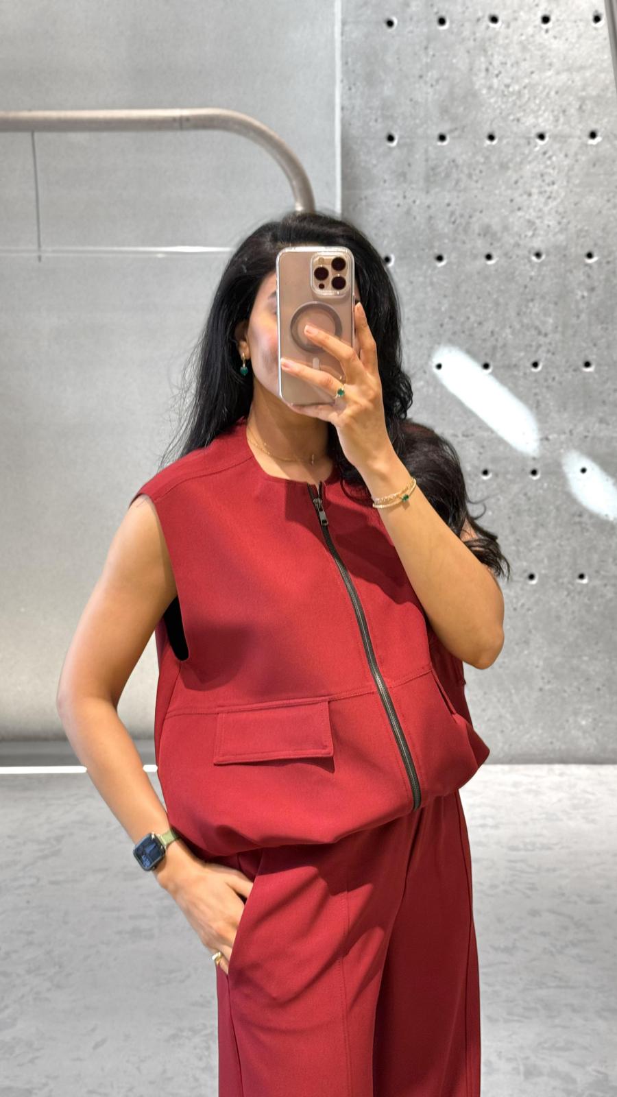 Zippered Round Neckline Sleeveless Jacket with balloon hem and pleated details and flap pockets. Elastic Waistband Wide Leg Pants with decorative stitching, side pockets and back flap pockets detailed