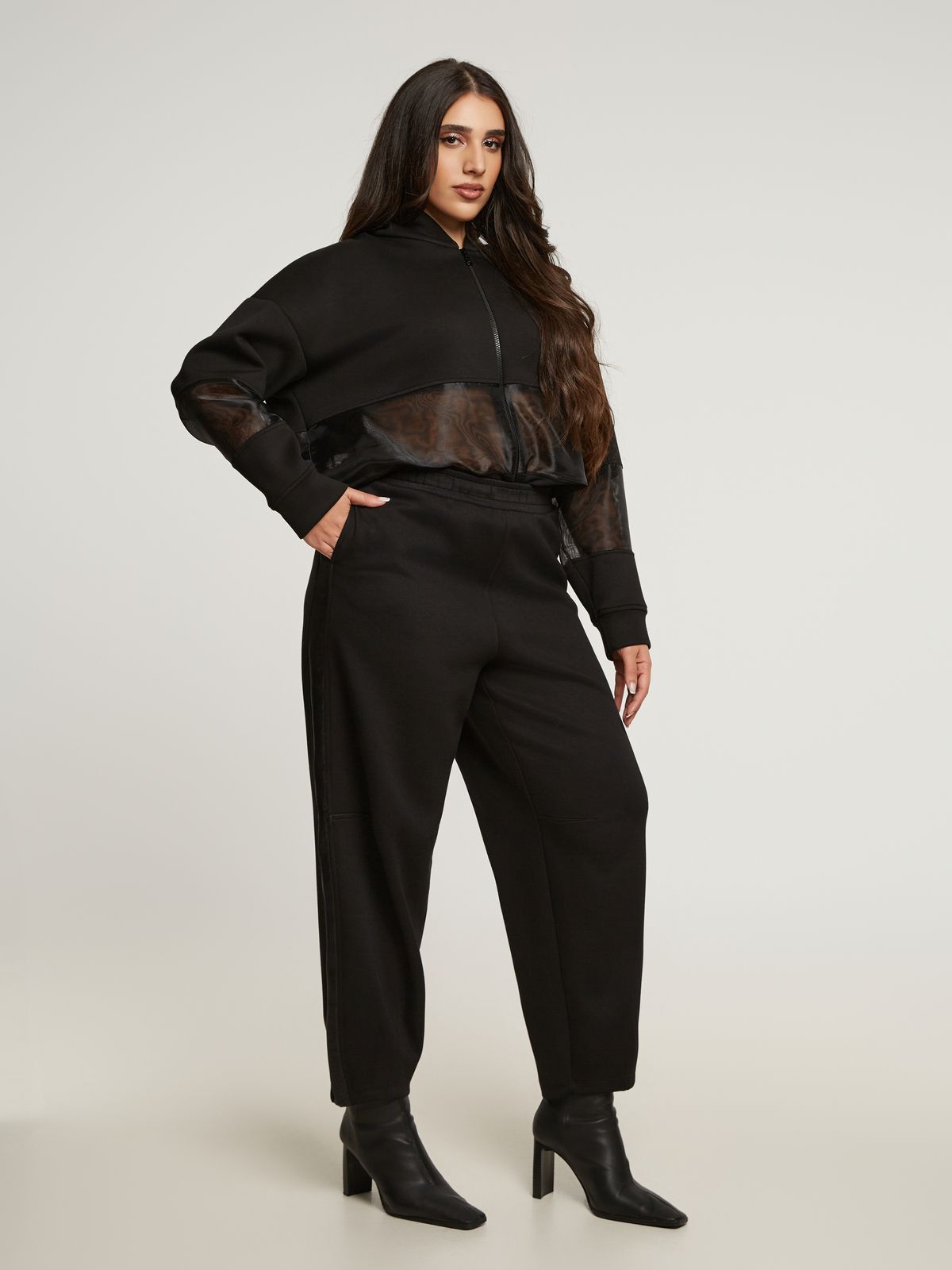 Zippered Hoodie Jacket with sheer organza details, drop shoulder and long sleeve with sheer organza and tight cuff with matching Elastic Waistband High Waist Wide Leg Pants with side pockets, sheer organza side panel details and relaxed hem
