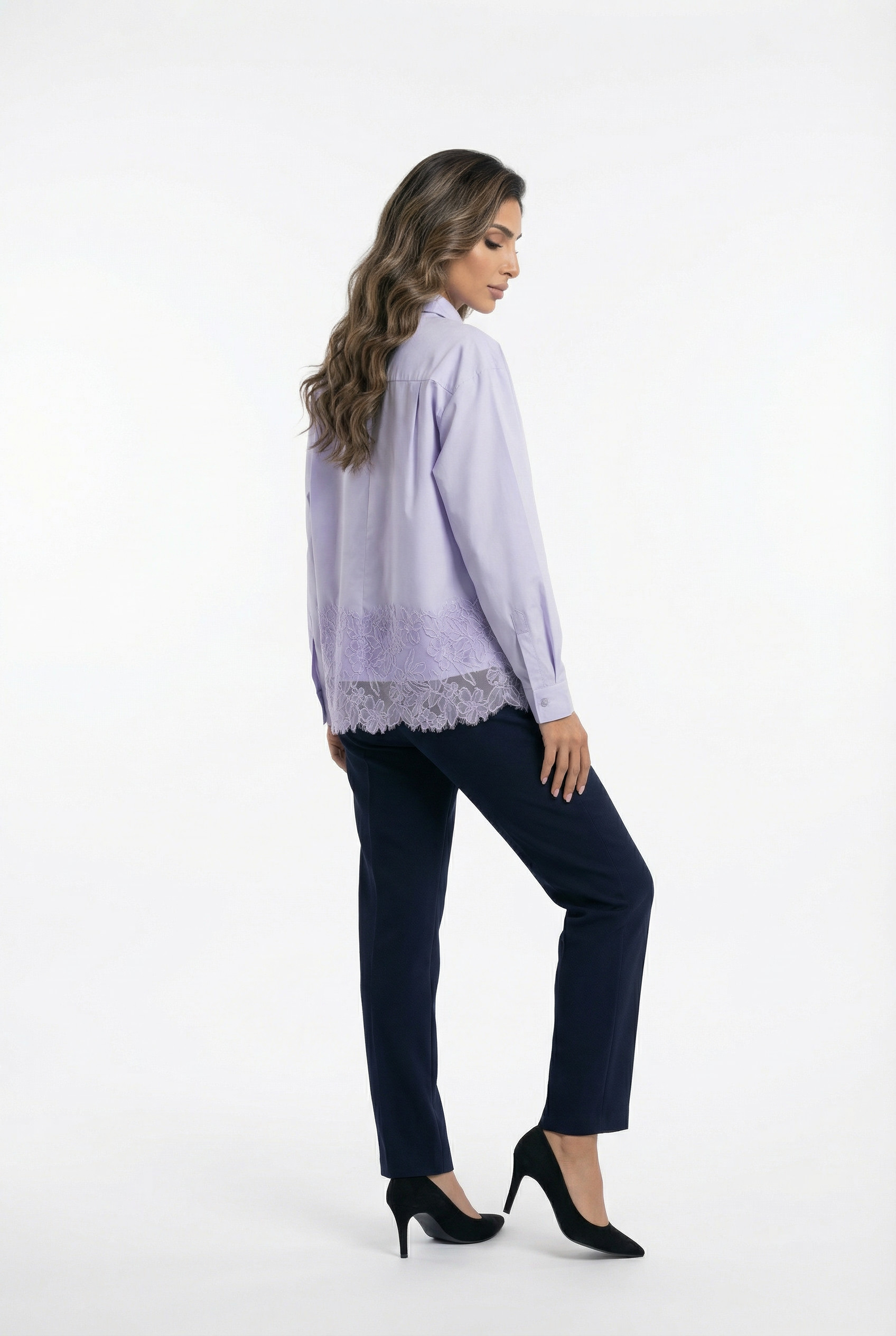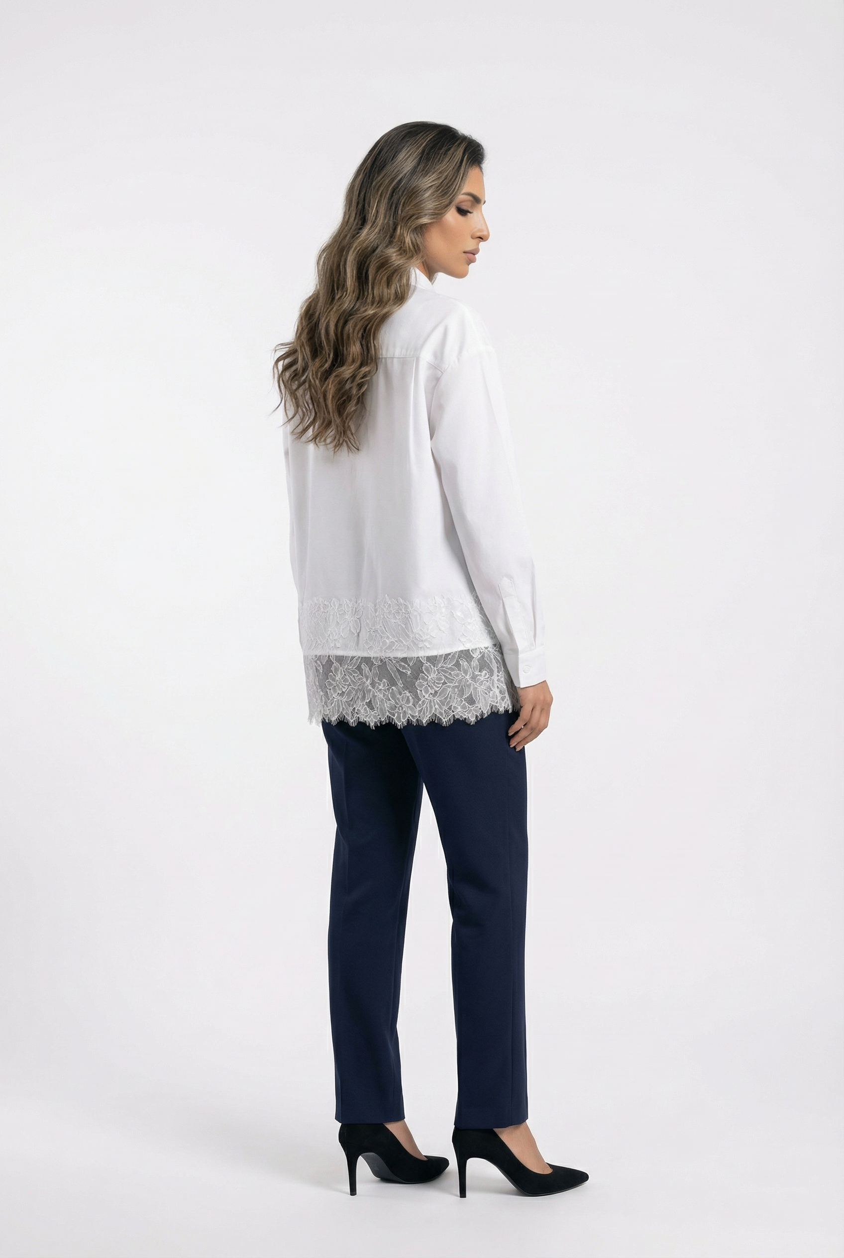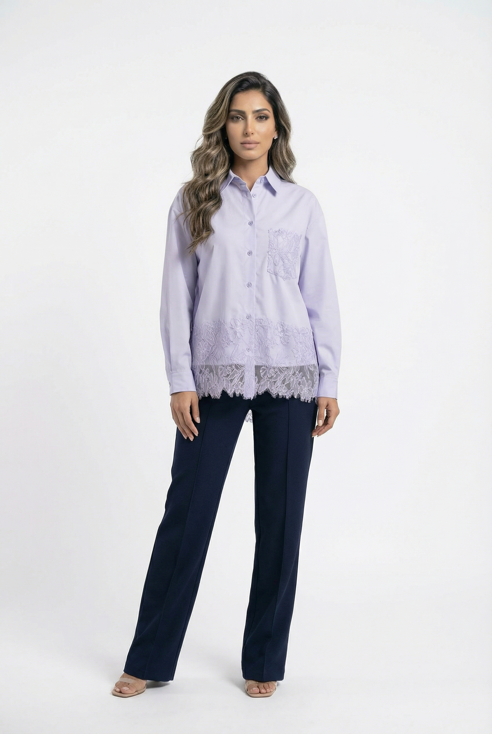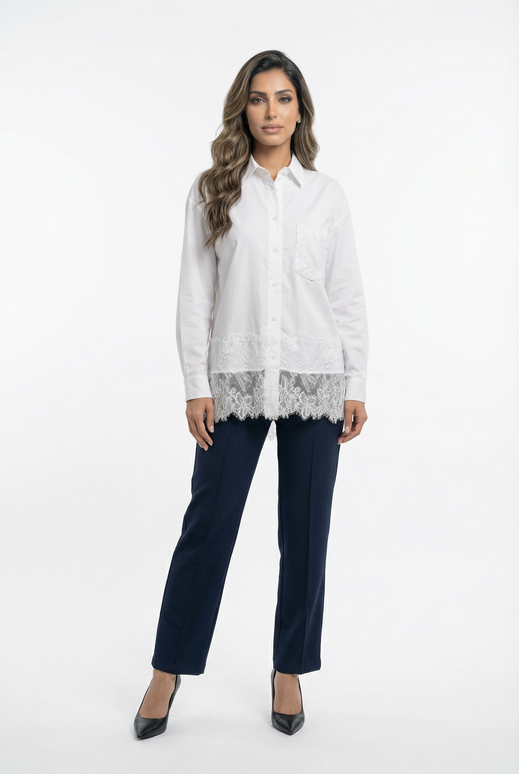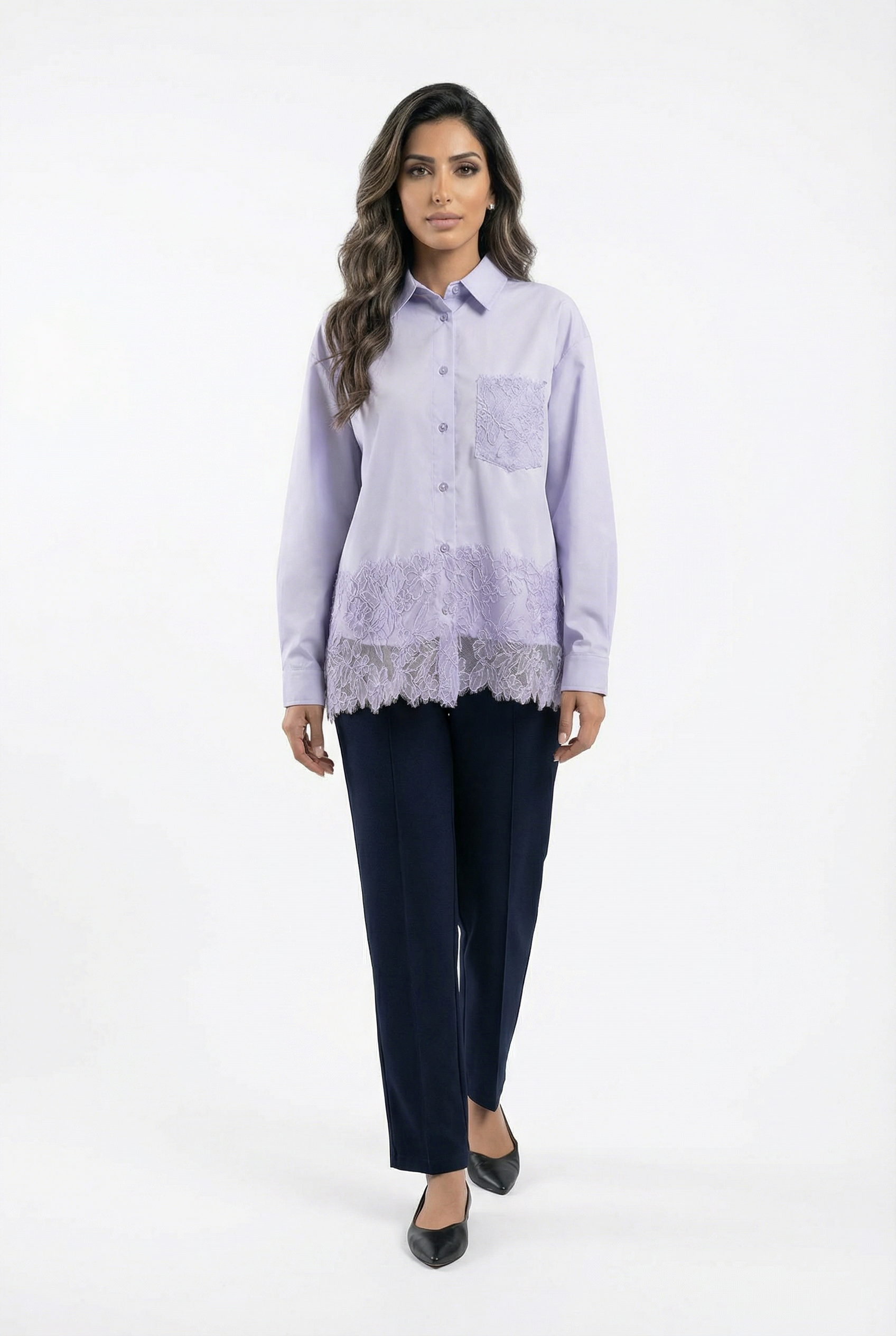 Buttoned Collared Oversized Lace Panel Shirt with lace pocket, lace hem details, drop shoulder and long sleeve with buttoned cuff