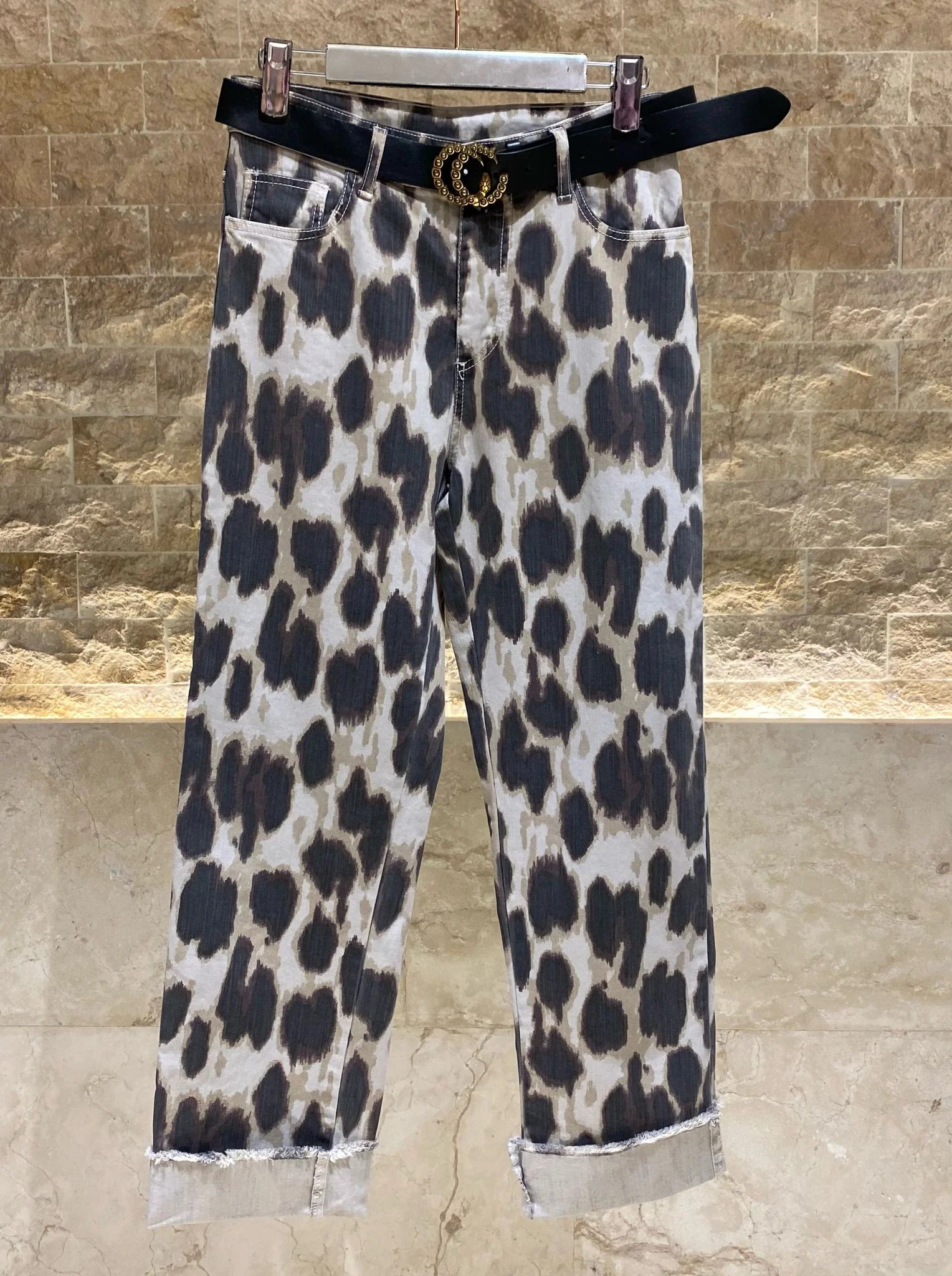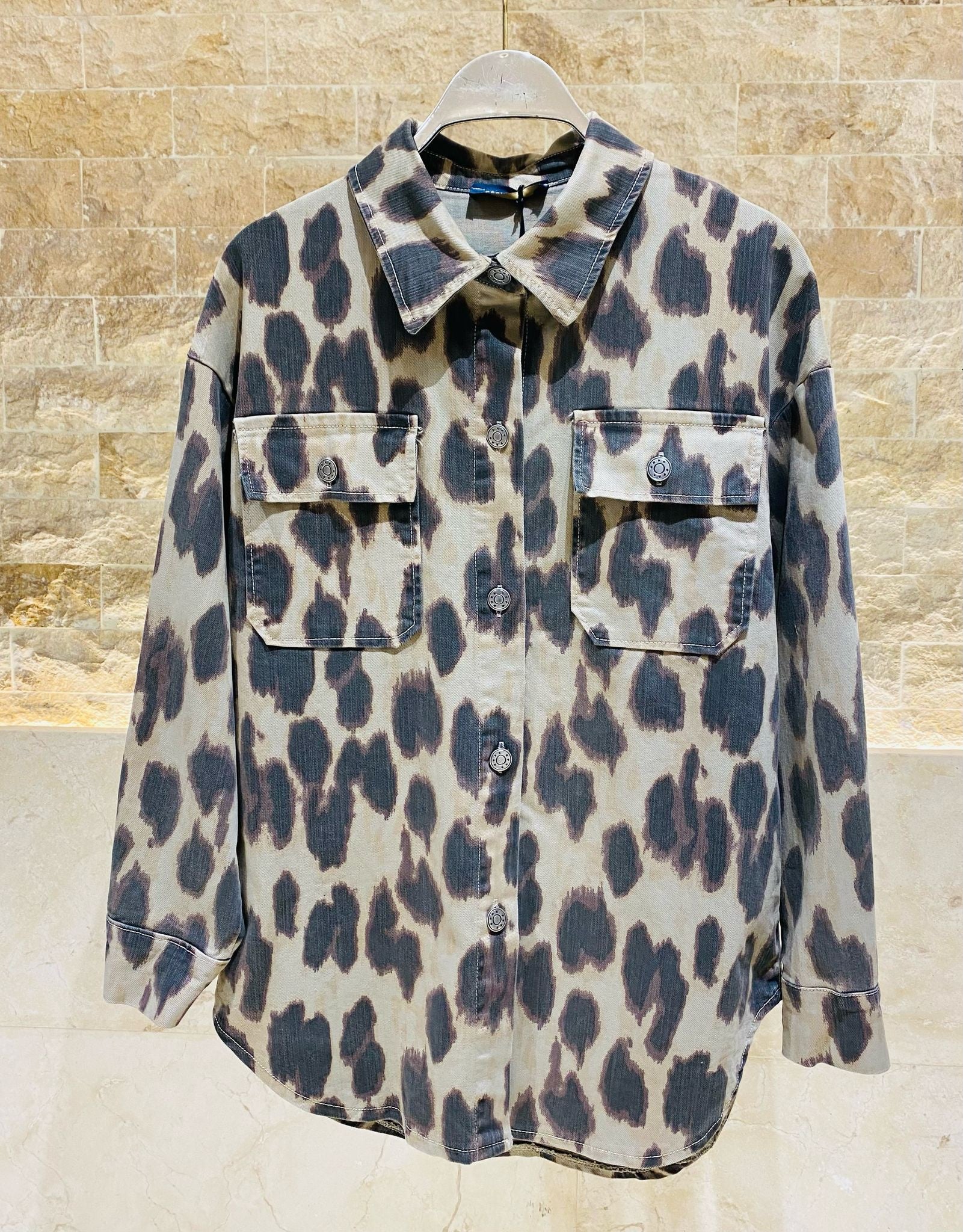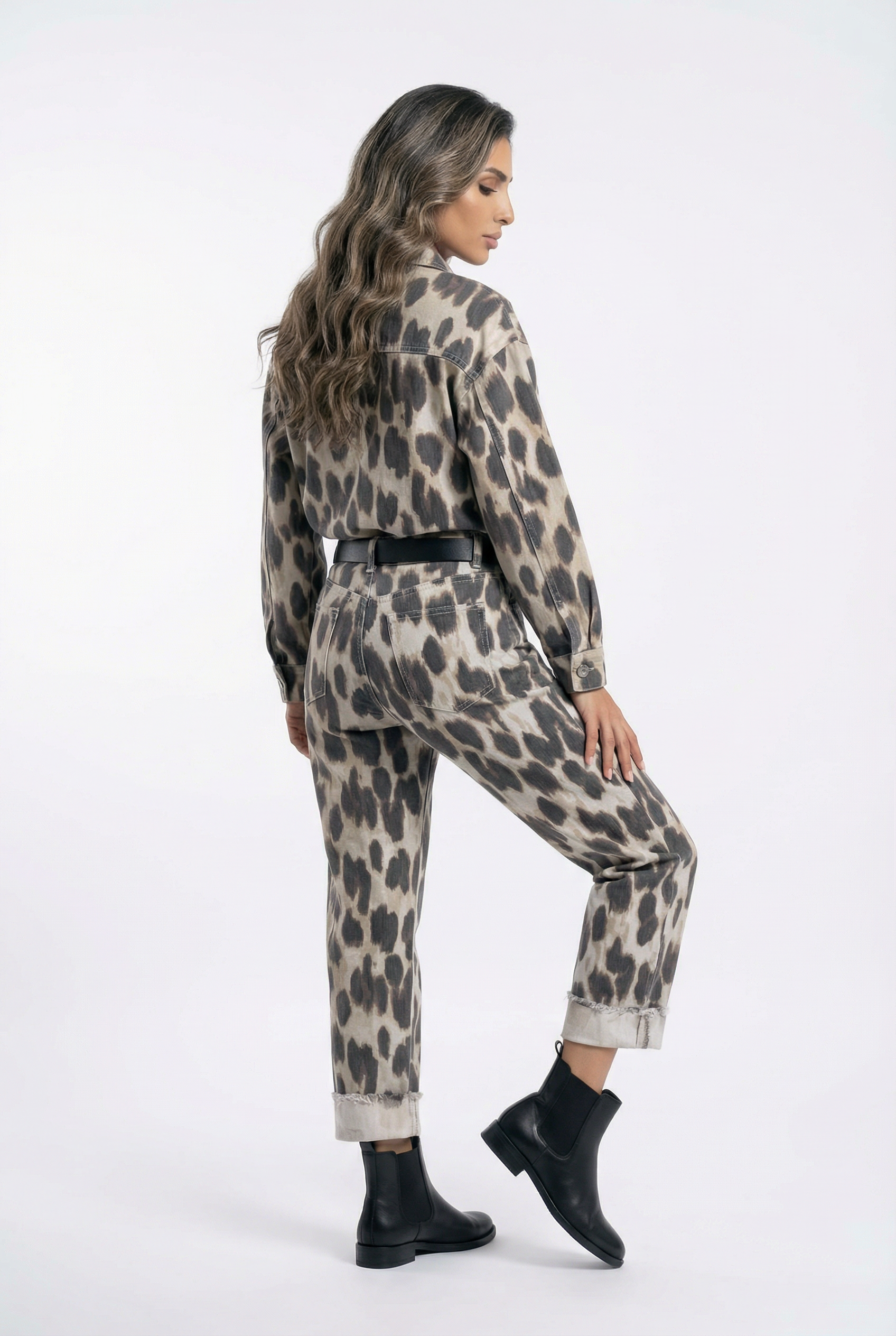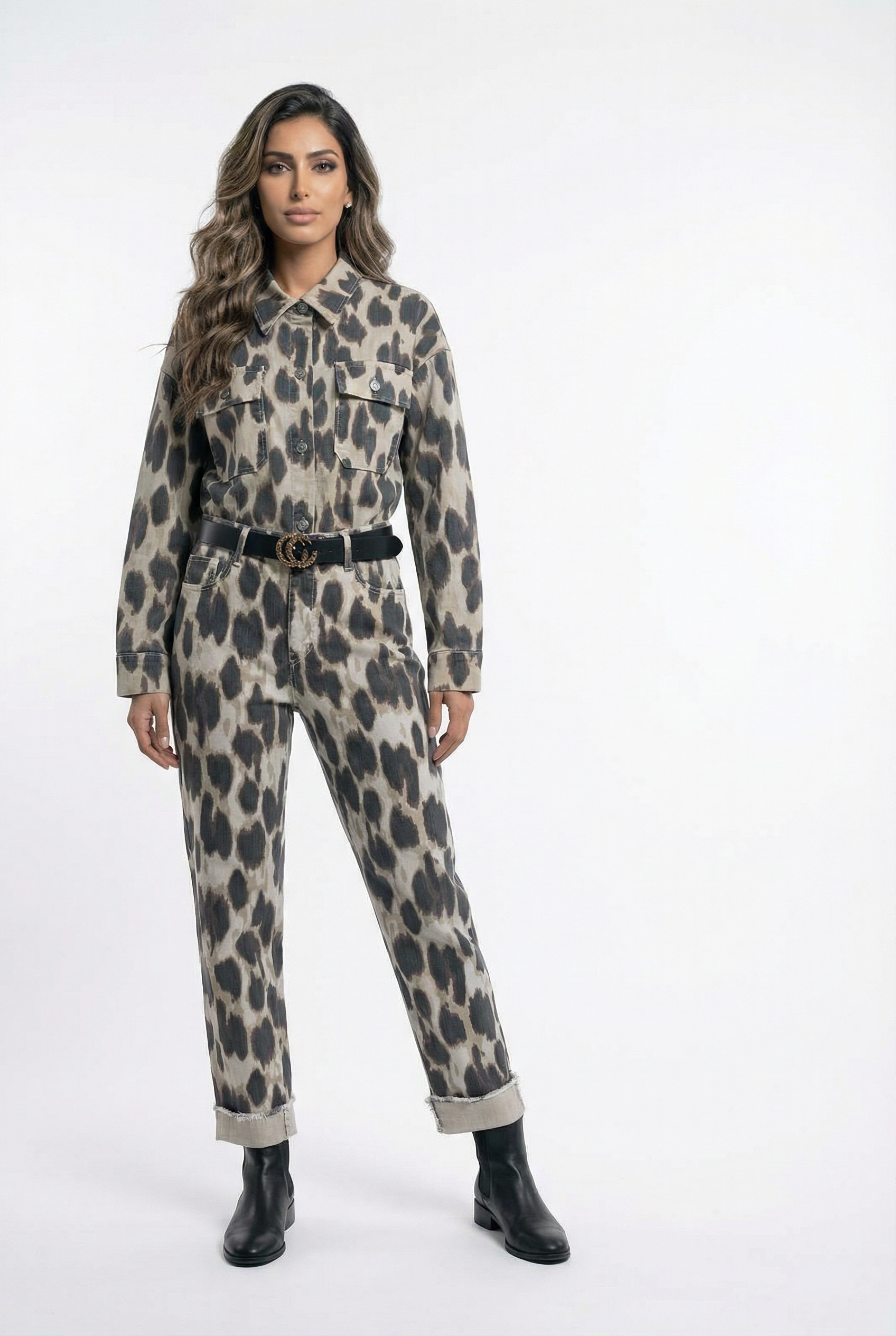 Buttoned Collared Oversized Leopard Printed Shirt with front flap buttoned pockets, drop shoulder and long sleeve with buttoned cuff. Buttoned Zippered Leopard Printed Pants with black belt details and front pockets with back patch pockets detailed and folded hem details