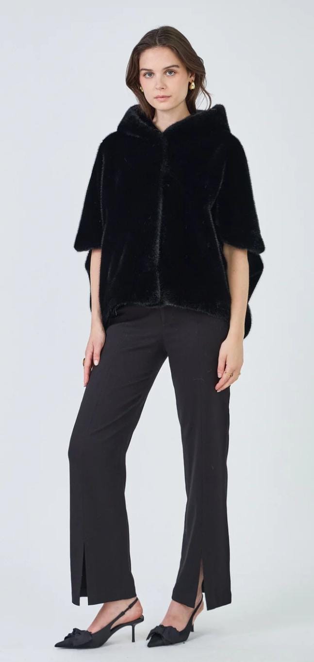 Hook and Eye Integrated Hood Loose Fit Poncho Style Faux Fur Cape Jacket with slip side pocket and 3/4 length sleeve