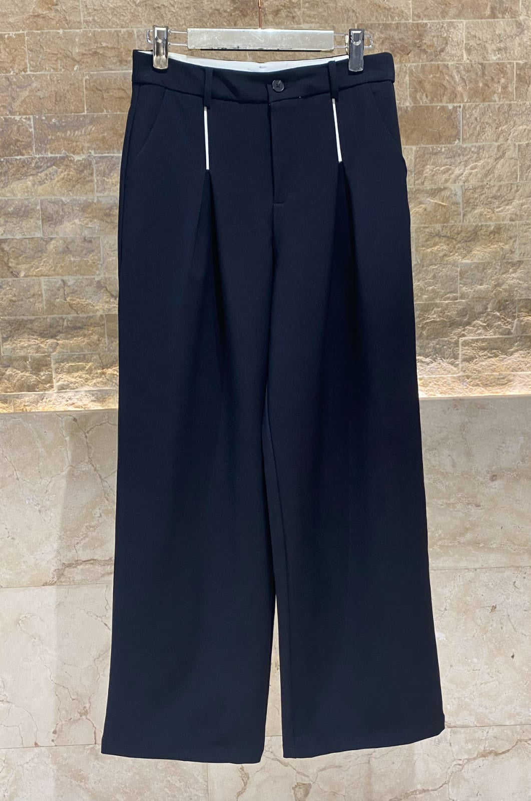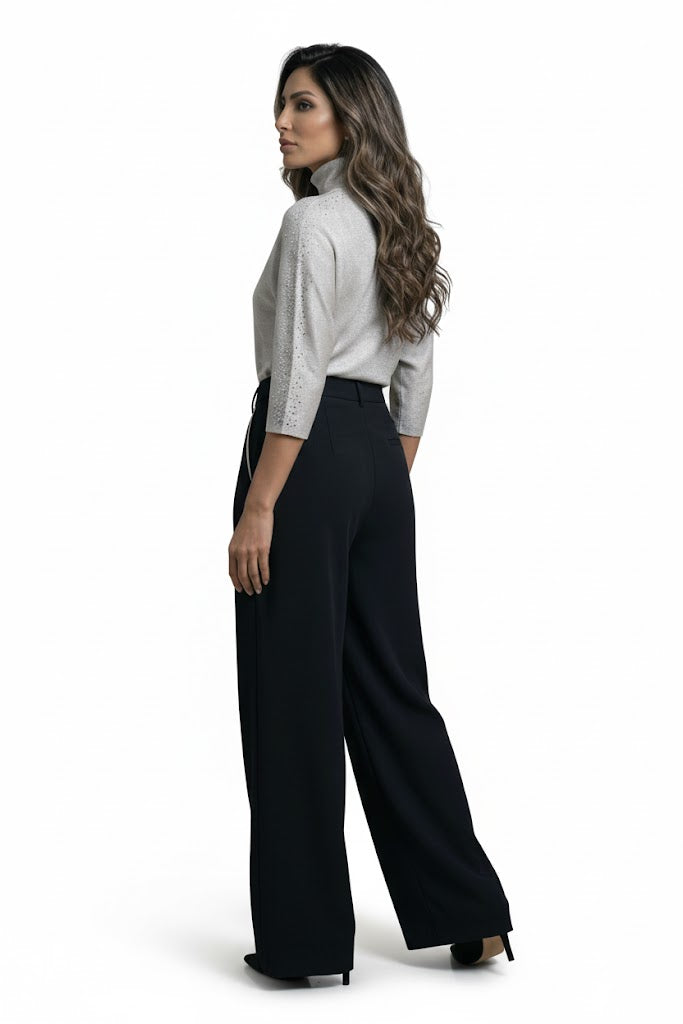Buttoned Zippered Wide Leg Tailored Crepe Pants with front pleats, side pockets, belt loop and welt back details