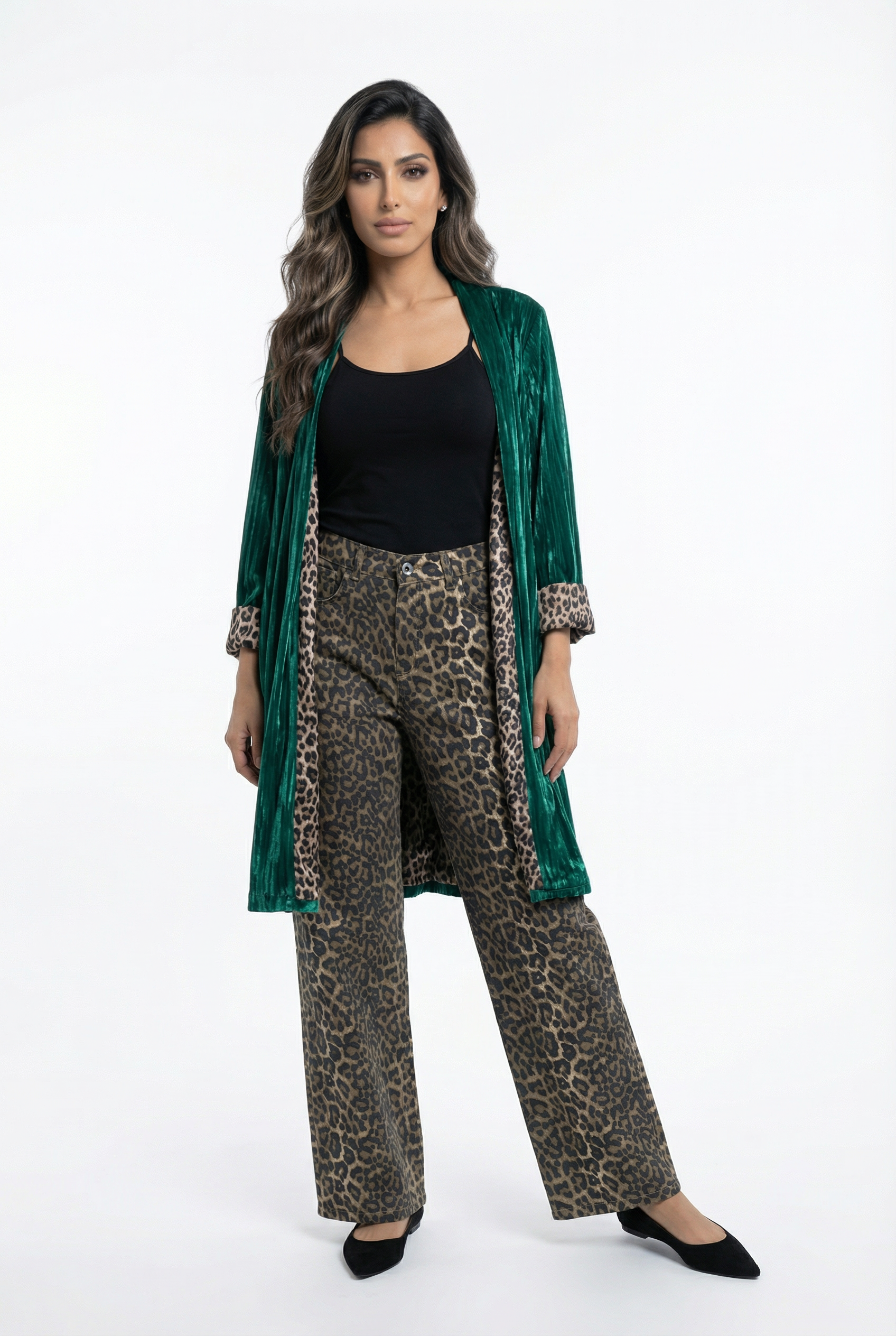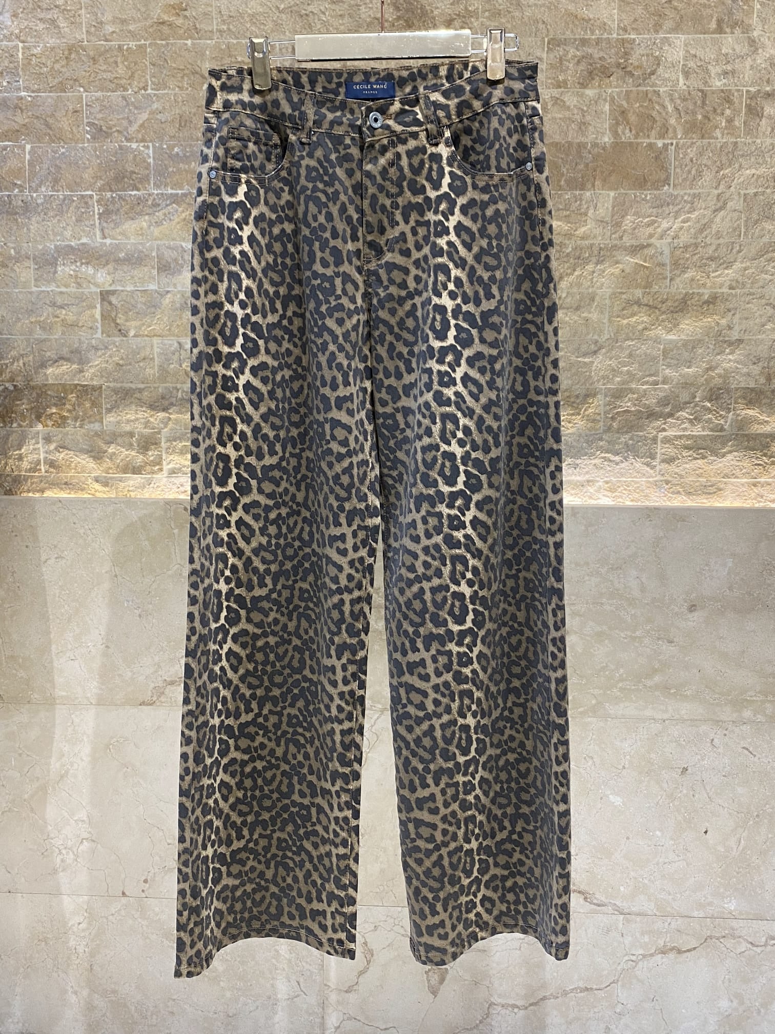 Buttoned Zippered Leopard Wide Leg Pants with side pockets and back patch pocket details
