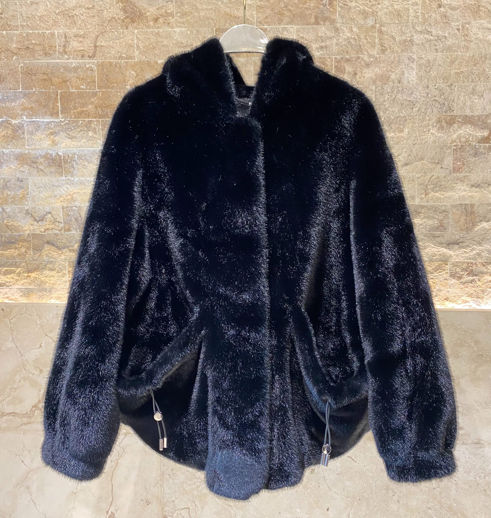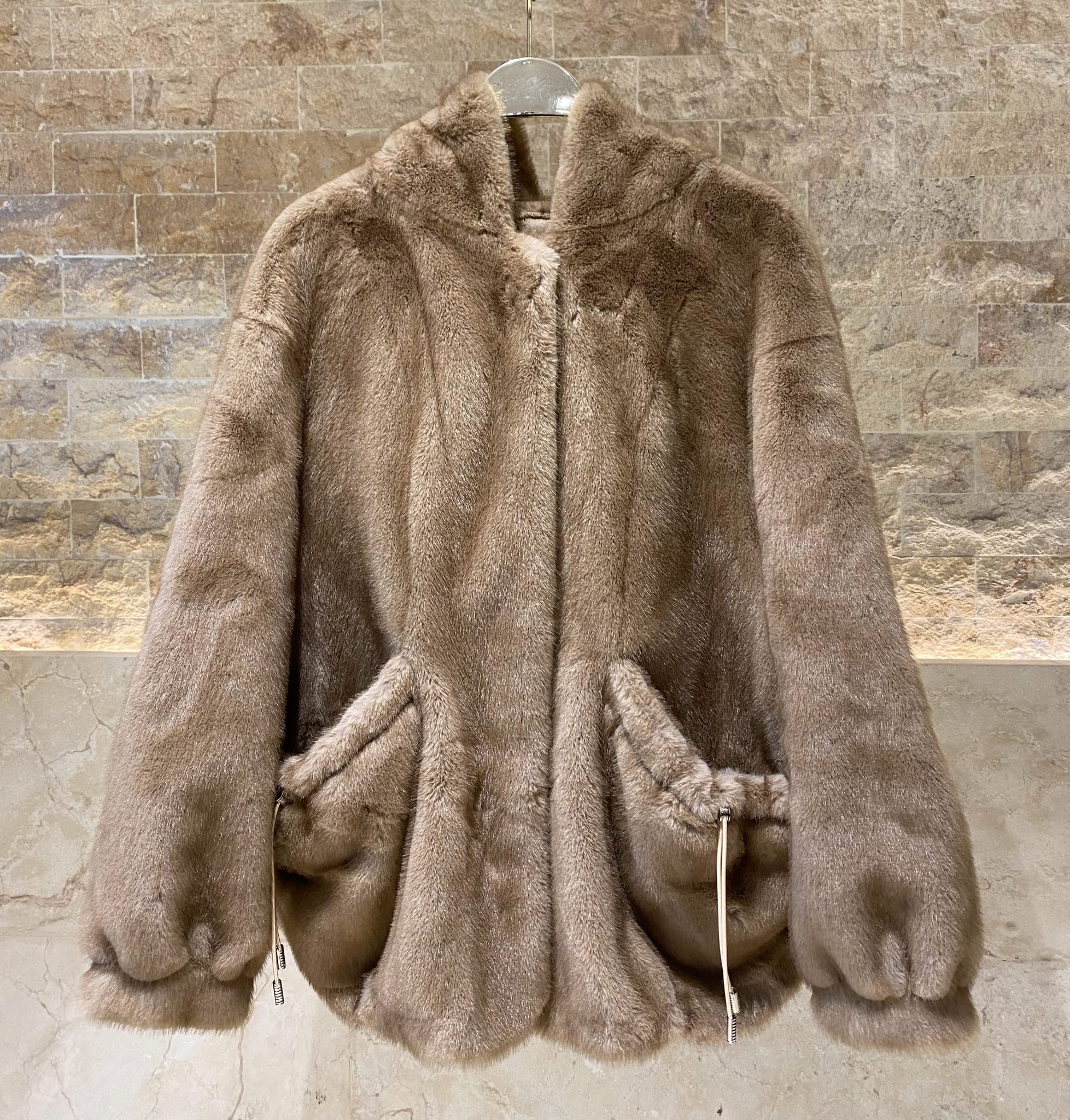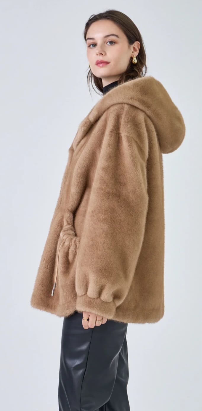 Invisible Hook Closure Oversized Faux Fur Hooded Coat with front pocket with adjustable drawstring and long wide sleeve with tight cuff