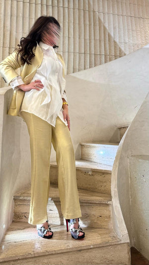 Notched Lapel Metallic Jacket with front closure with Vilagallo scissors button details, exclusive vilagallo lining, patch pockets, padded shoulder and long sleeve with three special buttons