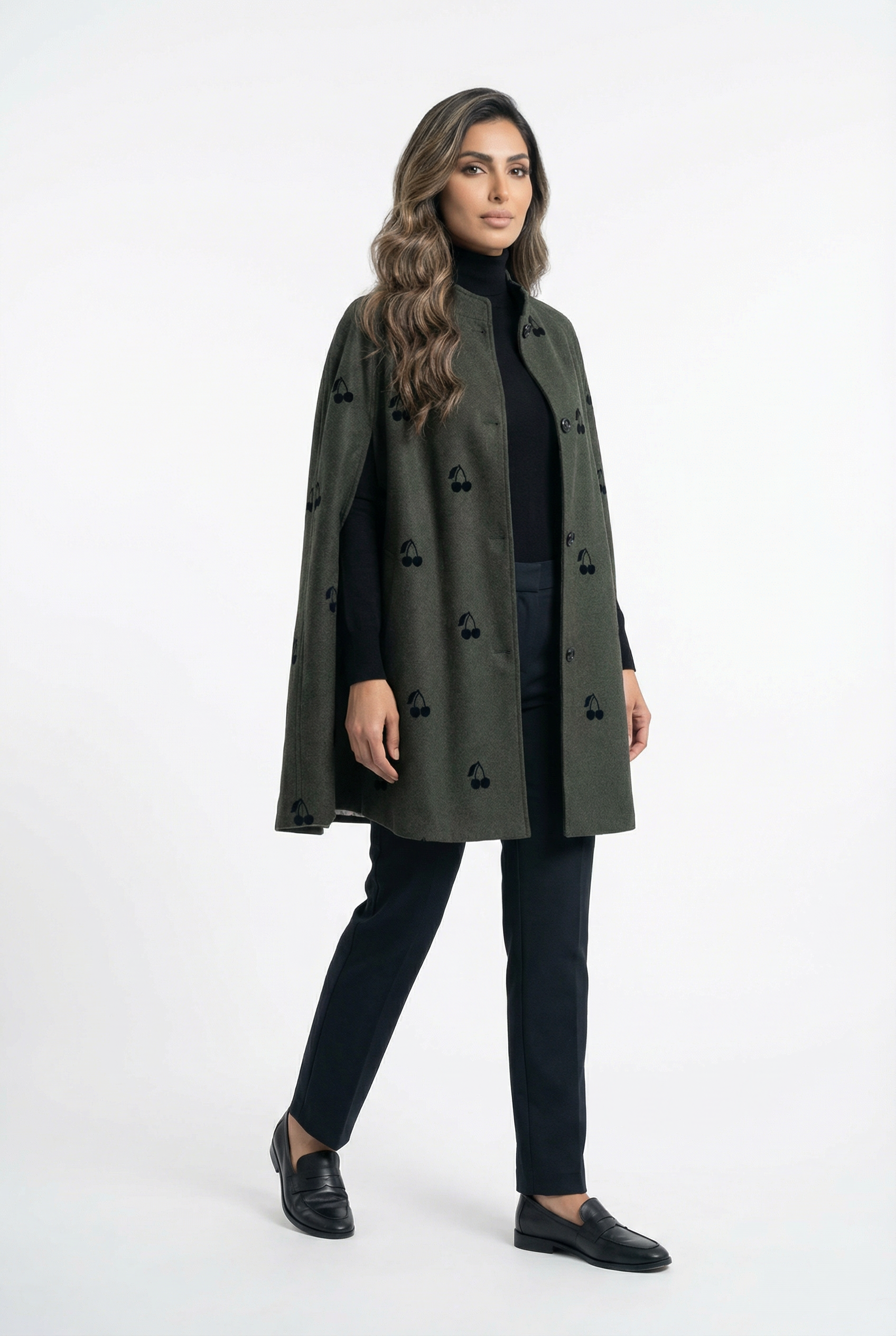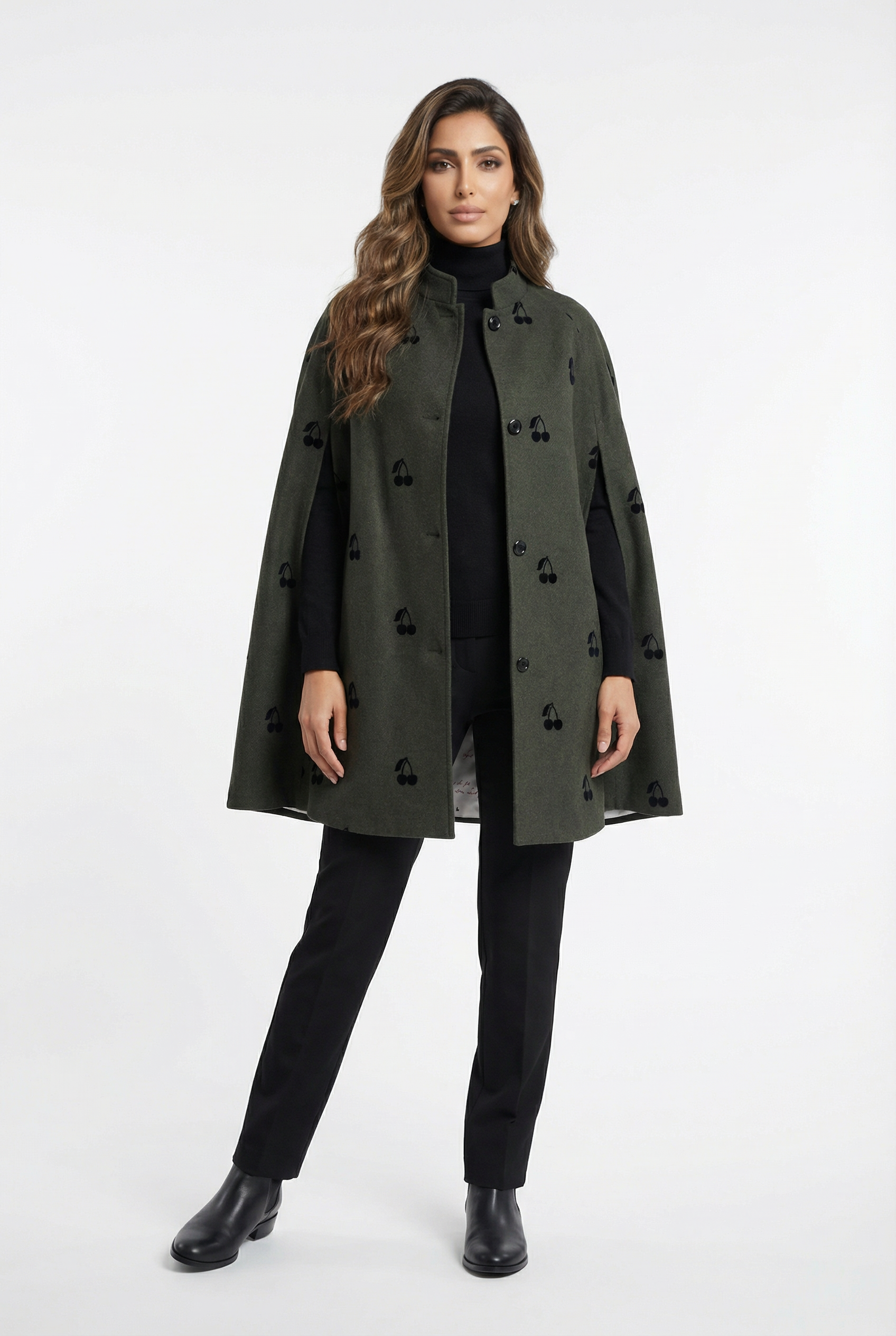 High Round Collared Buttoned Wool Blend Cape Coat with lined interior, black cherry embroidery, welt pockets and side slits for the arms