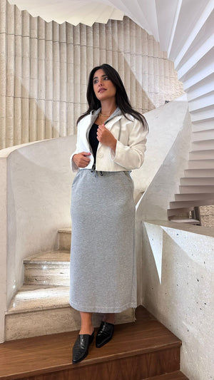 Lapel Collared Buttoned Cropped Jacket with detachable zippered grey hoodie and with drawstring details, decorative welt front pockets and long sleeve