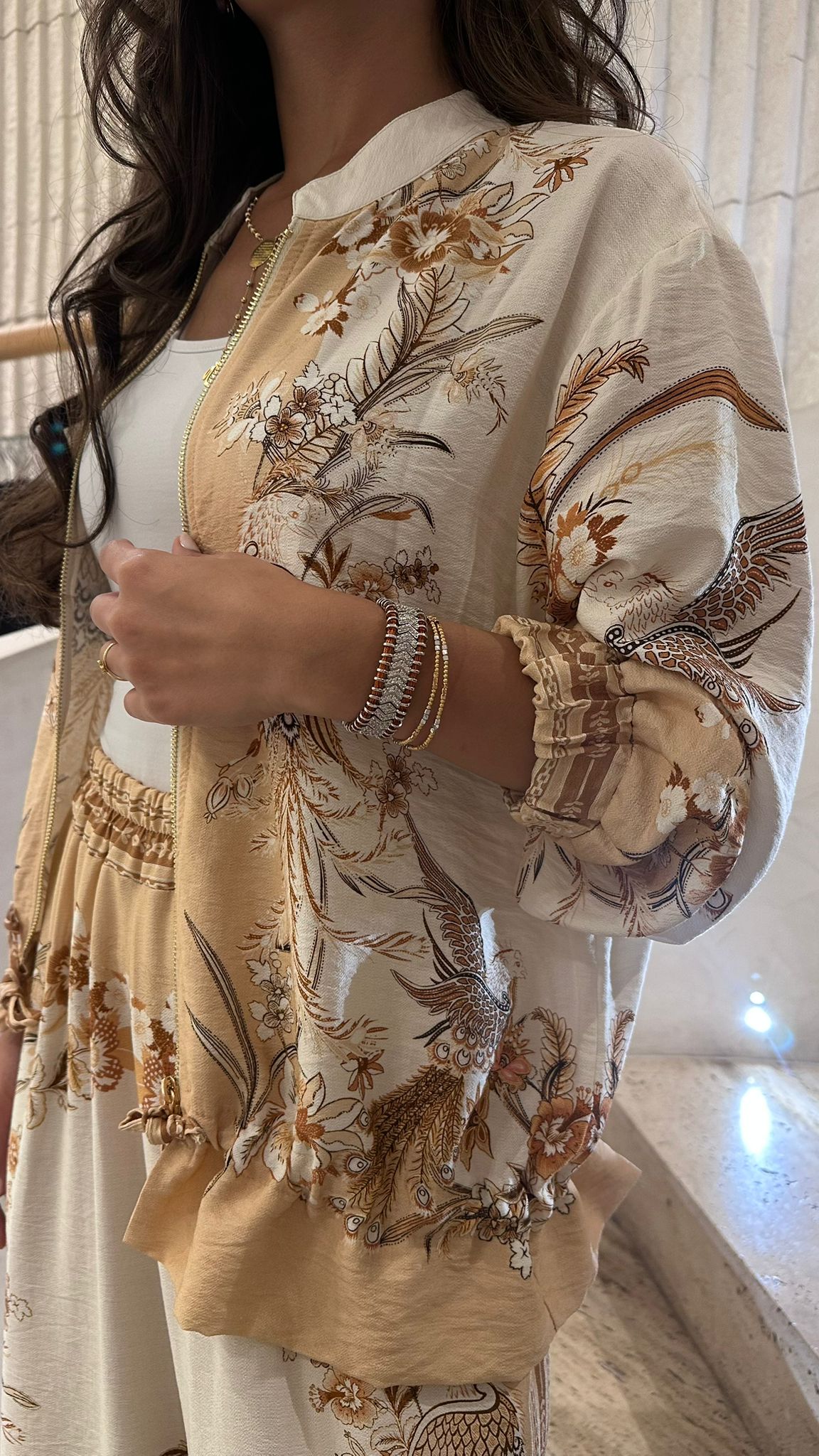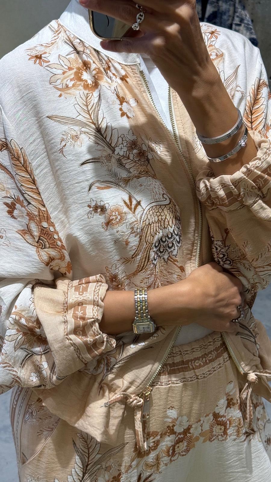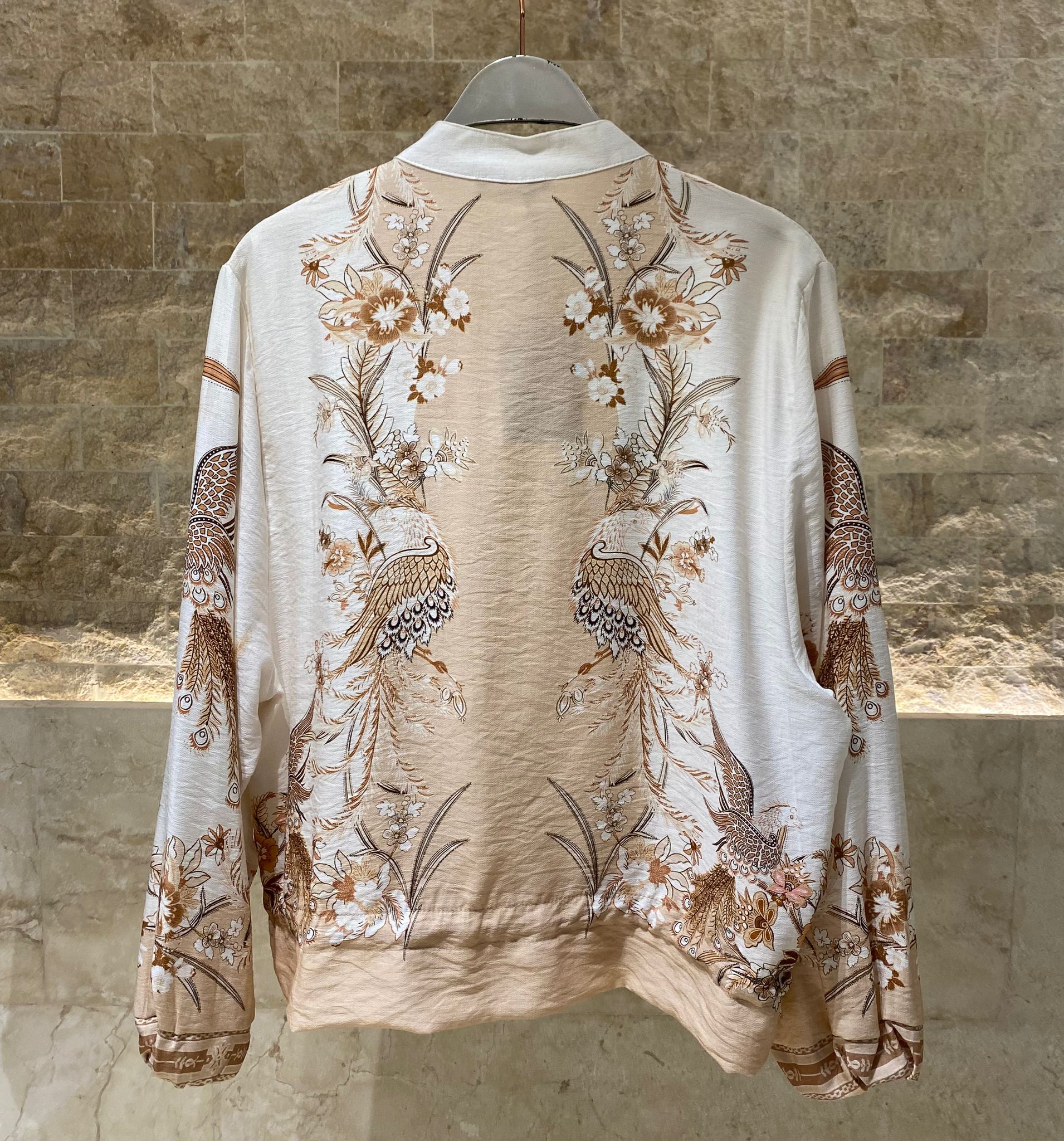 Zippered Round Neck Bomber Style Peacocks Floral Print Jacket with drawstring waist details and long sleeves with wide elastic cuff.