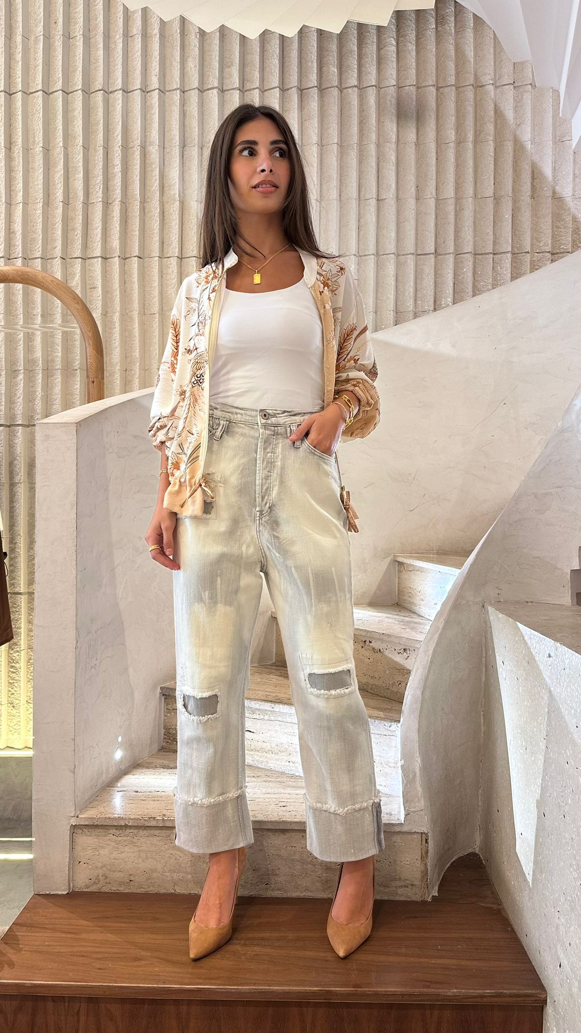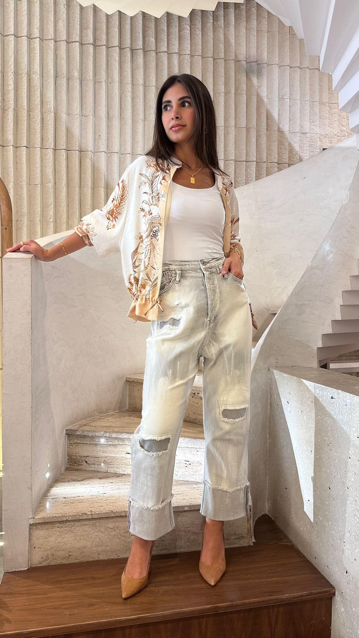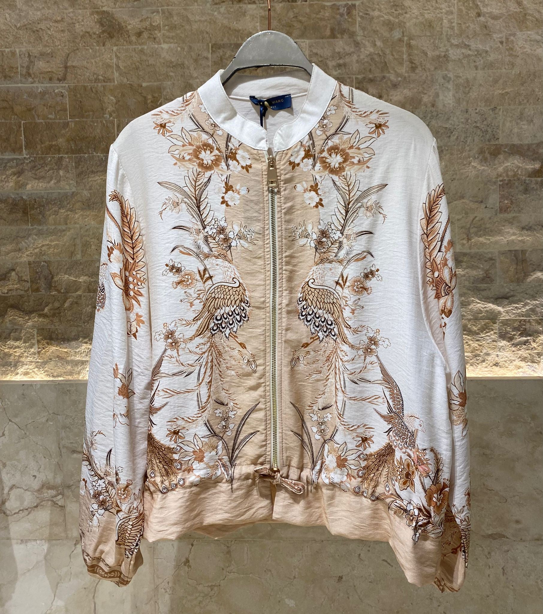 Zippered Round Neck Bomber Style Peacocks Floral Print Jacket with drawstring waist details and long sleeves with wide elastic cuff.